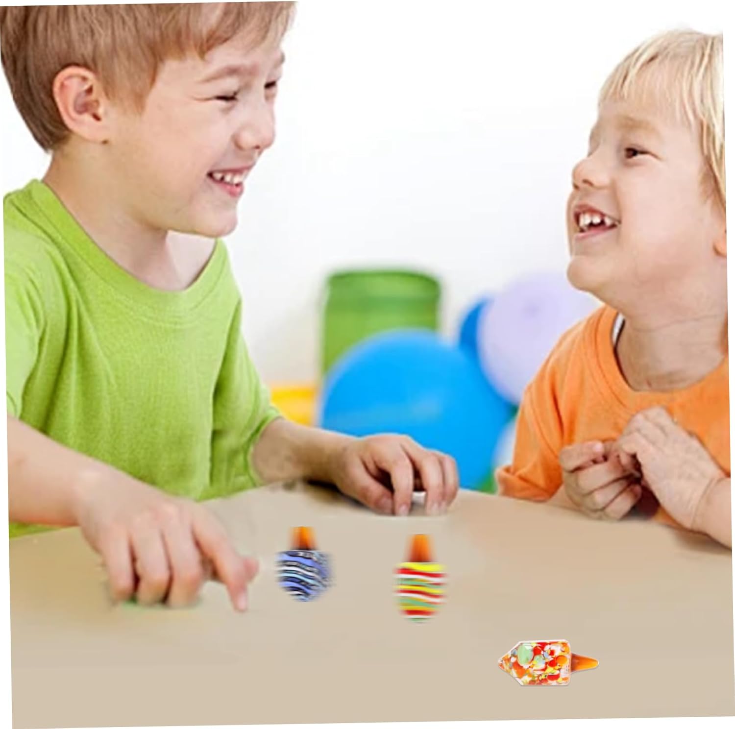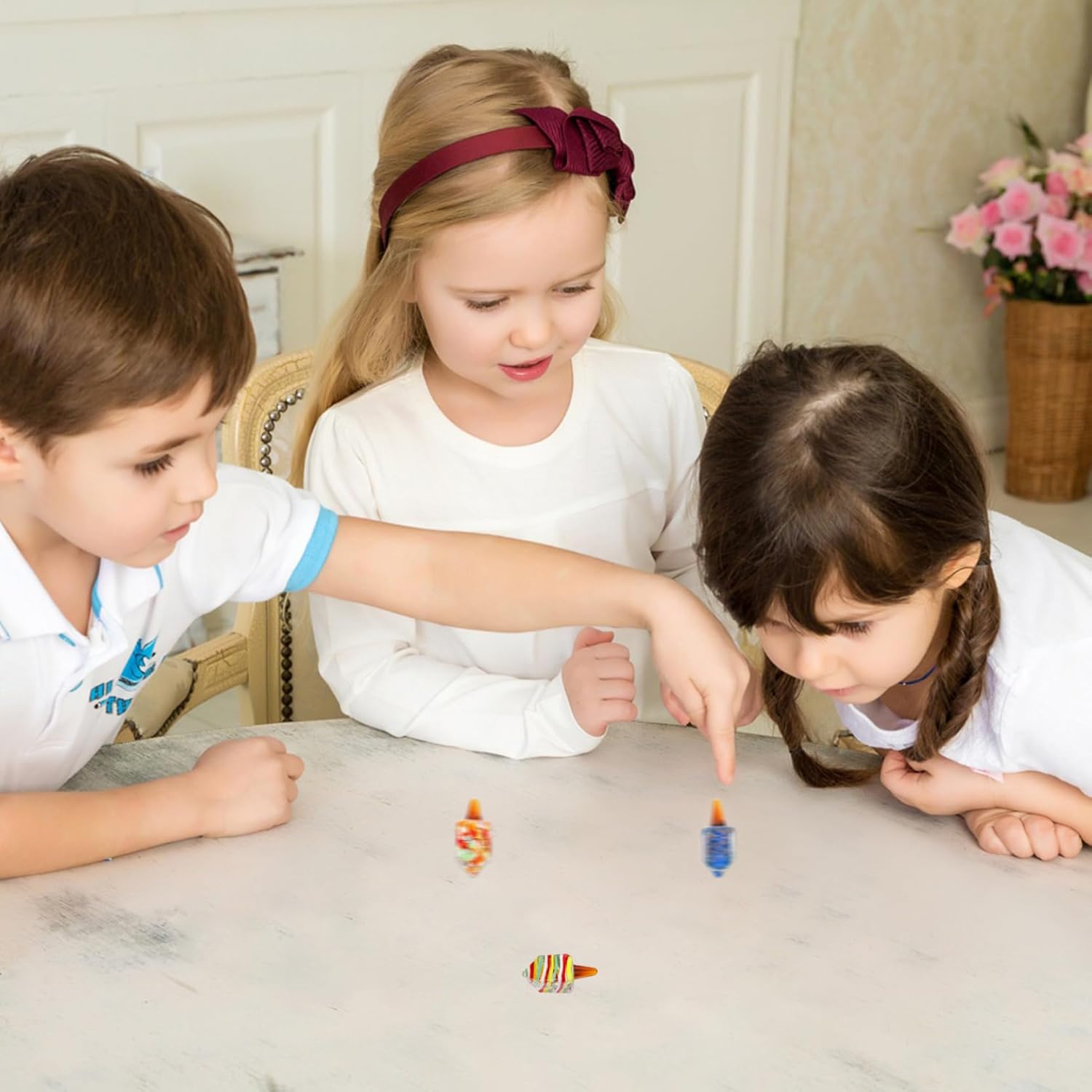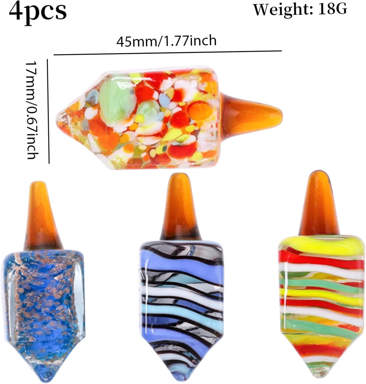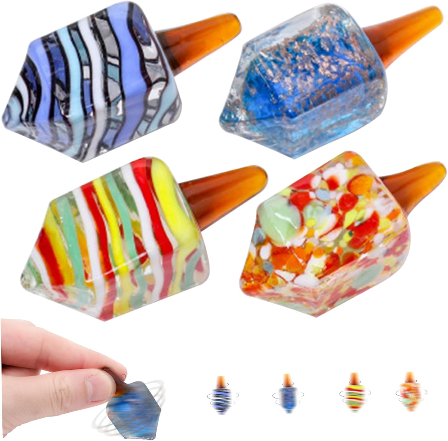 Compatti e portatili: misurando circa 4,5x1,7 cm e pesando solo 18 g, questi dreidel sono comodamente piccoli e leggeri..Questo li rende facili da trasportare, permettendoti di portare lo spirito festivo con te ovunque tu vada..Inoltre, le loro dimensioni compatte garantiscono uno stoccaggio senza problemi quando non vengono utilizzati, rendendoli una scelta pratica per chi ha spazio limitato. Materiale di qualità e pregevole fattura: realizzati in vetro di qualità e lucidati alla perfezione, questi dreidel hanno una superficie liscia..Il materiale del vetro non offre solo un'estetica visivamente accattivante ma anche una piacevole esperienza tattile..I dreidel sentono a proprio agio nelle tue mani, garantendo un'esperienza di spinning sicura e divertente senza alcun rischio di lesioni. Varietà di design: ogni confezione include quattro dreidel, ciascuno con una combinazione di colori unica..Questa abbondanza di opzioni consente progetti di decorazioni più diversificati e creativi..Che tu preferisca un look coordinato o un mix di colori, questi dreidels hanno infinite possibilità per adattarsi al tuo stile e alle tue preferenze personali. Facile e divertente da girare: far girare il dreidel è un'attività semplice e divertente..Con un semplice tocco del dito, il dreidel ruota senza sforzo, aggiungendo un tocco di eccitazione alle tue celebrazioni di Hanukkah..Il movimento rotatorio è fluido e senza sforzo, consentendo a tutti di partecipare e godersi il gioco. Design raffinato e colori vivaci: il dreidel è una decorazione colorata e splendidamente realizzata, che lo rende una scelta eccellente per le festività di Hanukkah, oltre a un delizioso ornamento e un'opzione..Il suo design intricato e la cura dei dettagli aggiungono un tocco di eleganza a qualsiasi ambiente, esaltando l'atmosfera festosa.