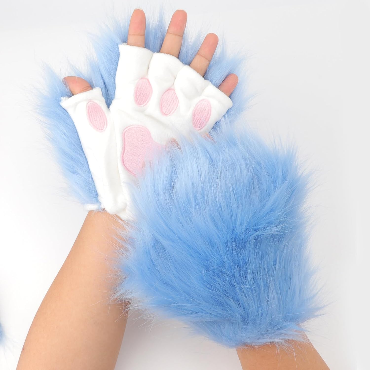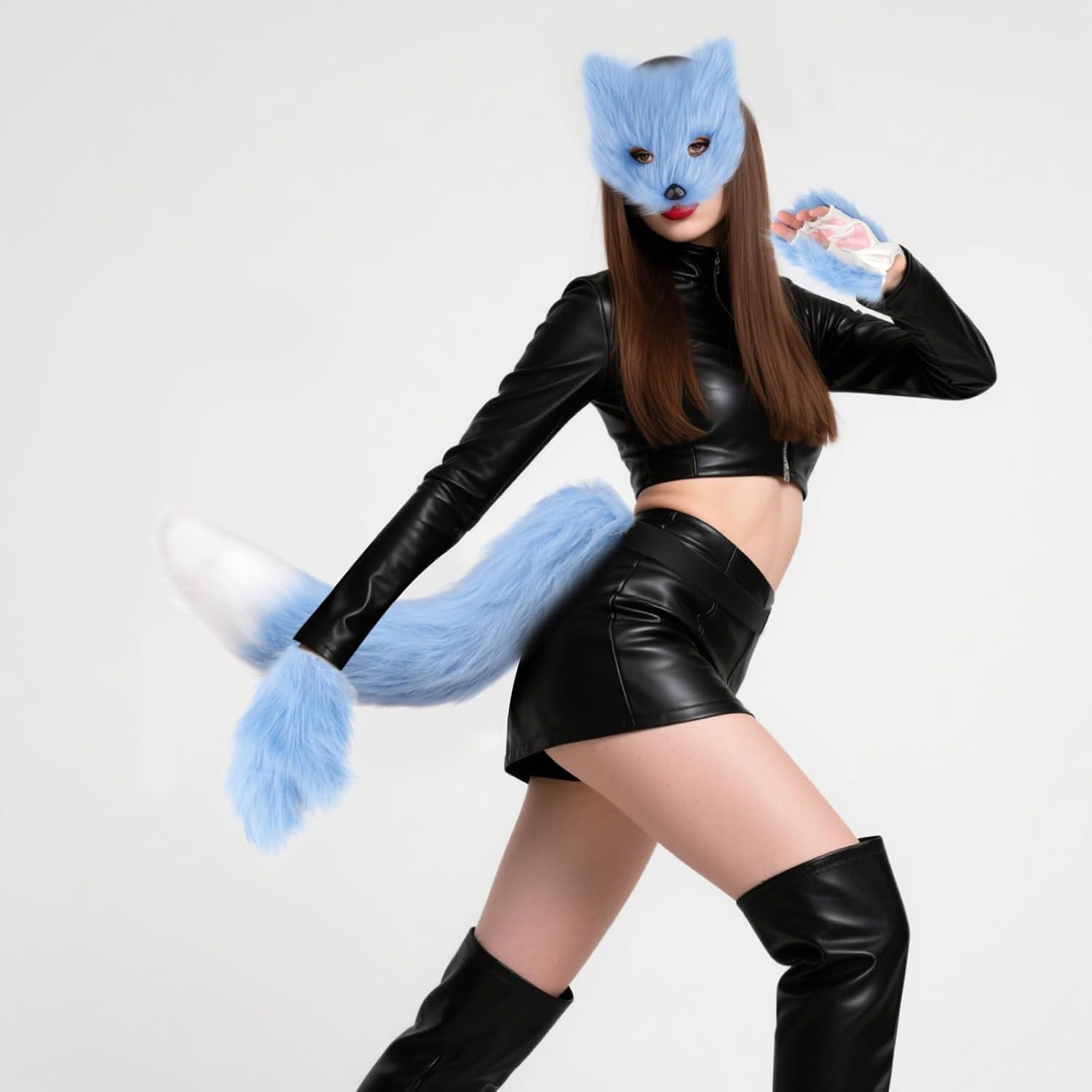DRESHOW Pelliccia Sintetica Coda di Volpe Maschera Peluche Gatto Lupo Soffice Costume da Festa di Halloween Guanti Zampa di Gatto Set Cosplay per Donna