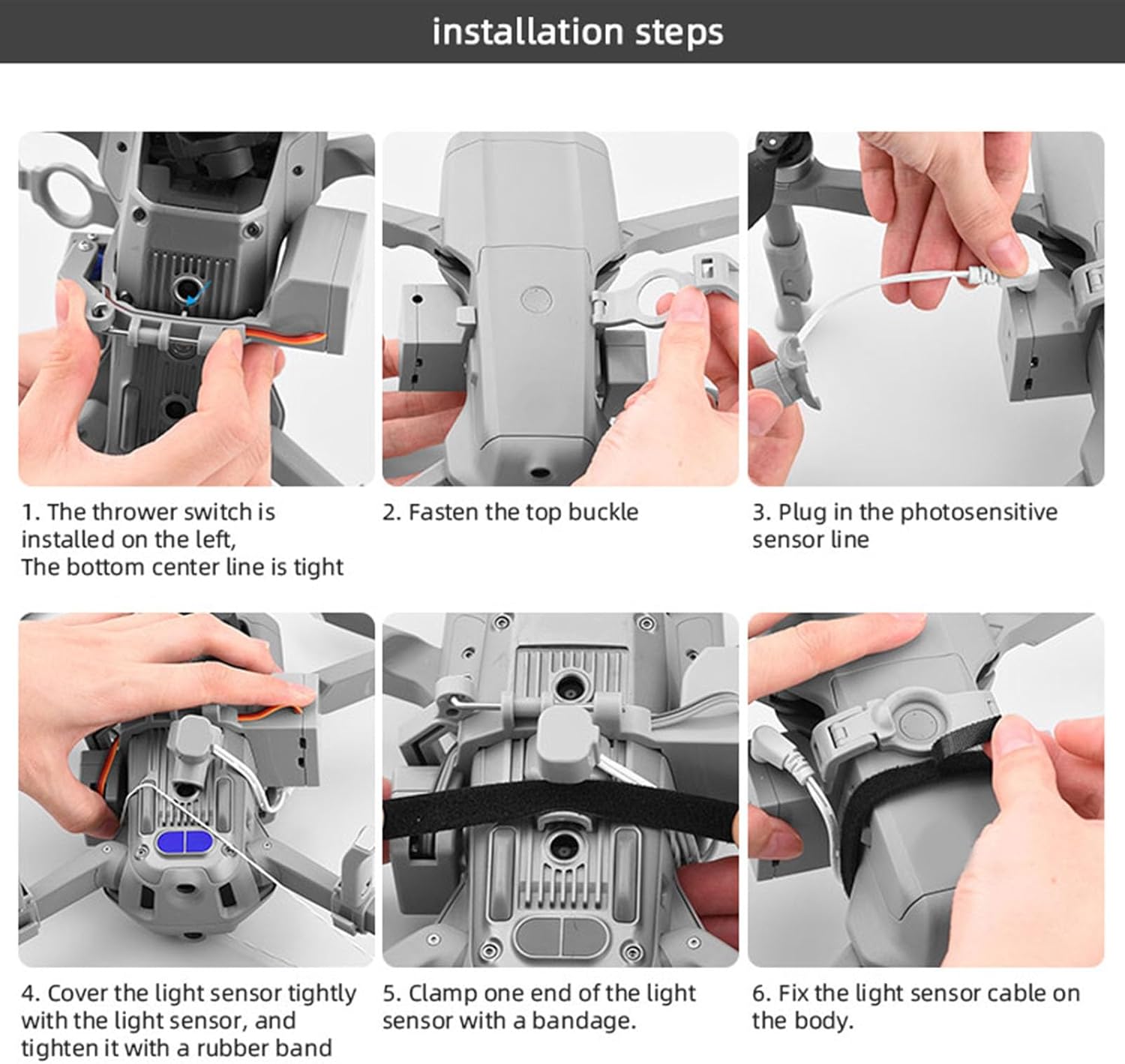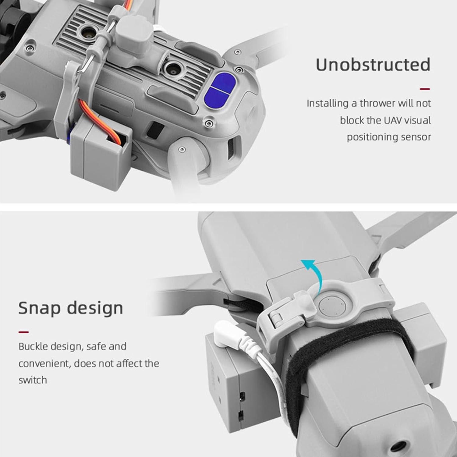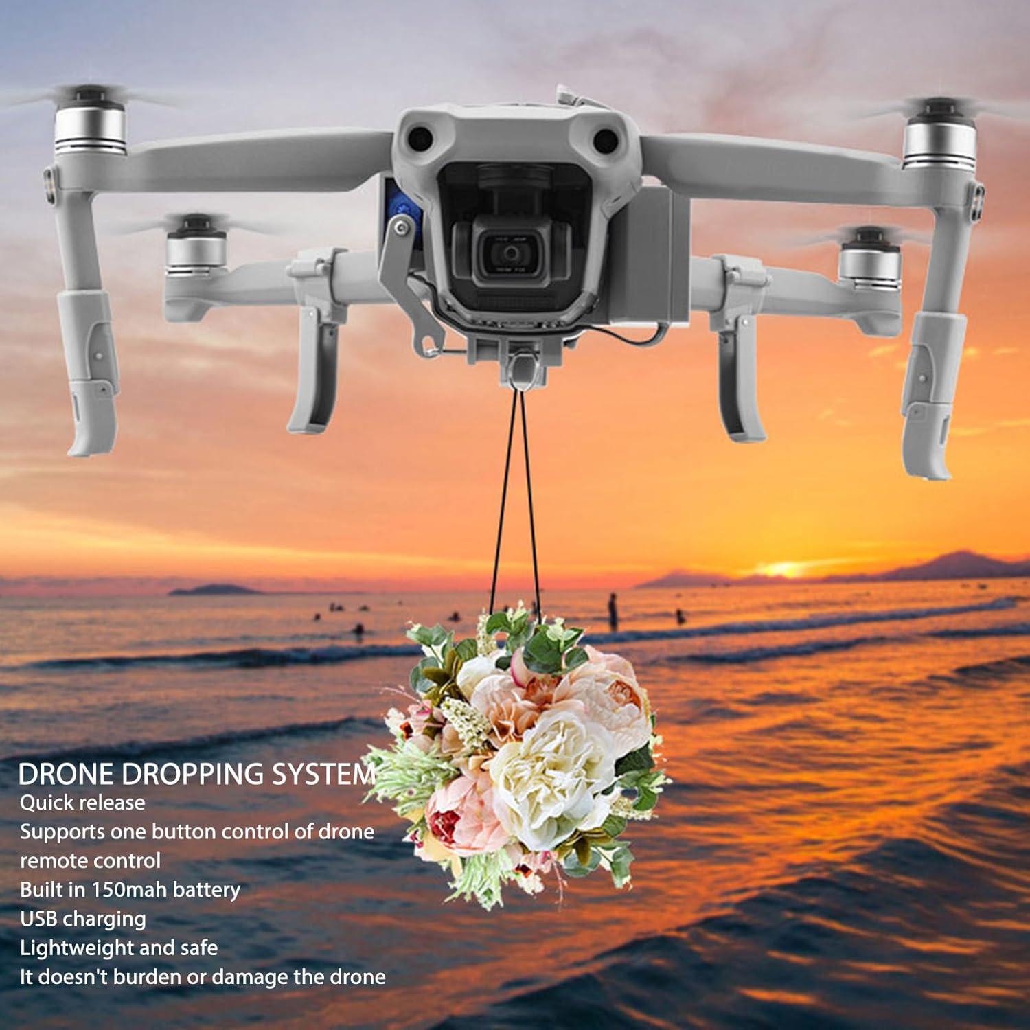1. Adatta per il MAVIC AIR 2 : Questo dispositivo di caduta del payload drone è realizzato su misura per abbinare l'alloggiamento di Mavic Air 2, rendendo l'installazione e la rimozione un gioco da ragazzi. 2.Endless usi : Eccellente per consegne remote: gravi per la pubblicità, il lancio di esche, la caduta di oggetto, la consegna di cibo, il trasporto di anelli nuziali e altro ancora. 3.Super facile da usare : Caratteristiche Rilascio rapido e Controllo a una chiave tramite il telecomando del tuo drone. Ha una batteria da 150 mAh integrata e addebiti tramite USB. 4.Lightweight & Safe : Progettato per essere leggero, non aggiungerà un onere extra al tuo drone o causerà danni. 5.Cruppo di atterraggio costante : viene fornito con un carrello di atterraggio che si installa sul fondo. Non interferisce con eliche o sensori, mantenendo il tuo drone ben protetto.