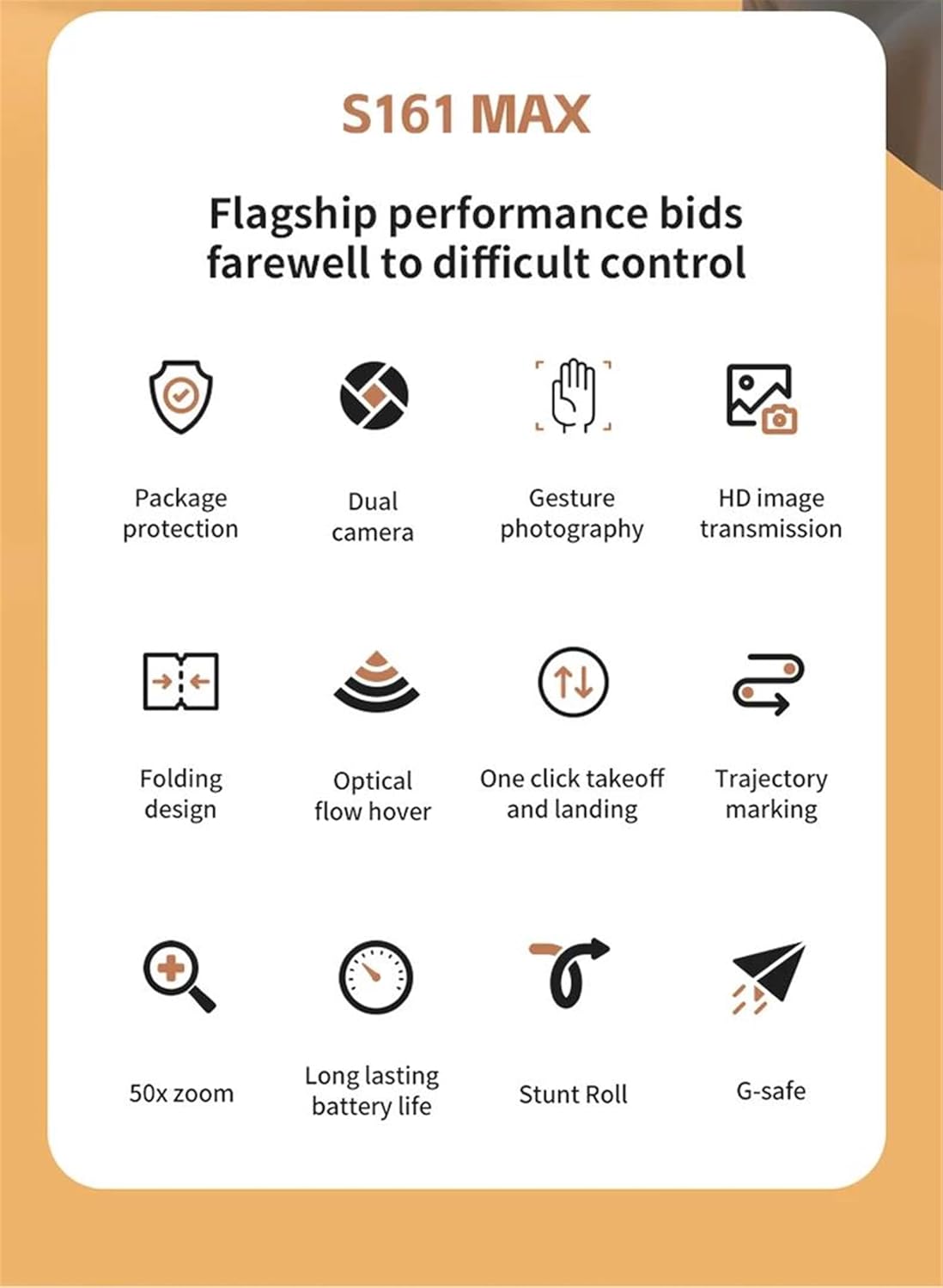 [Principianti e sicurezza]Ottieni splendide foto aeree in 4K HD e video a 720p con il drone S161. La protezione completa delle eliche e il motore brushless lo rendono una scelta sicura e durevole per principianti e bambini. Lo schermo integrato da 4,3 pollici offre una visualizzazione FPV istantanea, senza bisogno di uno smartphone. Perfetto per catturare le tue avventure all'aria aperta e i momenti in famiglia. [Fotocamera e utilizzo immediato]Inizia il tuo viaggio nella fotografia aerea fin da subito! Il drone RC S161 è dotato di una telecamera HD 4K e di uno schermo di controllo integrato da 4,3" per operazioni FPV istantanee. Con un peso di soli 142 g, questo quadricottero compatto e pronto al volo è il partner perfetto per viaggi, vacanze e divertimento all'aria aperta. [Portabilità e tecnologia]L'avventura incontra la portabilità. Questo mini drone combina un potente motore brushless con un design leggero e compatto. Lo schermo integrato da 4,3" offre una trasmissione FPV nitida e in tempo reale. Goditi fotografie aeree 4K stabili e registrazioni HD fluide fino a 12 minuti di volo con una singola carica. [Potenza e prestazioni]Sperimenta un volo potente e stabile con il motore brushless del drone per fotografia aerea S161. Offre una velocità orizzontale massima di 40 km/h per riprese dinamiche. Cattura foto 4K nitide e video HD, trasmessi direttamente allo schermo integrato del telecomando per una vera esperienza FPV. [Esperienza FPV]Guarda Il mondo da una nuova prospettiva con il volo in prima persona (FPV). Lo schermo da 4,3 pollici integrato nel radiocomando del drone S161 ti offre un feed video in tempo reale durante il volo. Il design leggero, inferiore a 1 kg, e la batteria rimovibile lo rendono un drone con telecamera HD ideale per principianti e hobbisti.