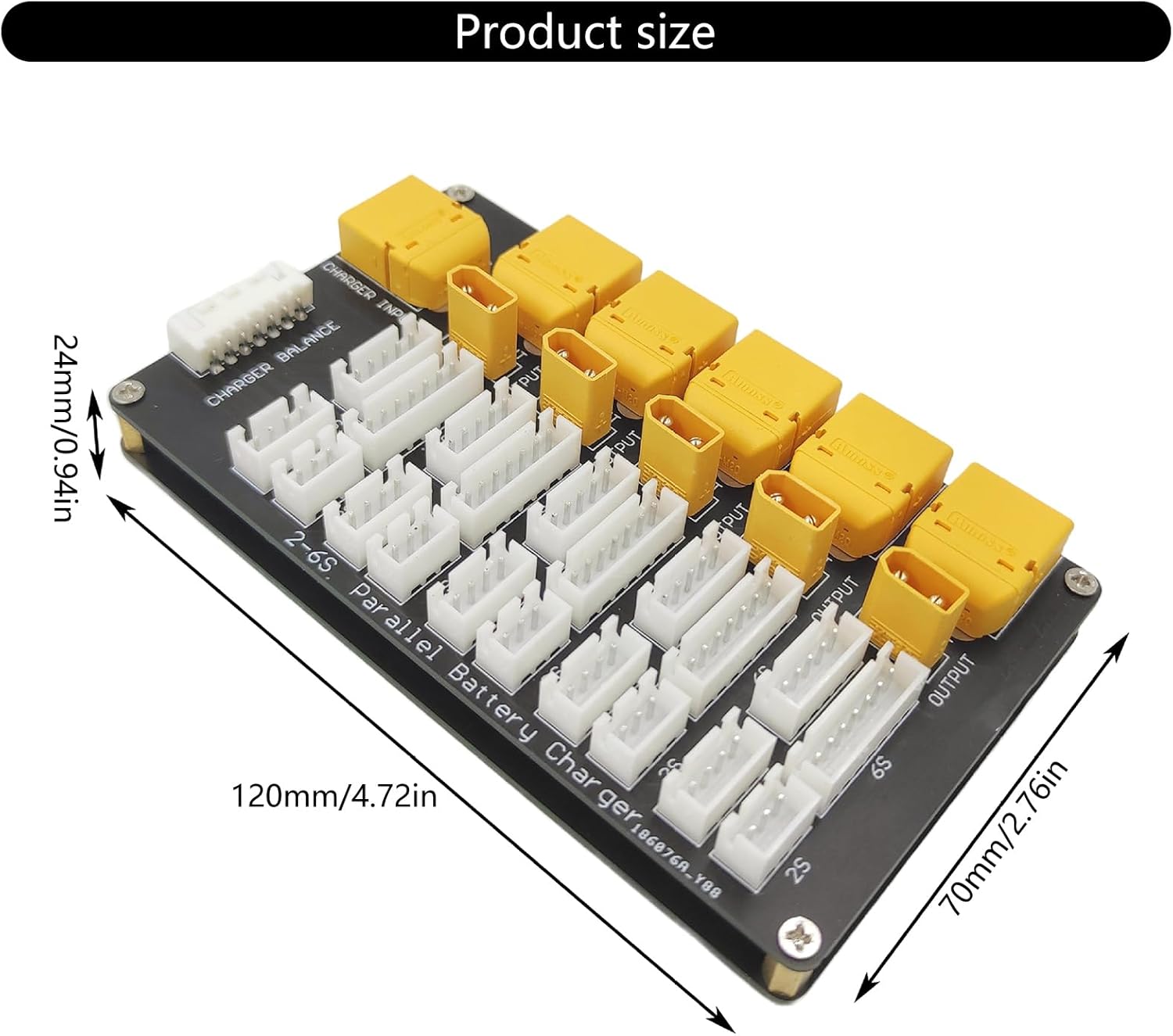 per batterie 2-6S, garantendo che ogni cella venga caricata uniformemente per estendere i servizi della batteria Supporta 5 gruppi 2S, 5 gruppi 3S, 5 gruppi 4S, 5 gruppi 5S o 5 gruppi 6S per la ricarica bilanciata in parallelo stesso Supporta la ricarica bilanciata sul mercato per caricare 5 gruppi pacchi batteria 2-6S con lo stesso tipo e lo stesso numero sezioni in parallelo Sperimenta ricarica efficiente equilibrata con la scheda ricarica della batteria Questa scheda ricarica è dotata meccanismi protezione tra cui protezioni da sovracorrente, sovratensione e cortocircuiti per i connettori XT30 e per un utilizzo versatile vari dispositivi aeromodelli