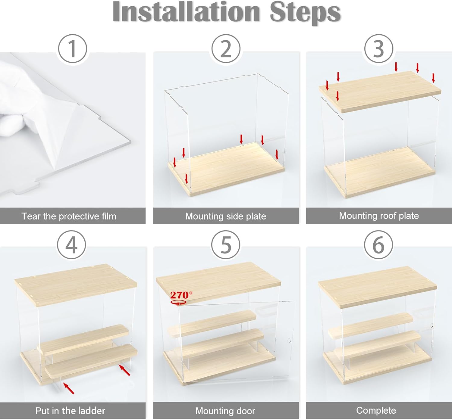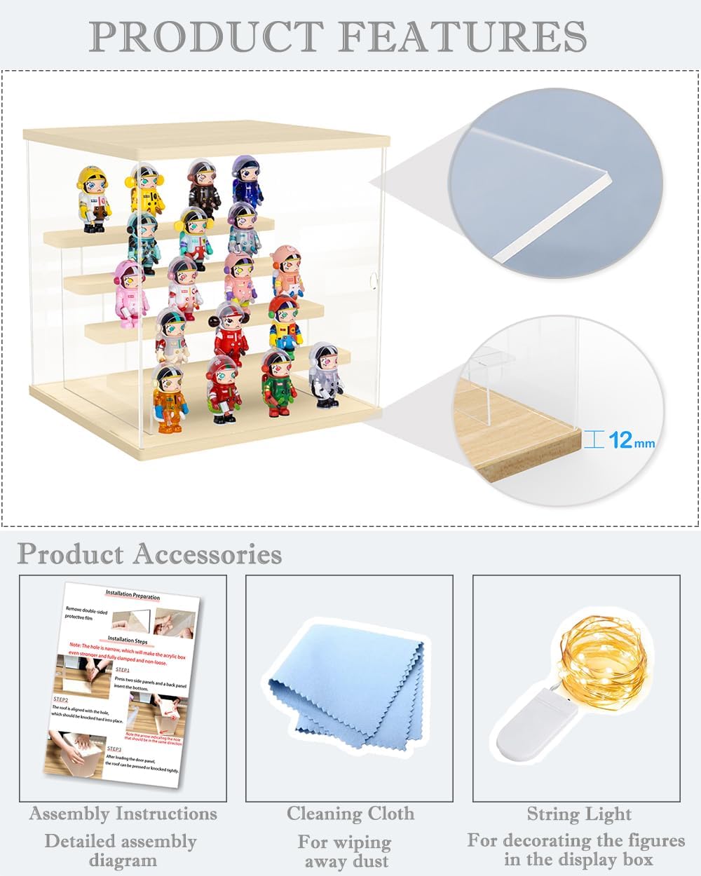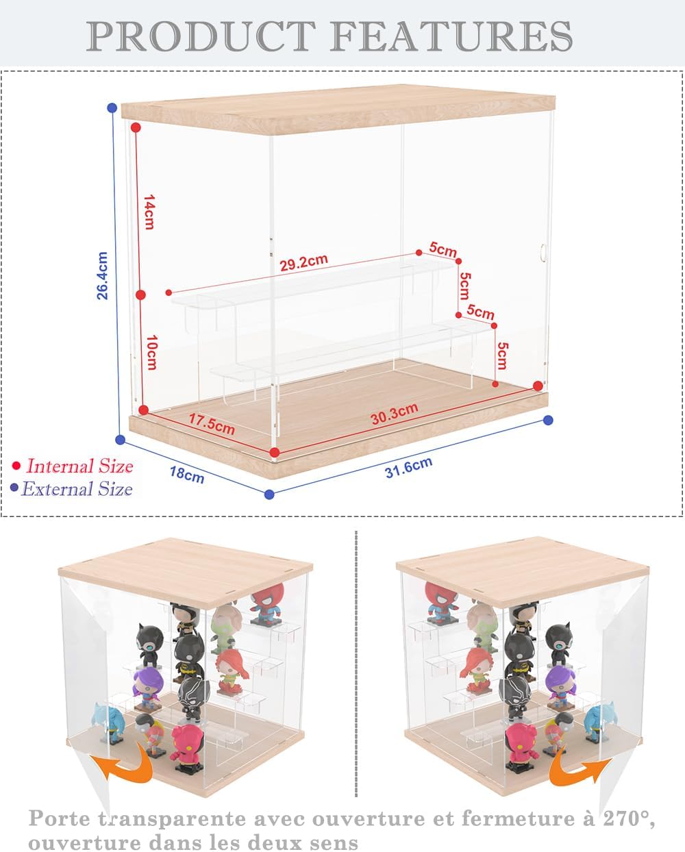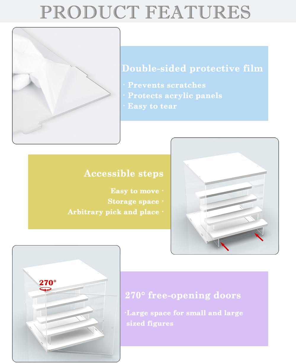 Vetrina modulare con ripiano rimovibile: La scala integrata in questa vetrina è completamente rimovibile: utilizzala come espositore per miniature (bicchierini, pietre decorative) o rimuovila per liberare spazio generoso adatto a collezioni più grandi. Due possibili configurazioni: adatta liberamente la disposizione in base alle dimensioni dei tuoi oggetti preziosi. Materiali premium per una chiarezza ottimale: Acrilico ad alta trasparenza: 3 mm di spessore con trasmissione della luce del 95%, garantendo una visibilità perfetta. Base e rivestimento in legno massello: stabilità rinforzata e sensazione naturale. Suggerimento: rimuovere la pellicola protettiva prima dell'uso per la massima brillantezza. Comoda porta anteriore per un facile accesso: grazie alla sua porta anteriore scorrevole, aggiungi o riorganizza i tuoi Funko Pop, figurine smiski o pietre preziose in un batter d'occhio, senza smontare la vetrina! Compatta ma robusta, la sua struttura acrilica di alta qualità consente un impilamento sicuro, ottimizzando lo spazio sullo scaffale o sulla scrivania. Grande formato adatto a collezioni ambiziose: dimensioni generose (31 cm (L) x 17,5 cm (P) x 24,5 cm (H)) con ripiani profondi 5,5 cm. Il suo design moderno si adatta agli interni contemporanei e agli uffici, trasformando la tua finestra in un centrotavola decorativo. Assemblaggio intuitivo e consegna sicura: nessuno strumento richiesto: assembla le pareti, il coperchio e la base in 5 minuti utilizzando la guida illustrata inclusa. Garanzia senza graffi: Imballo rinforzato con bolle antiurto e pellicola protettiva. Sicurezza totale: materiali PVC e senza acidi, rispettosi delle vostre collezioni. Protezione dalla polvere: La scatola chiusa è ideale per proteggere i tuoi oggetti dalla polvere, mantenendoli ben visibili. Meno manutenzione, più piacere visivo!