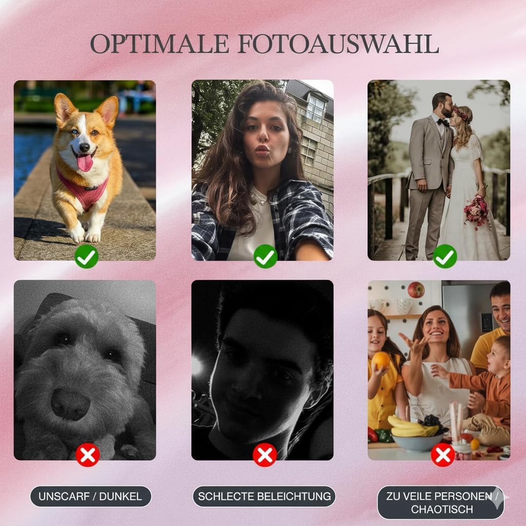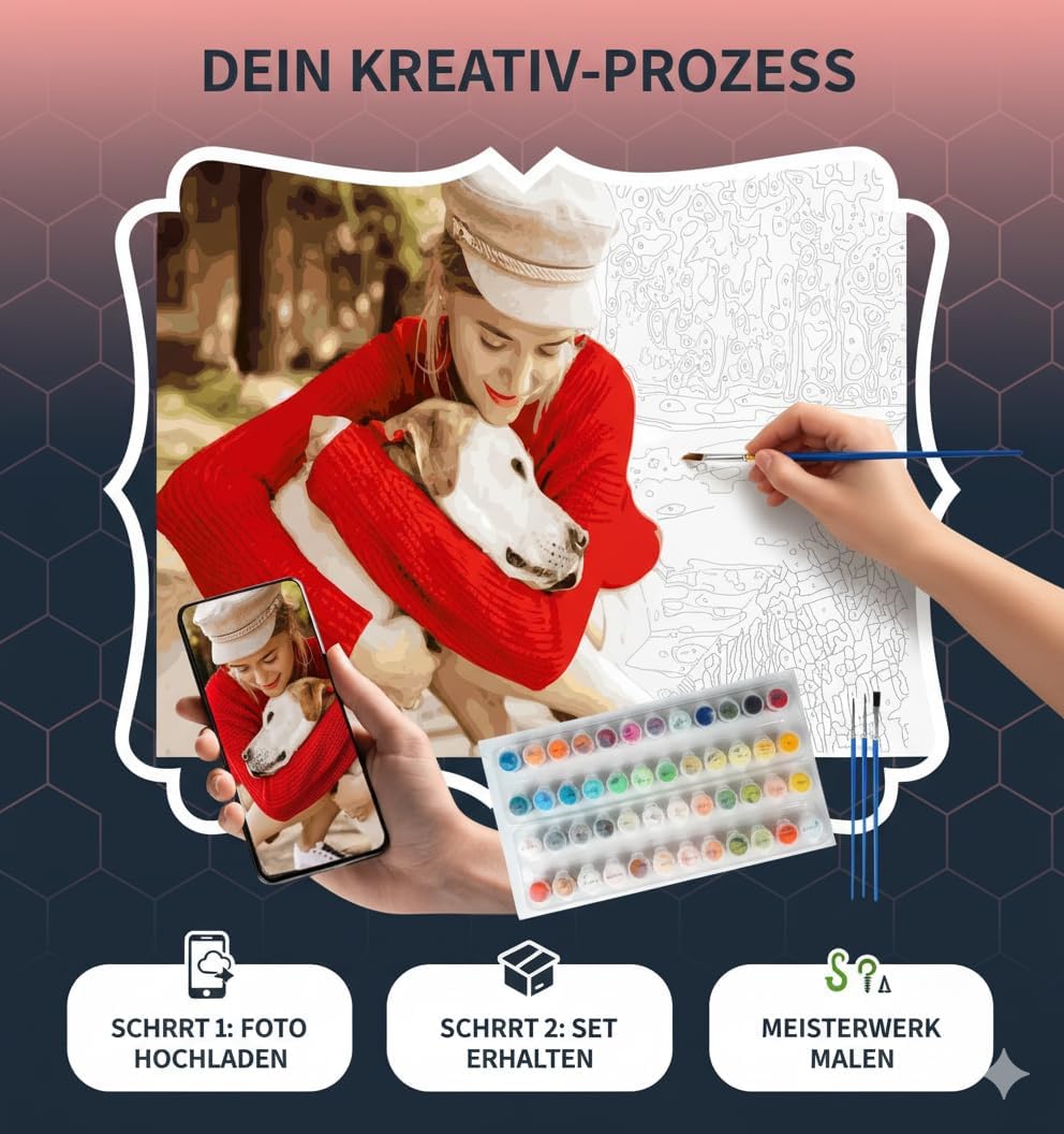 🎨 Dipingi con i numeri la tua foto: trasforma i tuoi ricordi più preziosi in un'opera d'arte unica! Carica semplicemente la tua foto preferita - che sia di famiglia, animale domestico, coppia o vacanza - e la useremo per creare il tuo dipinto personalizzato con i numeri 🖌️ TUTTO COMPRESO, IDEALE PER PRINCIPIANTI: Nessun talento artistico? Nessun problema! Il nostro set completo comprende una tela di lino prestampata di alta qualità con linee e numeri nitidi, un set di colori acrilici brillanti e non tossici e 3 pennelli professionali in nylon di diverse dimensioni 🎁 REGALO PERSONALE: stai cercando un regalo che venga davvero dal cuore? Sorprendi i tuoi cari per il loro compleanno, anniversario, Natale o San Valentino con questa esperienza creativa. Un dipinto personalizzato con i numeri è più di un regalo: è un ricordo indimenticabile creato insieme 🖼️ DECORAZIONE UNICA CON ANIMA: crea una decorazione murale che nessun altro ha. Il tuo dipinto finito diventerà il fulcro emotivo del tuo soggiorno, camera da letto o ufficio. Non è solo decorazione, ma una prova orgogliosa della tua creatività e uno sguardo quotidiano ai tuoi momenti più belli 💯 IL TUO SET, LA TUA SCELTA: il tuo set di pittura con i numeri DXDOING è accuratamente confezionato e contiene tutto il necessario per dipingere. Per una presentazione perfetta, puoi aggiungere facoltativamente la nostra cornice in legno fai-da-te facile da montare
