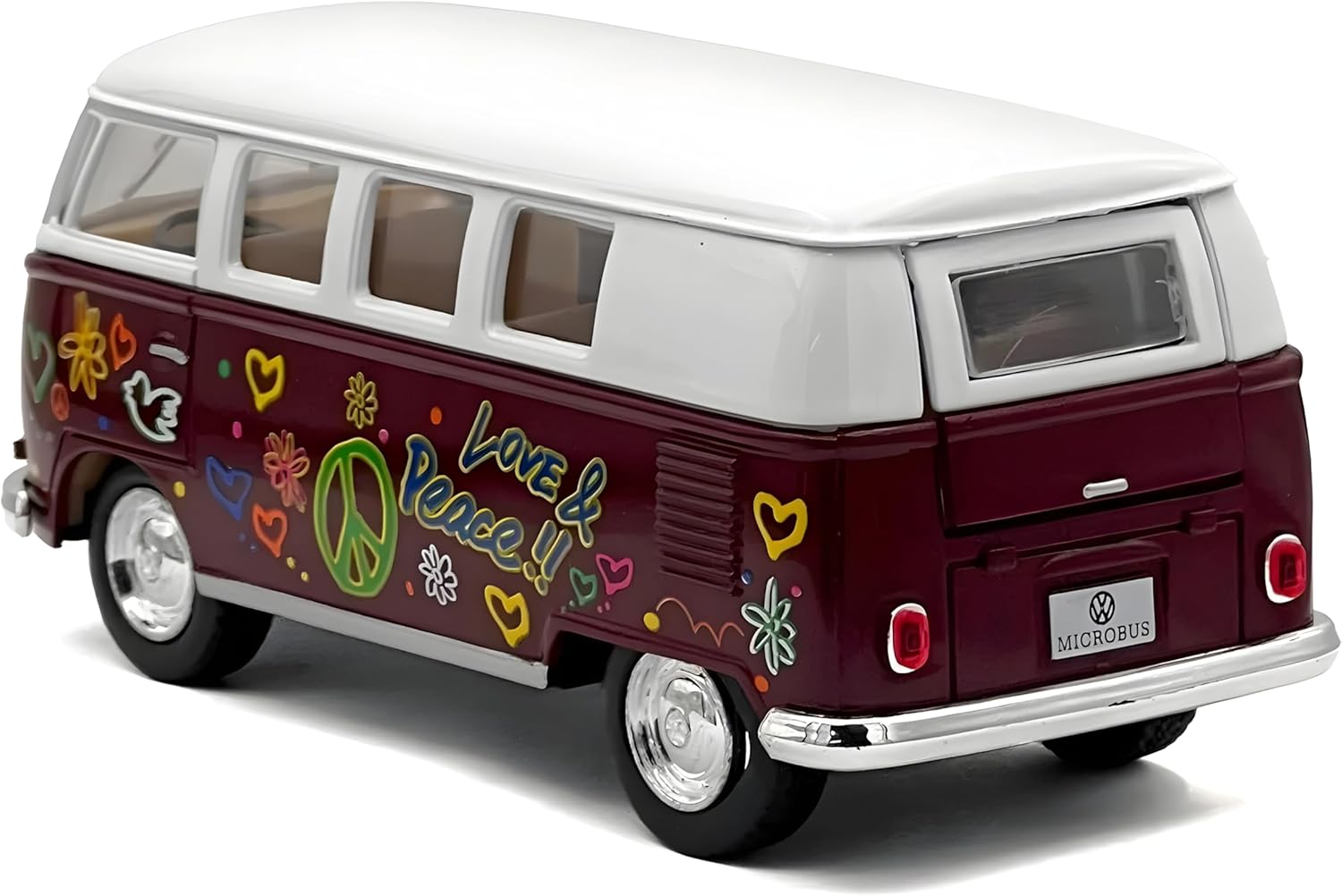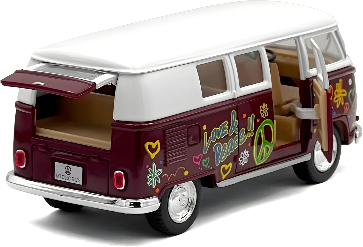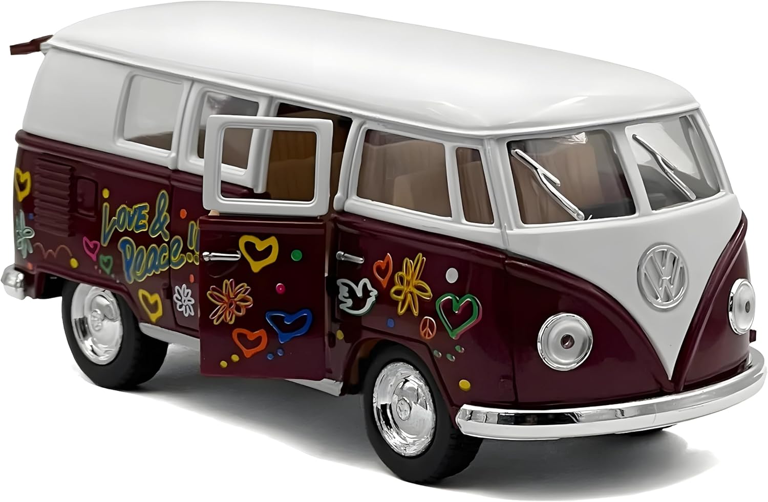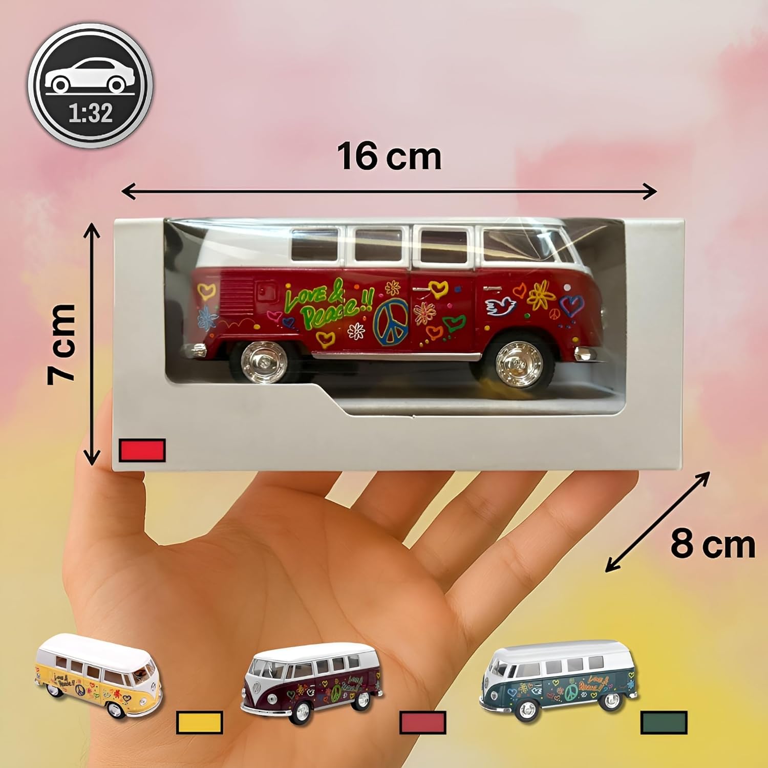 Modellino della grande casa automobilistica. Modello Love Peace 1962. Perfetto da collezionare o come giocattolo. Scala 1:32. Die cast con parti in plastica, realizzato con cura nei minimi dettagli. Non adatto a bambini di età inferiore a 3 anni. Viene fornito nella confezione.
