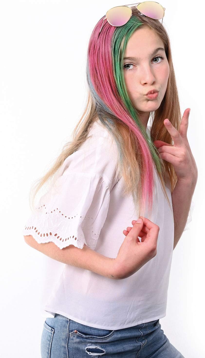 Gesso per capelli per creare acconciature insolite e nuove tendenze per i capelli, in 3 colori metallici Include 3 pastelli per capelli nei colori rosa metallizzato, blu metallizzato, verde metallizzato e un piccolo pettine. Facile da applicare sui capelli asciutti: distribuire uniformemente il gesso dall'alto verso il basso sulle ciocche, lasciare asciugare, fissare con lacca o spray per capelli. La tinta per capelli si risciacqua facilmente con acqua e shampoo Ideale per acconciature colorate a carnevale, feste in maschera, feste di compleanno per bambini, Halloween, feste per bambini e di strada, spettacoli teatrali, cosplay e feste a tema.
