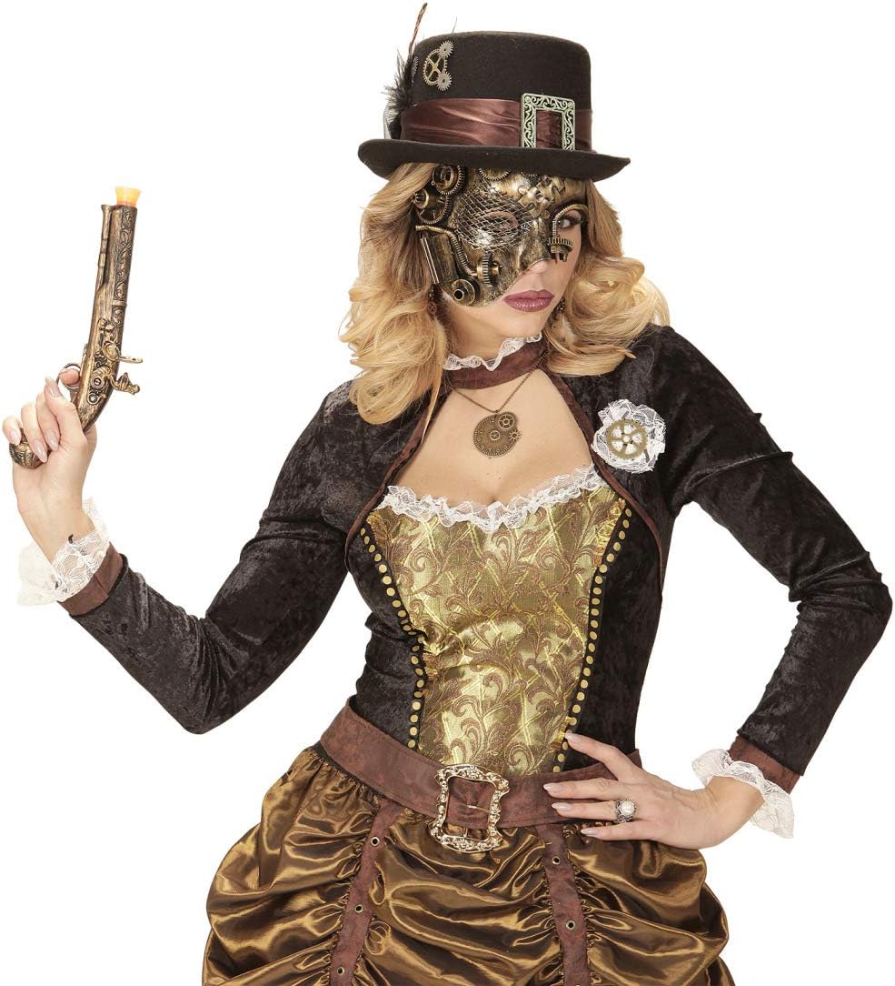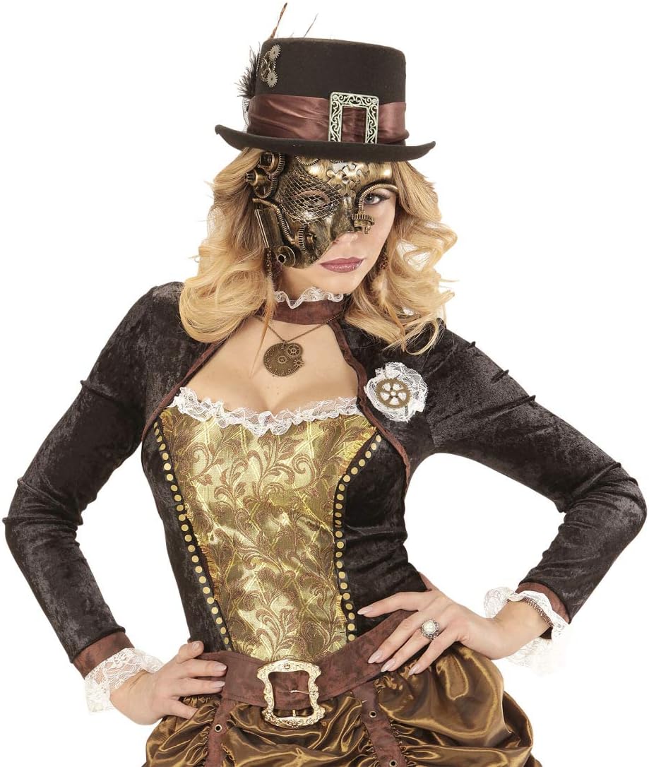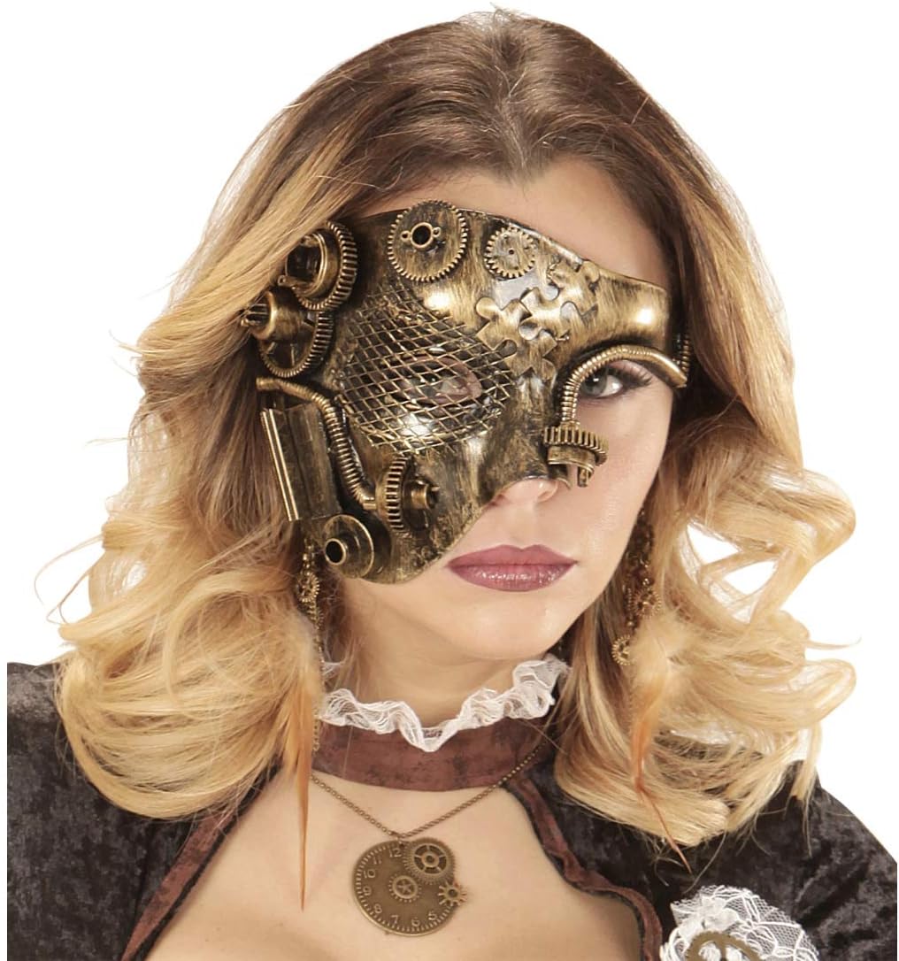 Mezza maschera Dieselpunk elegante accessorio unisex - Perfetto per balli in maschera e feste a tema Taglia (in produzione): Taglia unica per adulti Colore: rame-metallico Composizione del materiale: 100% PS (polistirolo) Fornitura: 1 cappuccio