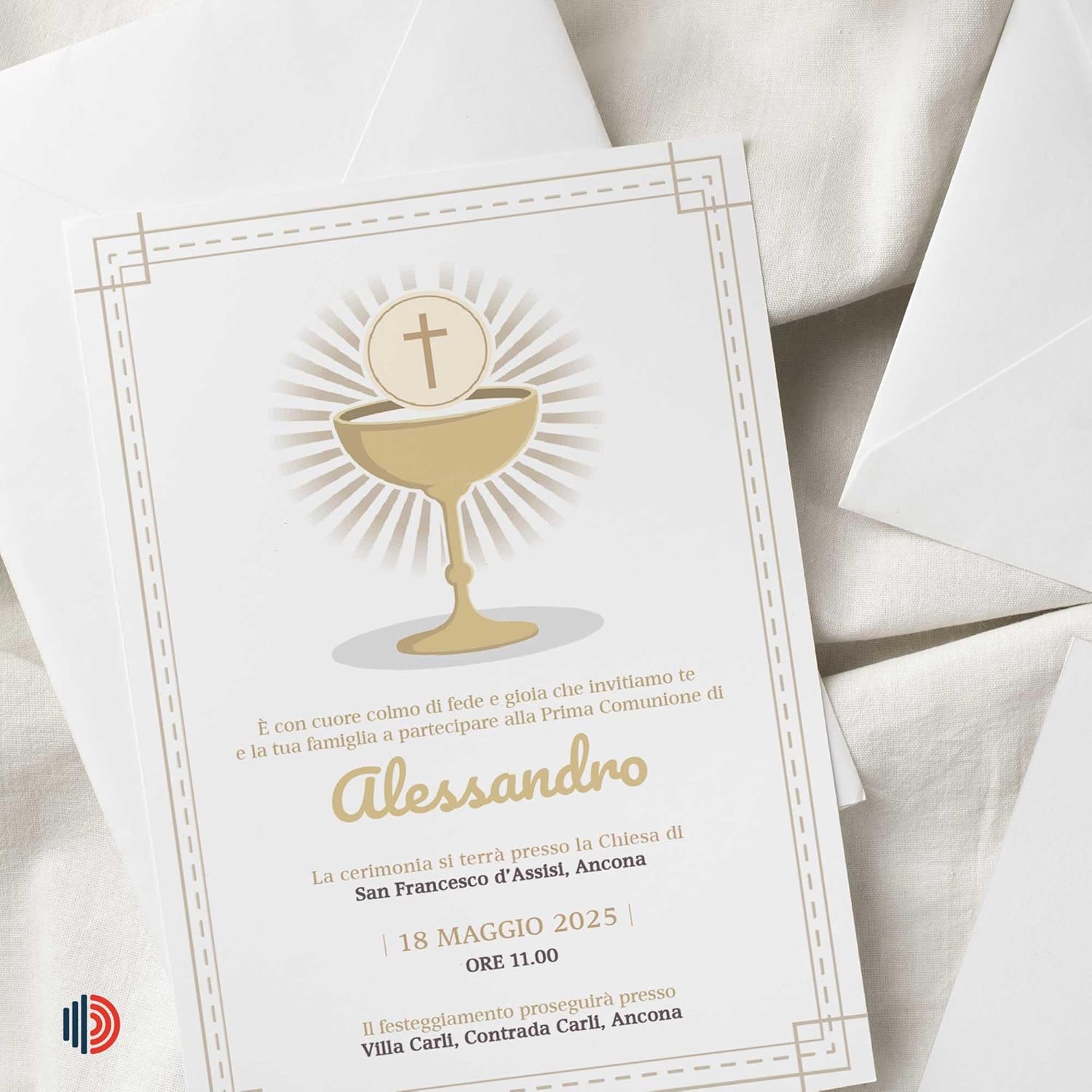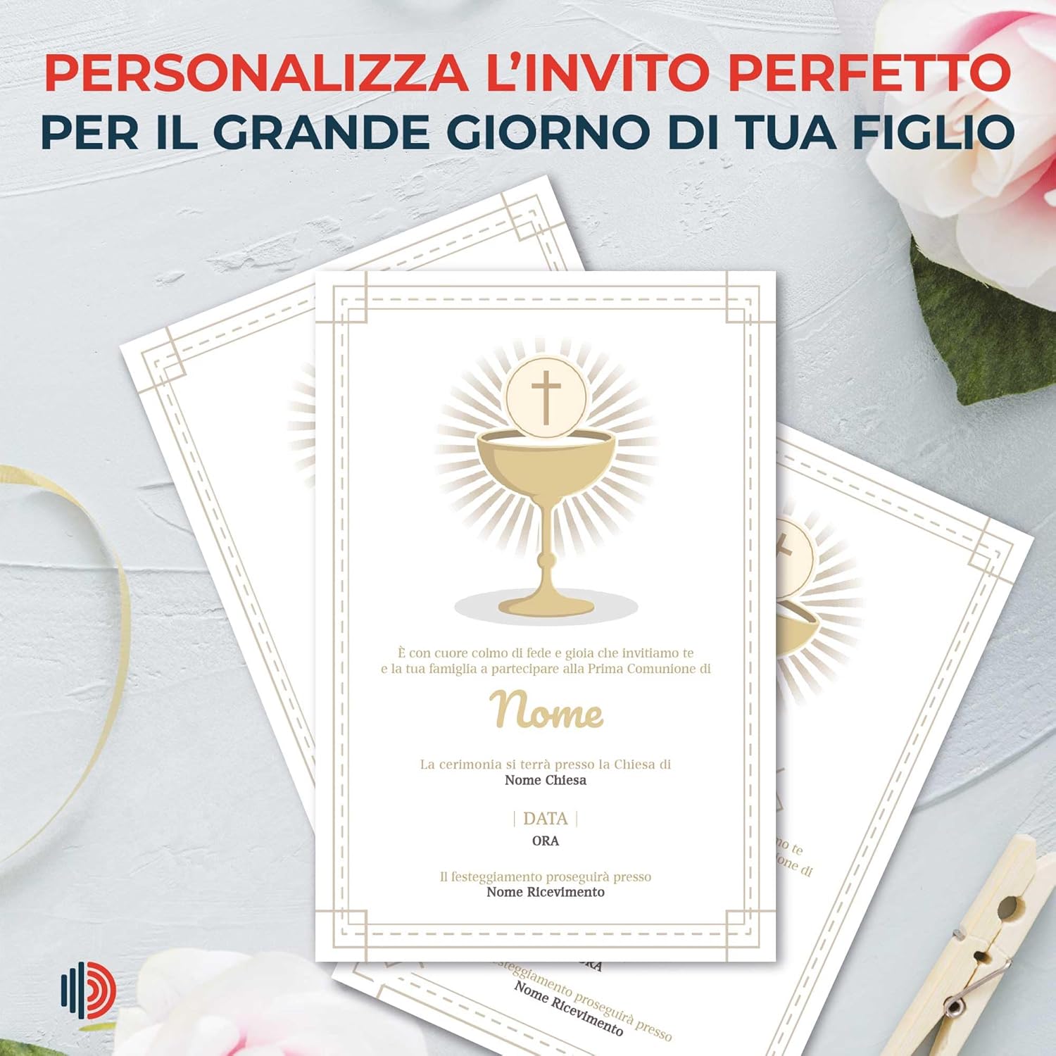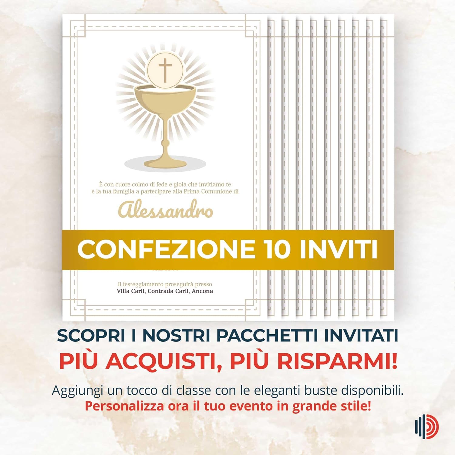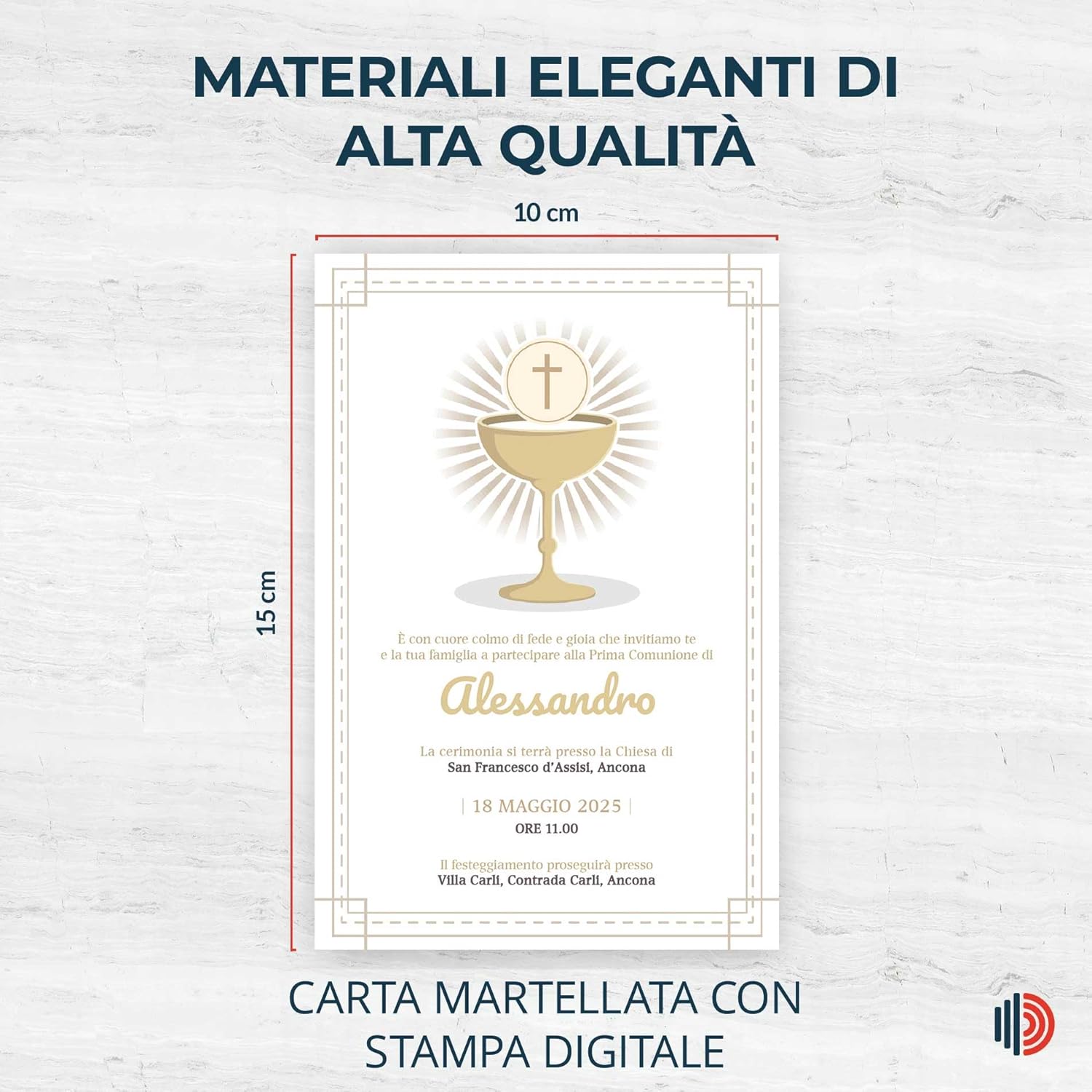 Ogni invito è pensato per rispecchiare la purezza e la gioia della comunione. Il design sobrio ma elegante assicura che il messaggio di celebrazione sia al centro dell'attenzione, rispettando la solennità dell'occasione. Gli inviti sono stampati su carta di alta qualità per garantire durata e un tocco professionale. La nitidezza della stampa e la robustezza della carta riflettono l'importanza del tuo evento, lasciando un'impressione duratura sui tuoi ospiti. Ogni pack include 10 inviti personalizzabili e pronti per l'invio, semplificando il processo di preparazione e consentendoti di dedicarti serenamente agli altri dettagli della celebrazione. Approfitta della possibilità di acquistare più pack a prezzi vantaggiosi e personalizza la tua scelta aggiungendo, se desideri, le buste coordinate. Un'opzione ideale per rendere ogni momento della tua organizzazione più semplice e meno stressante. Personalizza ora il tuo invito e visualizza l'anteprima del design direttamente sulla scheda prodotto. Se hai bisogno di assistenza pre o post acquisto, EchoPrints offre un servizio clienti qualificato e rapido, pronto a guidarti attraverso ogni fase della personalizzazione del tuo invito. Ogni dettaglio di questo prodotto è stato ideato e progettato artigianalmente in Italia. Dai materiali di prima qualità al raffinato processo di lavorazione, il vostro invito risplende di autenticità e qualità, riflettendo l'eccellenza della vostra selezione.
