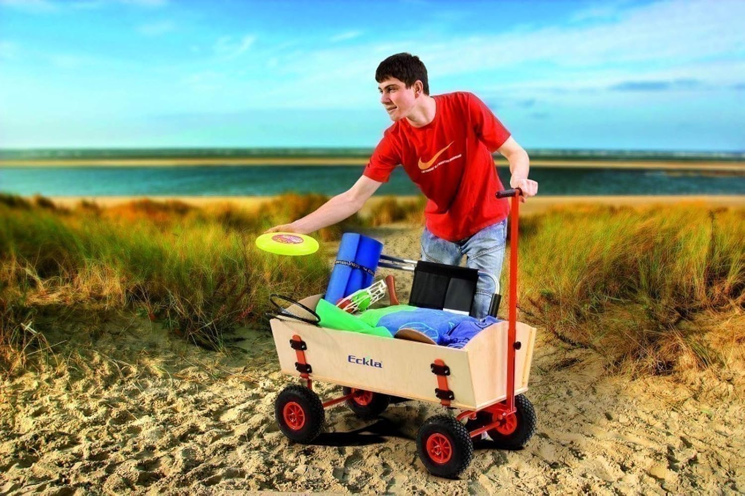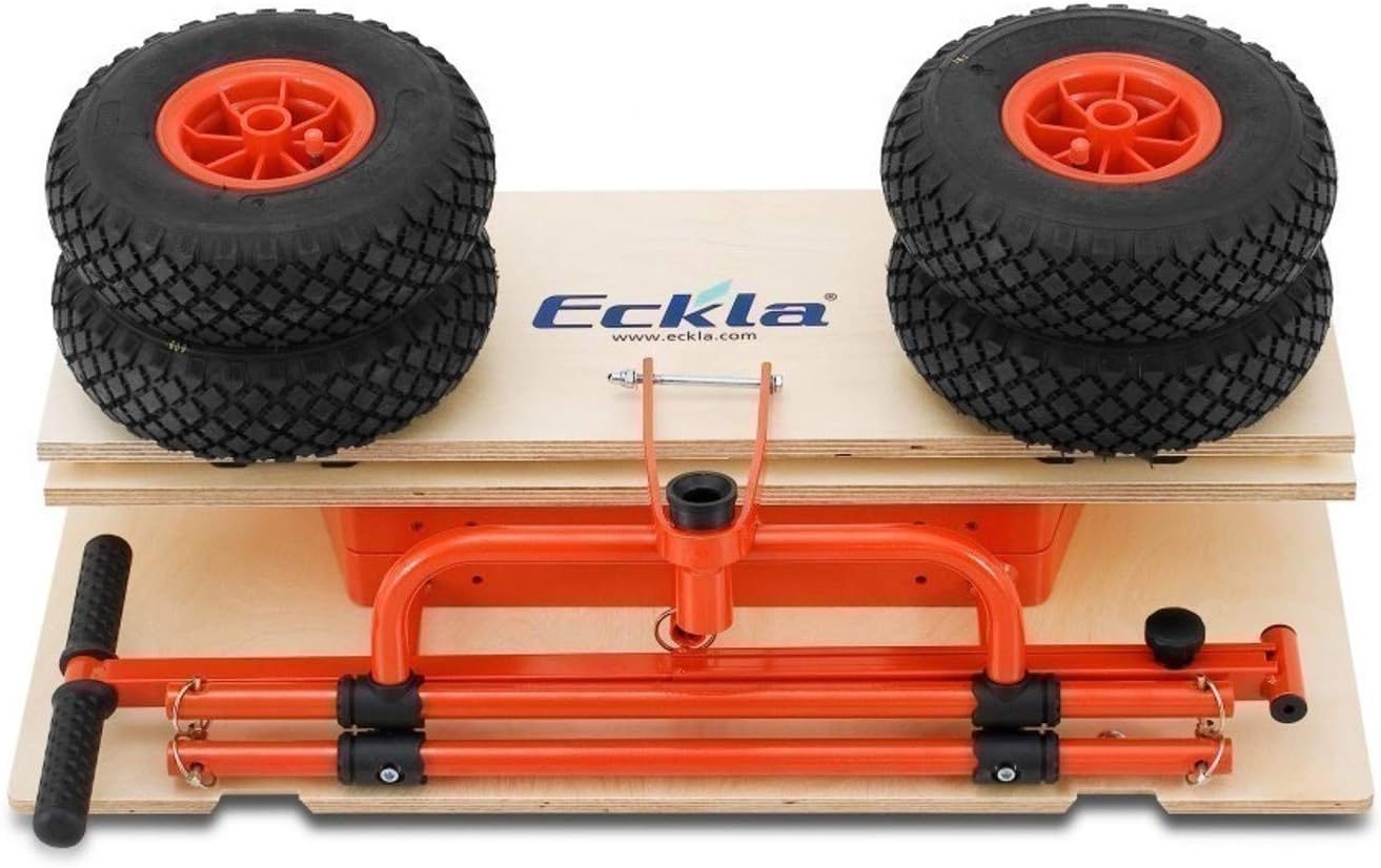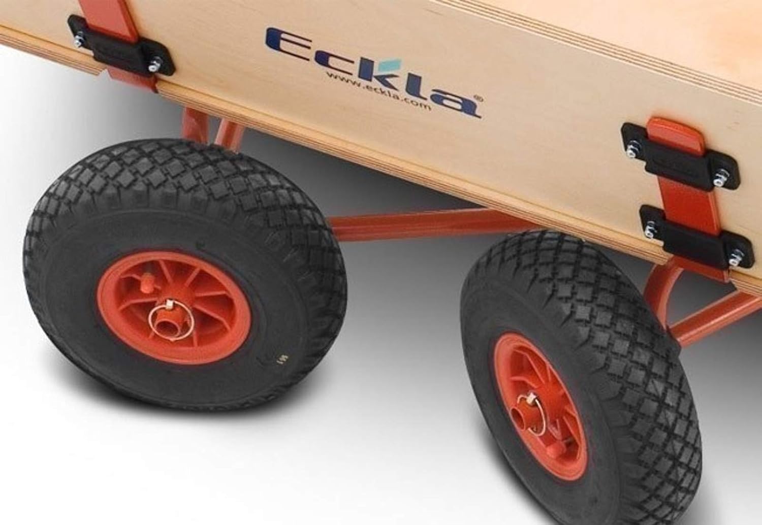 Robusta struttura in legno innestabile, smontabile senza attrezzi, salvaspazio per il trasporto, facile montaggio dei pneumatici (agganciare e fissare con coppiglia), dotato di legno multistrato di alta qualità per carichi elevati e longevità, capacità di carico: 150 kg, ruote pneumatiche con tubo + valvola per auto Ø 260 x 85 mm