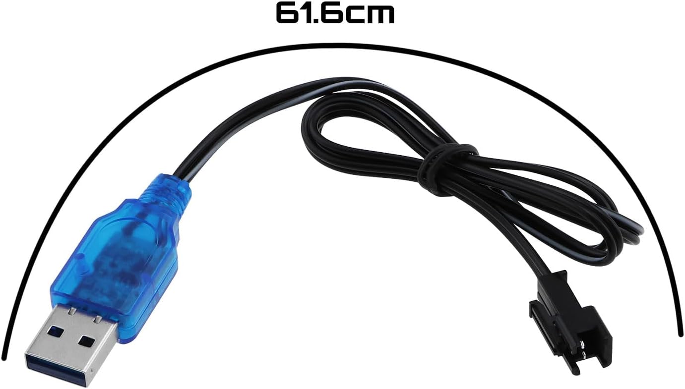 Progettato per batteria ai polimeri di litio 1S 3,7 V o batteria agli ioni di litio. Ingresso : CC 5 V 1 A-2 A; Uscita : 3,7 V 400 mAh; Connettore : Presa da USB a SM-2P; Lunghezza : 61,6 cm. I cavi USB per caricabatterie sono adatti per mini auto RC, barche, camion, veicoli acrobatici anfibi e batterie agli ioni di litio con spina SM-2P. Come usare : 1. Caricabatterie alimentato senza batteria collegata, la luce rossa è spenta; 2. Caricamento della batteria in corso, quindi la luce rossa è fissa; 3. La batteria è completamente carica, la luce rossa è spenta. Si prega di scollegare le batterie dopo averle caricate completamente. Il prodotto include un totale di 2 cavi di ricarica USB, che possono soddisfare completamente le esigenze di utilizzo quotidiano e di sostituzione.