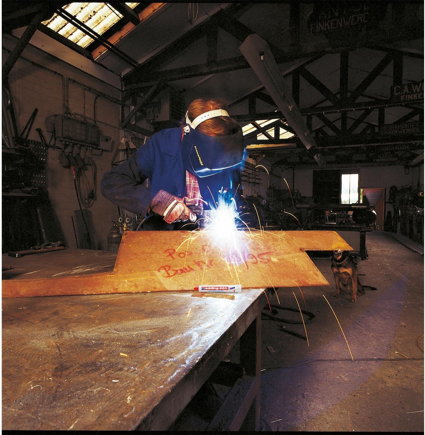 Marcatore speciale industria per marcatura impermeabile, resistente al calore e permanente superfici o ruvide in petrolio, metallo e altre industrie pesanti 1 pittore dell'industria in rosso La pasta colorata è immediatamente pronta all'uso, non si cancella ed è quindi estremamente resistente; colori intensi per marcature affidabili e altamente visibili Punta in pasta di alta qualità per una marcatura precisa e duratura su superfici ruvide o polverose; può essere utilizzato su una superficie pulita sott'acqua Il pittore industriale edding 950 è disponibile in nero, rosso, blu, giallo e bianco; colori intensi per una marcatura chiaramente visibile