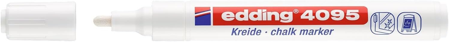 Pennarello a gesso liquido medio per superfici lisce come vetri e lavagne nere; pennarello a gesso cancellabile con un panno umido 1 pennarello bianco Gesso liquido coprente a base d'acqua, resistente alla luce sotto forma di pennarello per disegnare senza polvere; ideale per disegni Per la pittura creativa sugli specchi a casa; decorazione pulita e di qualità su vetrine e menù in ristoranti, bar e alberghi Il pennarello a gesso liquido edding 4095 è disponibile in 9 colori lucidi; altre larghezze di tratto disponibili edding 4090 e edding 4085