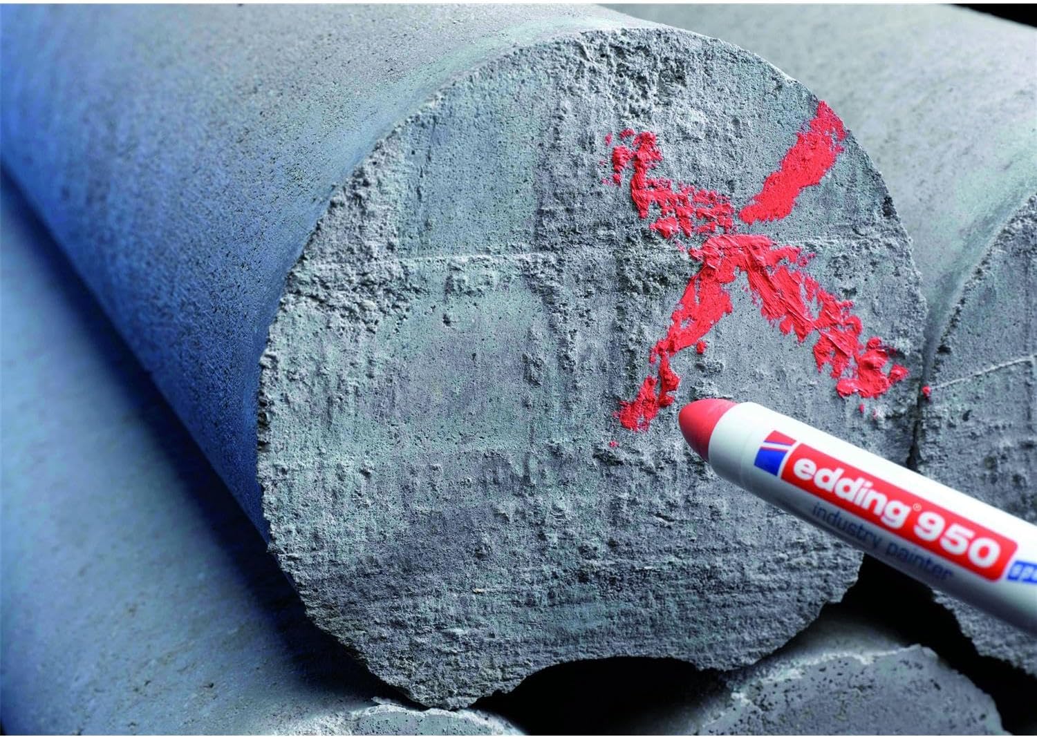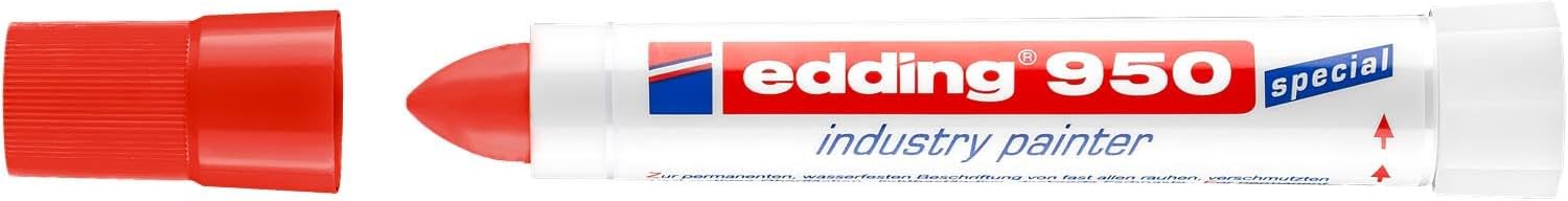 Marcatore speciale industria per marcatura impermeabile, resistente al calore e permanente superfici o ruvide in petrolio, metallo e altre industrie pesanti 1 pittore dell'industria in rosso La pasta colorata è immediatamente pronta all'uso, non si cancella ed è quindi estremamente resistente; colori intensi per marcature affidabili e altamente visibili Punta in pasta di alta qualità per una marcatura precisa e duratura su superfici ruvide o polverose; può essere utilizzato su una superficie pulita sott'acqua Il pittore industriale edding 950 è disponibile in nero, rosso, blu, giallo e bianco; colori intensi per una marcatura chiaramente visibile