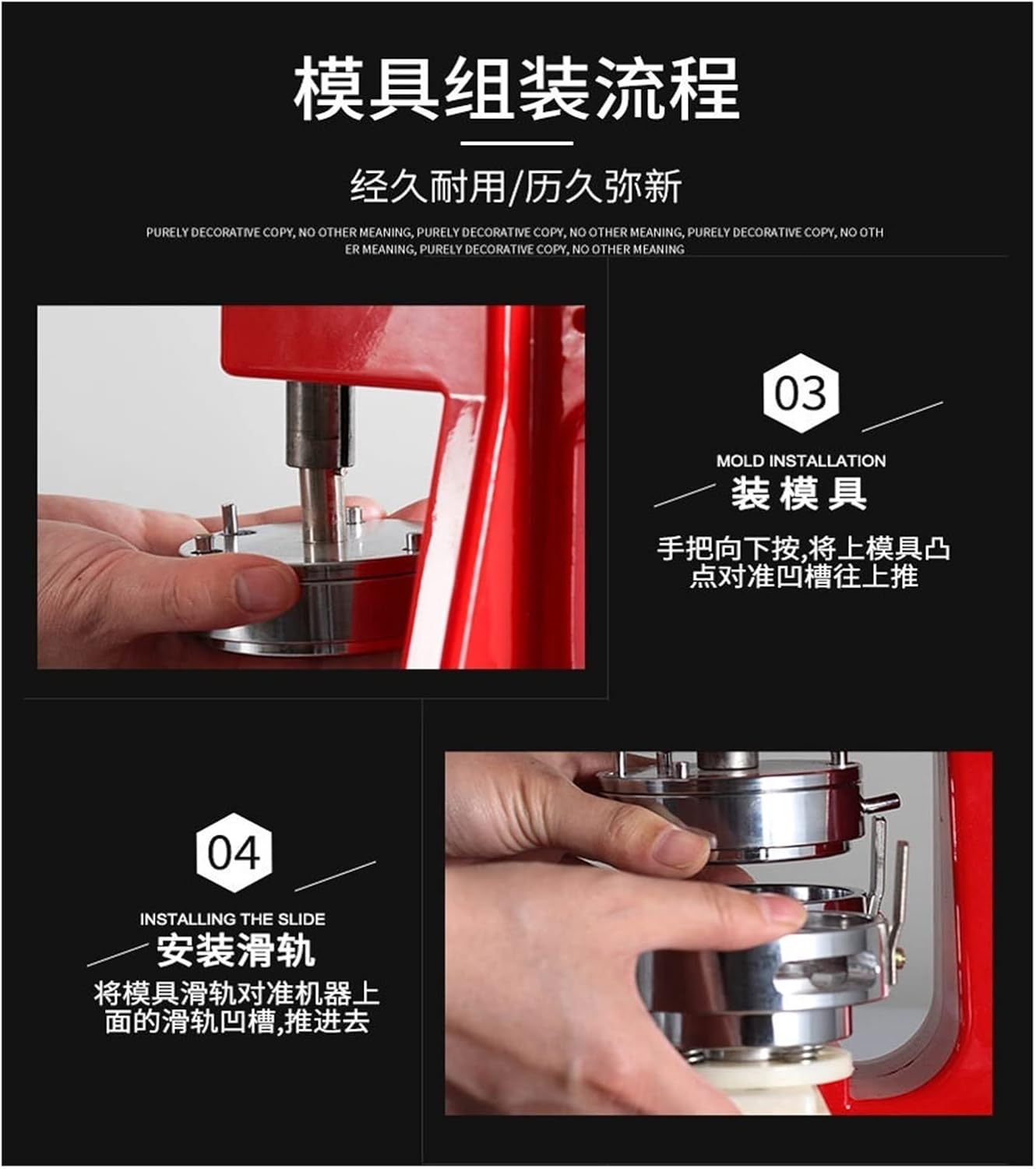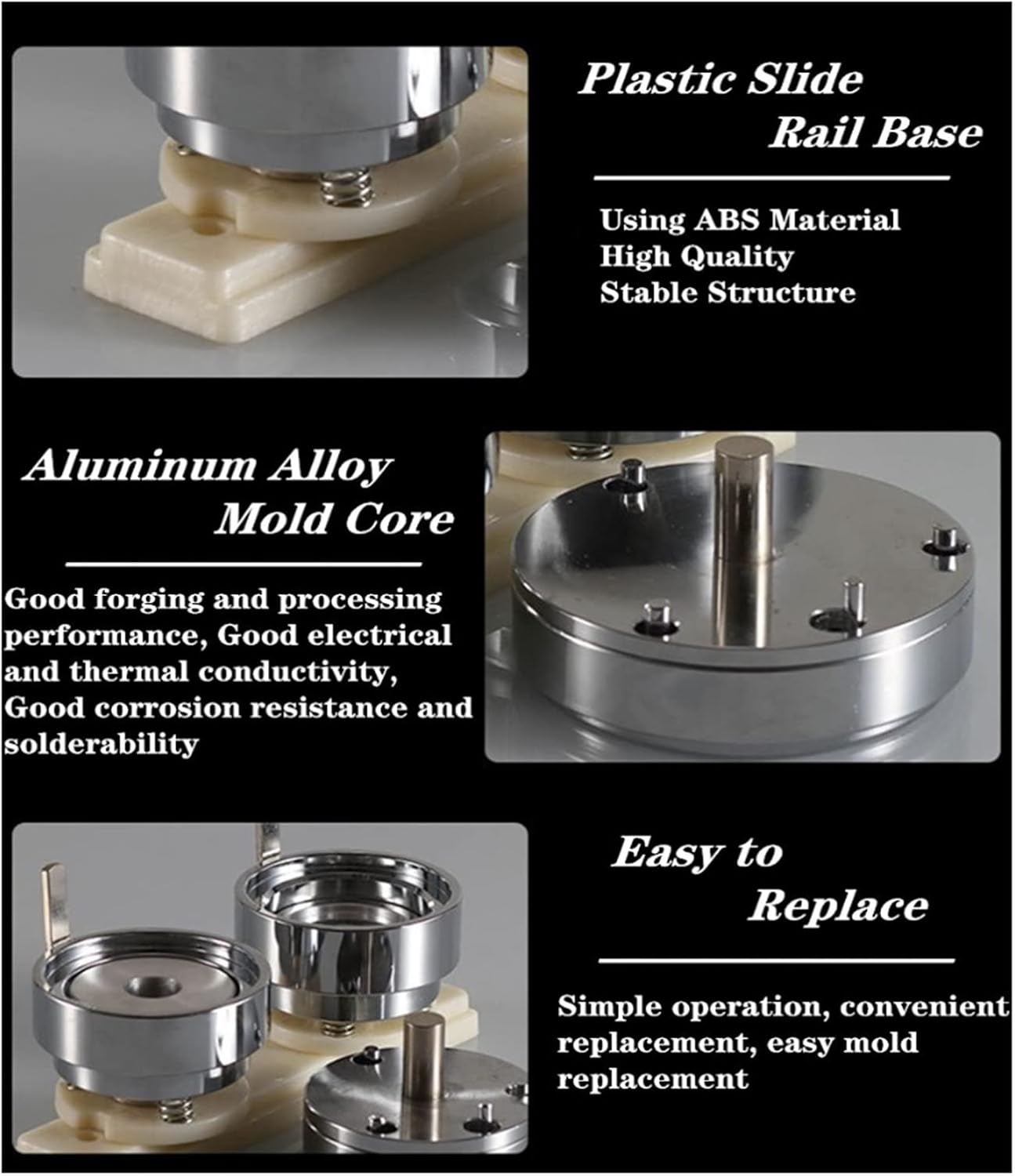 Stampo incorporato, facile da sostituire. Con diverse dimensioni di stampo, puoi creare diverse dimensioni di badge, bottoni, cappucci, bottoni, portachiavi, ecc. Facile da imparare. Elevata efficienza produttiva. Devi solo stampare le tue immagini preferite prima di poter creare i tuoi badge. Punzone tondo in ferro da punzonatura in metallo + piastra di base in ABS. Mini, compatto, portatile, piccolo spazio, facile da trasportare e riporre. La base scorrevole consente di spostare gli stampi in modo più accurato, pista di scorrimento veloce per il funzionamento, effetto elevato.