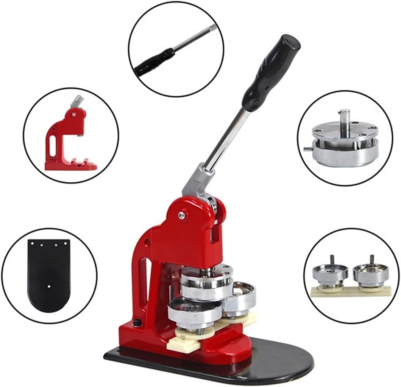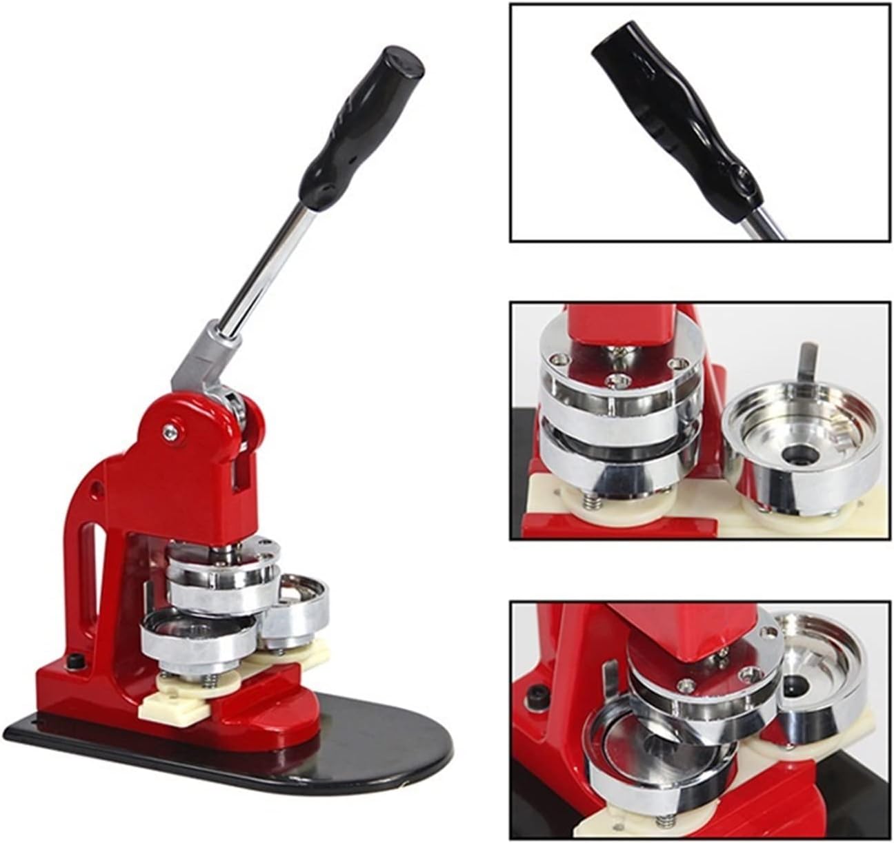 Questa macchina per bottoni viene fornita con un set di matrici, adatte per realizzare badge per bottoni da 25/32/37/44/50/56/58/75 mm. La base scorrevole consente di spostare le fustelle in modo più preciso e veloce. La maniglia in acciaio dal design ergonomico offre una presa comoda e consente di risparmiare energia. È una macchina fantastica, facile da usare, veloce e offre ottimi risultati. È ampiamente utilizzato per creare bottoni fatti in casa