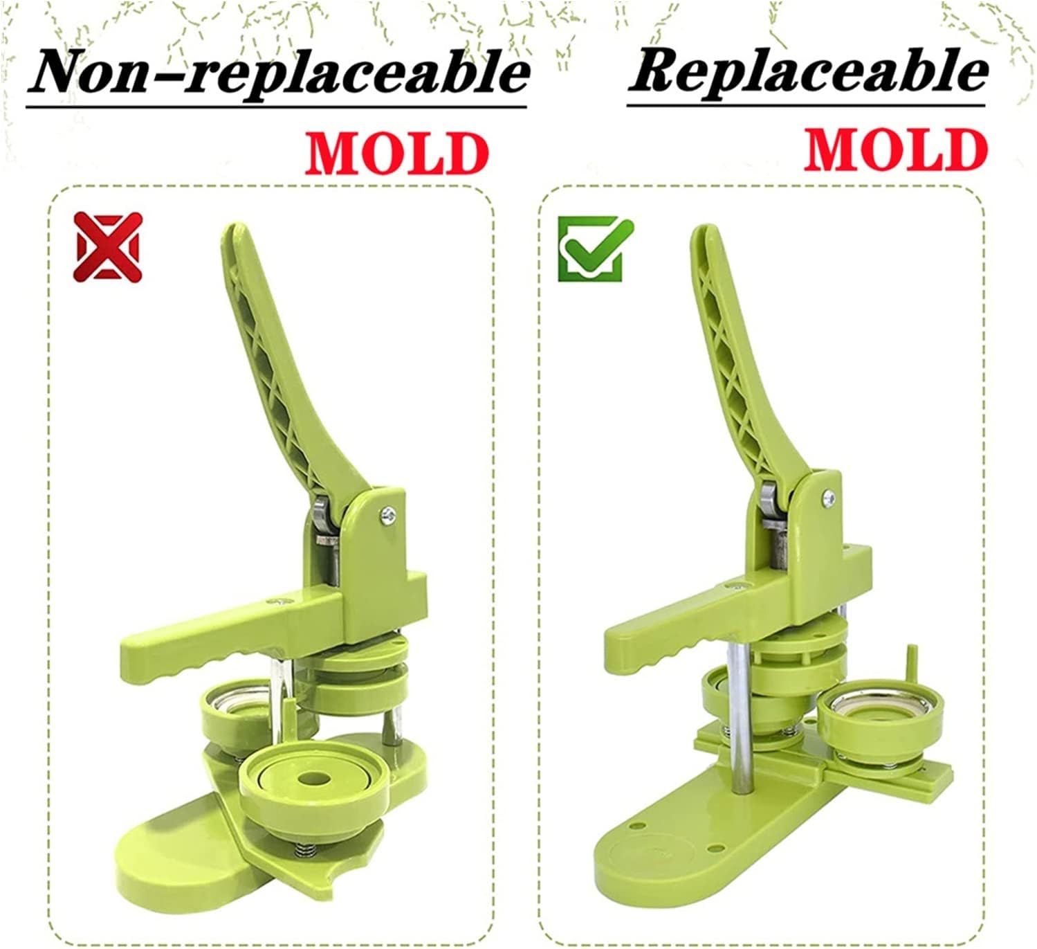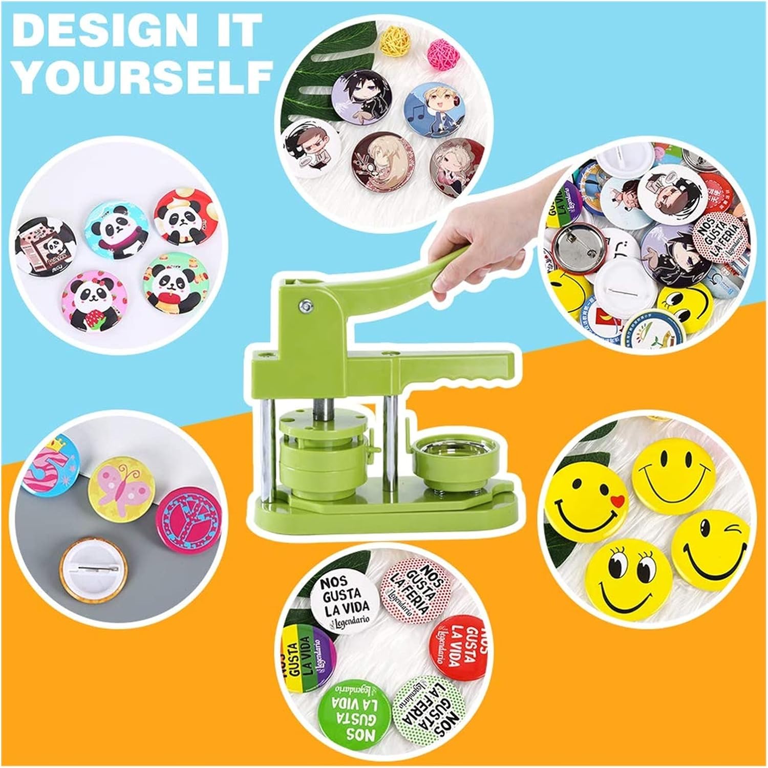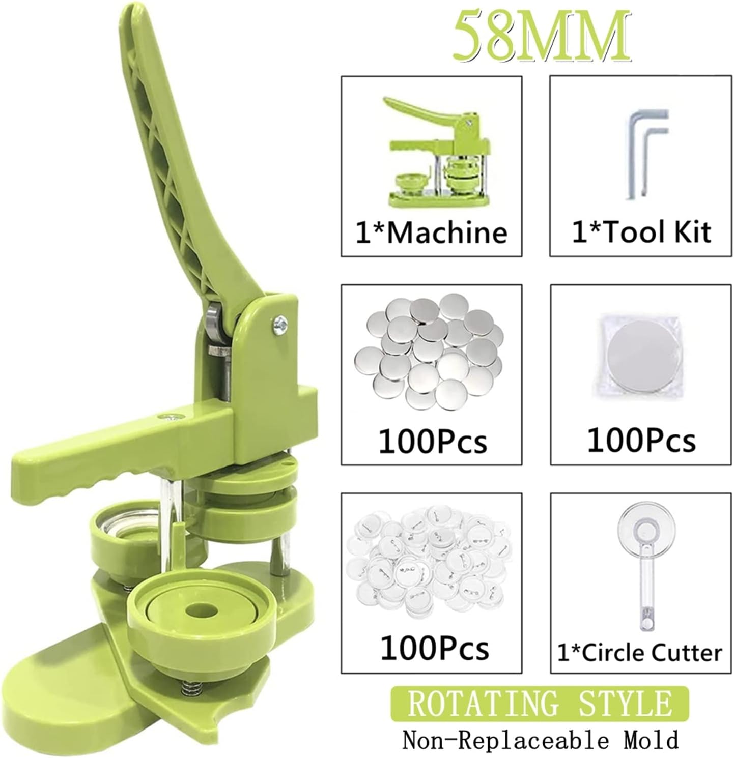 IL KIT PER LA REALIZZAZIONE DI BADGE PER BOTTONI FAI DA TE COMPRENDE: Macchina per bottoni, parti per bottoni da 100 pezzi, taglierina circolare, immagini da 100 pezzi e un libro magico. La macchina per bottoni può essere regalata anche ai bambini e agli appassionati del fai da te. DESIGN UNICO - una sorta di macchina per la produzione di badge, che può realizzare piccoli regali come spille, apriscatole, portachiavi, ecc. Questa macchina utilizza tecnopolimeri ad alta resistenza, il corpo della macchina e lo stampo sono integrati, è leggero, lunga durata e funzionamento facile, sfruttando appieno l'abilità pratica del bambino. FACILE DA USARE - Innanzitutto, taglia l'immagine alla dimensione corretta con una fustellatrice circolare semplice e facile da usare. In secondo luogo, posizionare a turno la parte anteriore in metallo, l'immagine e il foglio di plastica trasparente nella fustella A; Terzo, reinserire il perno nella matrice B con il perno rivolto verso l'alto; Dura direttamente la matrice B SUPPORTO GIREVOLE MIGLIORATO - La tecnologia di montaggio girevole migliorata non solo migliora l'efficienza e la precisione, ma aiuta anche con un migliore posizionamento, garantendo che pulsanti e badge risultino esattamente come li desideri.
