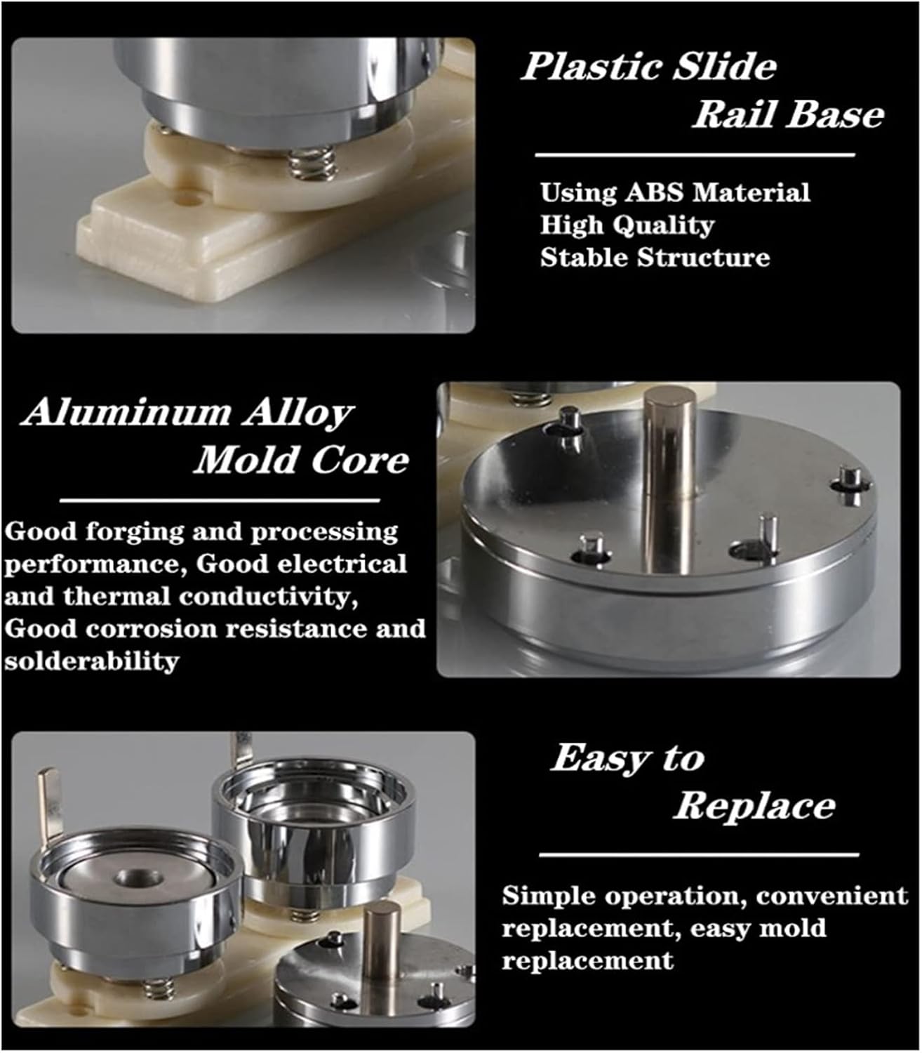 Stampo integrato, facilmente sostituibile. Con diverse dimensioni di stampo, puoi creare diverse dimensioni di badge, bottoni, cappucci, bottoni, portachiavi, ecc. Facile da imparare. Elevata efficienza produttiva. Devi solo stampare le tue immagini preferite prima di poter creare i tuoi badge. Mini, compatto, portatile, piccolo spazio, facile da trasportare e riporre. È ampiamente utilizzato per creare bottoni fatti in casa