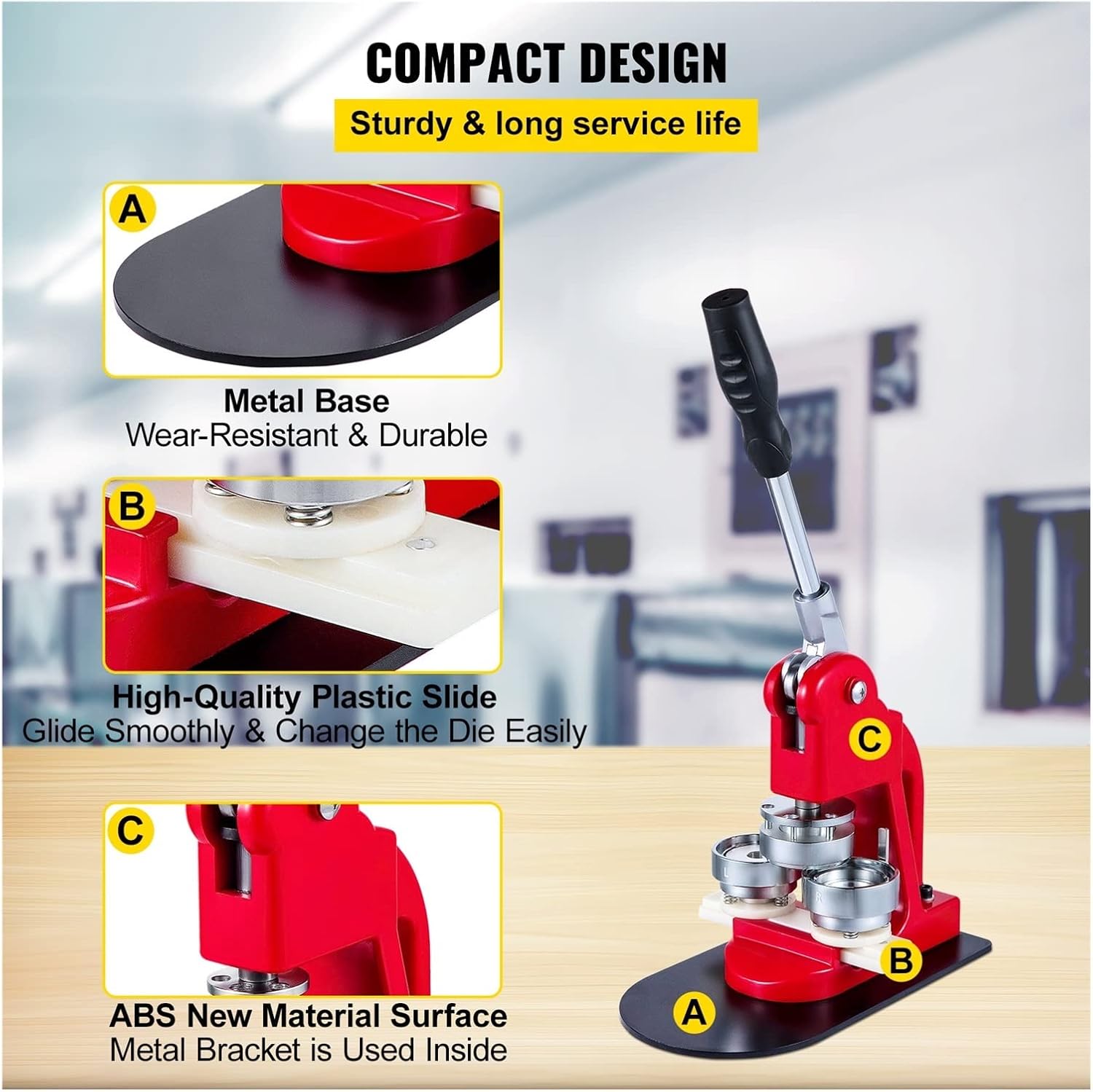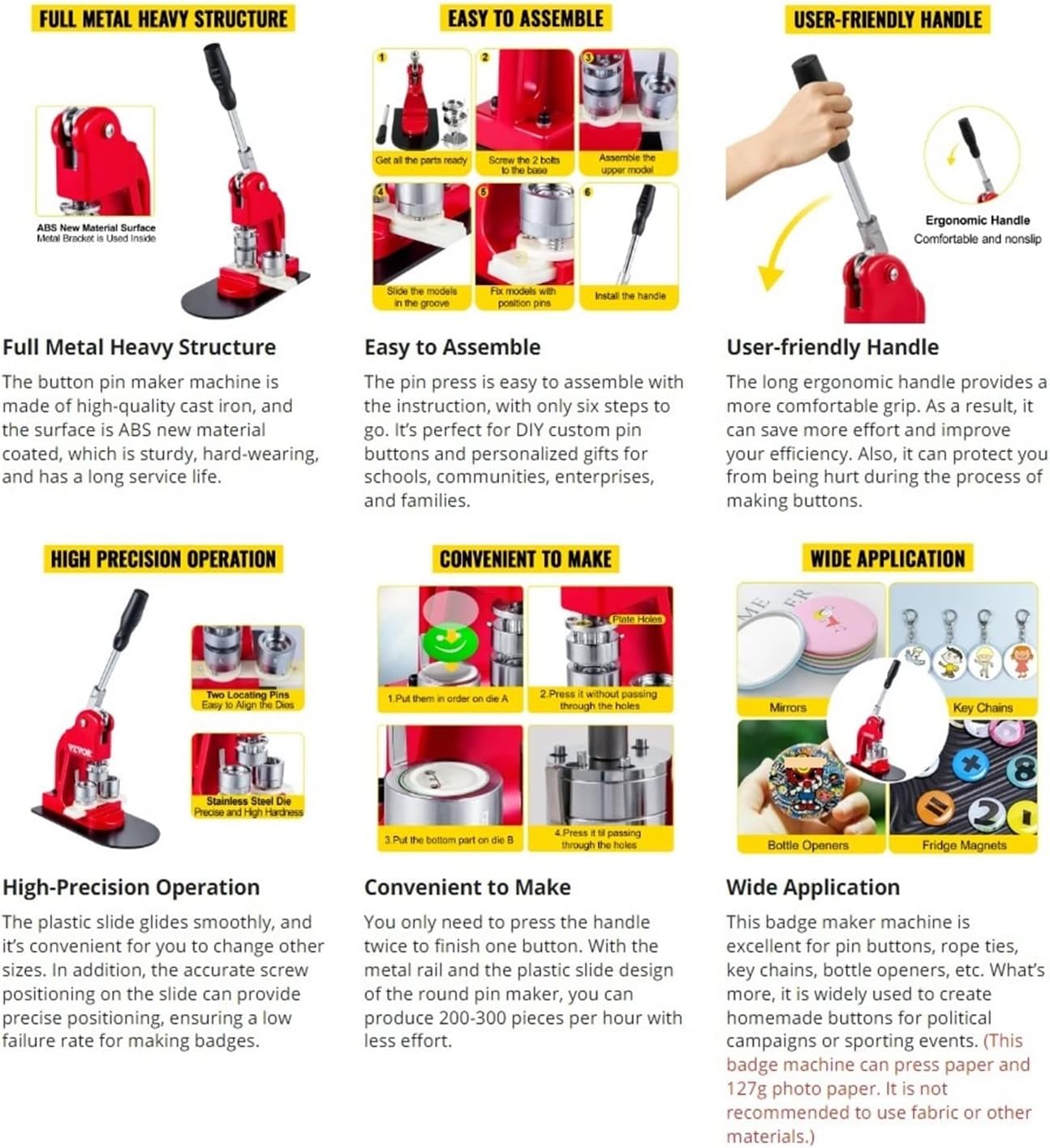 Struttura interamente in metallo, la macchina per la produzione di spille per bottoni è realizzata in ghisa di alta qualità e la superficie è rivestita con un nuovo materiale ABS, resistente all'usura e di lunga durata. Facile da montare, facile da premere, con istruzioni per il montaggio in soli sei passaggi. È perfetto per spille fai-da-te e regali personali per scuole, comunità aziendali e famiglie. Manico facile da usare Il lungo manico ergonomico offre una presa più comoda. Ciò può farti risparmiare più fatica e aumentare la tua efficienza. Inoltre, può proteggerti da lesioni durante il processo di creazione dei bottoni. Funzionamento ad alta precisione, lo scivolo in plastica scorre agevolmente e puoi passare facilmente ad altre dimensioni. Inoltre, la posizione precisa della vite sul cursore può fornire un posizionamento preciso, garantendo un basso tasso di fallimento nella realizzazione dei badge. Comodo da realizzare, basta premere due volte la maniglia per completare un tasto. Con il design della guida in metallo e dello scivolo in plastica del produttore di perni rotondi, puoi produrre 200-300 parti all'ora con il minimo sforzo.