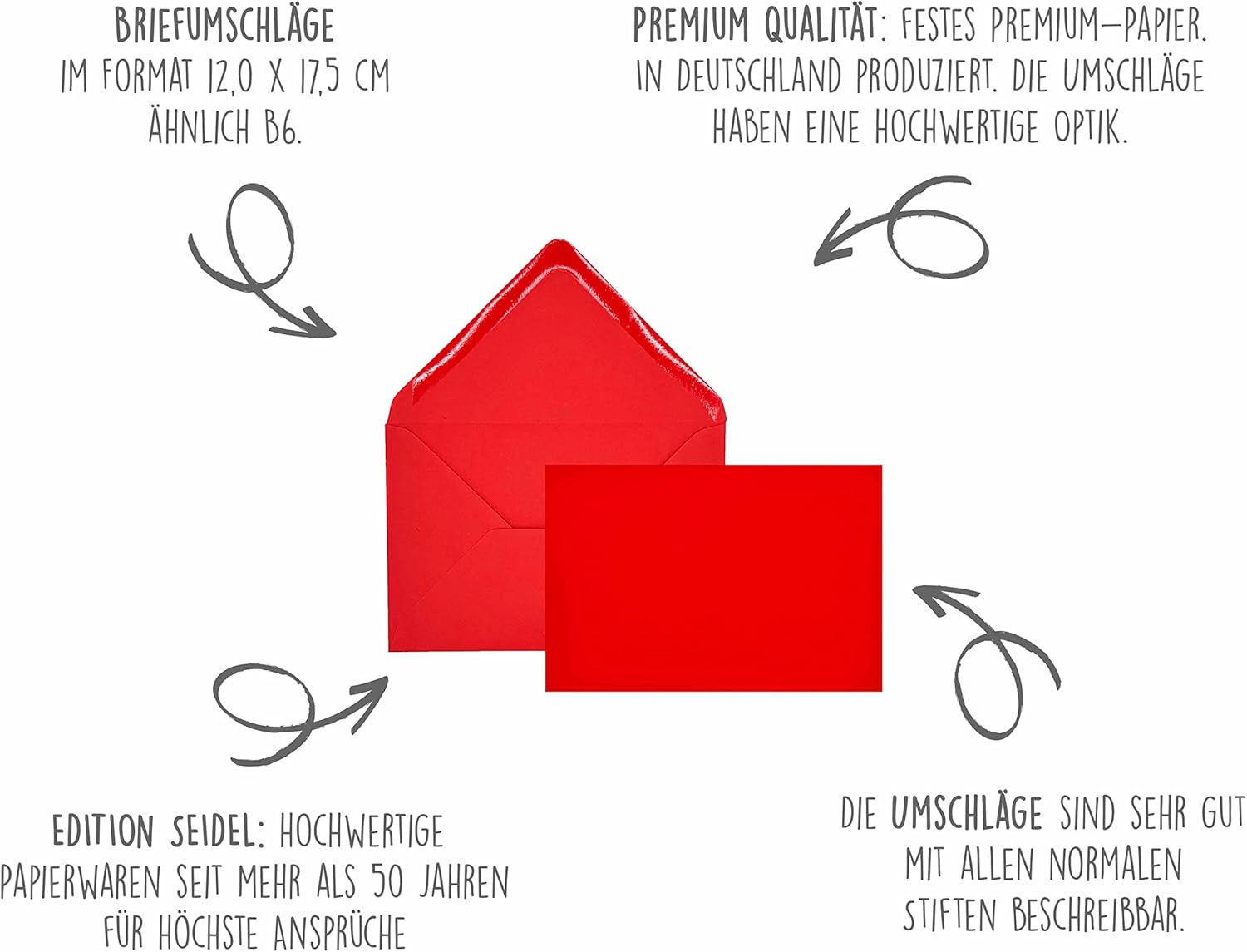 Incomparabili: buste di alta qualità con ottima lavorazione in un bel cartone animato. Alta qualità: il formato delle buste è di 12,0 x 17,5 cm, quindi simile a B6. La qualità della carta è di 80 g/m². Con chiusura a umido e gommatura, senza finestra. Marchio di qualità realizzato in Germania. Colori brillanti: la carta è completamente colorata e non sbiadisce. EDITION SEIDEL: Marchio di qualità con oltre 50 anni di tradizione.