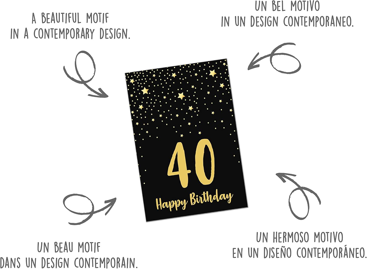⭐️ Incomparabile: un biglietto di auguri per il 40° compleanno di alta qualità. Bellissimo biglietto che esprime un apprezzamento speciale. ⭐️ ALTA QUALITÀ: la dimensione della carta è 11,5 x 17,0 cm. Il biglietto viene fornito con una busta colorata abbinata. Carta di alta qualità stampata in Germania. Stampa offset di alta qualità. Qualità superiore. Si tratta di un biglietto doppio/carta pieghevole senza testo interno. ⭐️ Design innovativo: il nostro giovane team creativo progetta le carte con tanto amore per un design bellissimo. ⭐️ Seidel Verlag ... stabiliamo le tendenze. Si prega di visualizzare anche le nostre altre carte e assortimenti. Grazie mille.