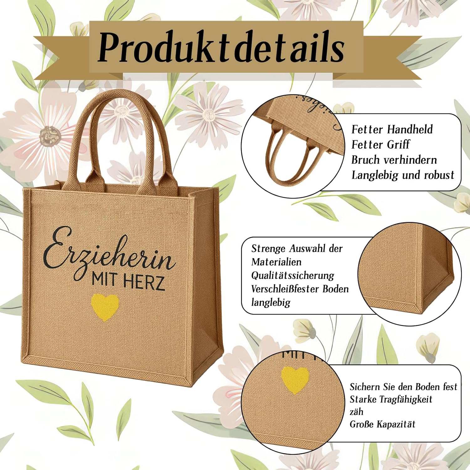 IDEA REGALO: regalo unico per il miglior insegnante - pratico per la vita di tutti i giorni e un ottimo compagno per le commissioni quotidiane MATERIALI NATURALI: shopper in iuta naturale e 100% tela di cotone DIMENSIONE PERFETTA: dimensioni 21 x 22 x 14 cm, la borsa è il compagno perfetto di tutti i giorni durante lo shopping o come una simpatica idea regalo PRATICO: facilmente ripiegabile e riponibile REGALO IDEALE: borsa di iuta come piccolo regalo perfetto o come piccolo regalo per insegnanti, educatori o l'evento a tema. Una simpatica idea regalo