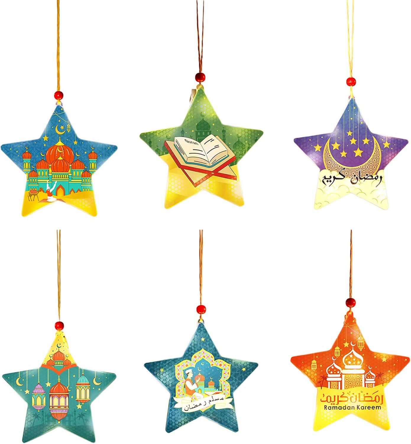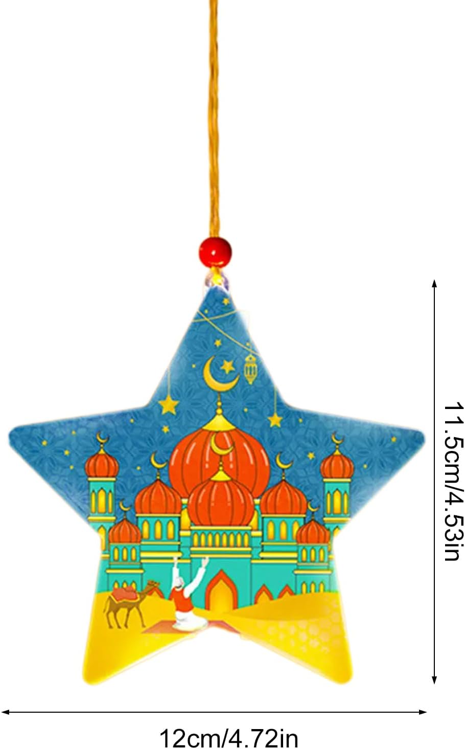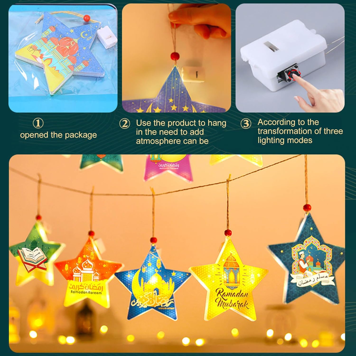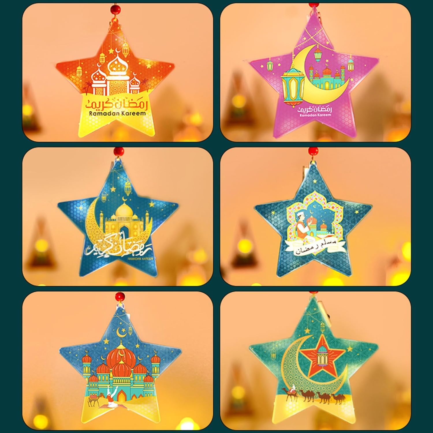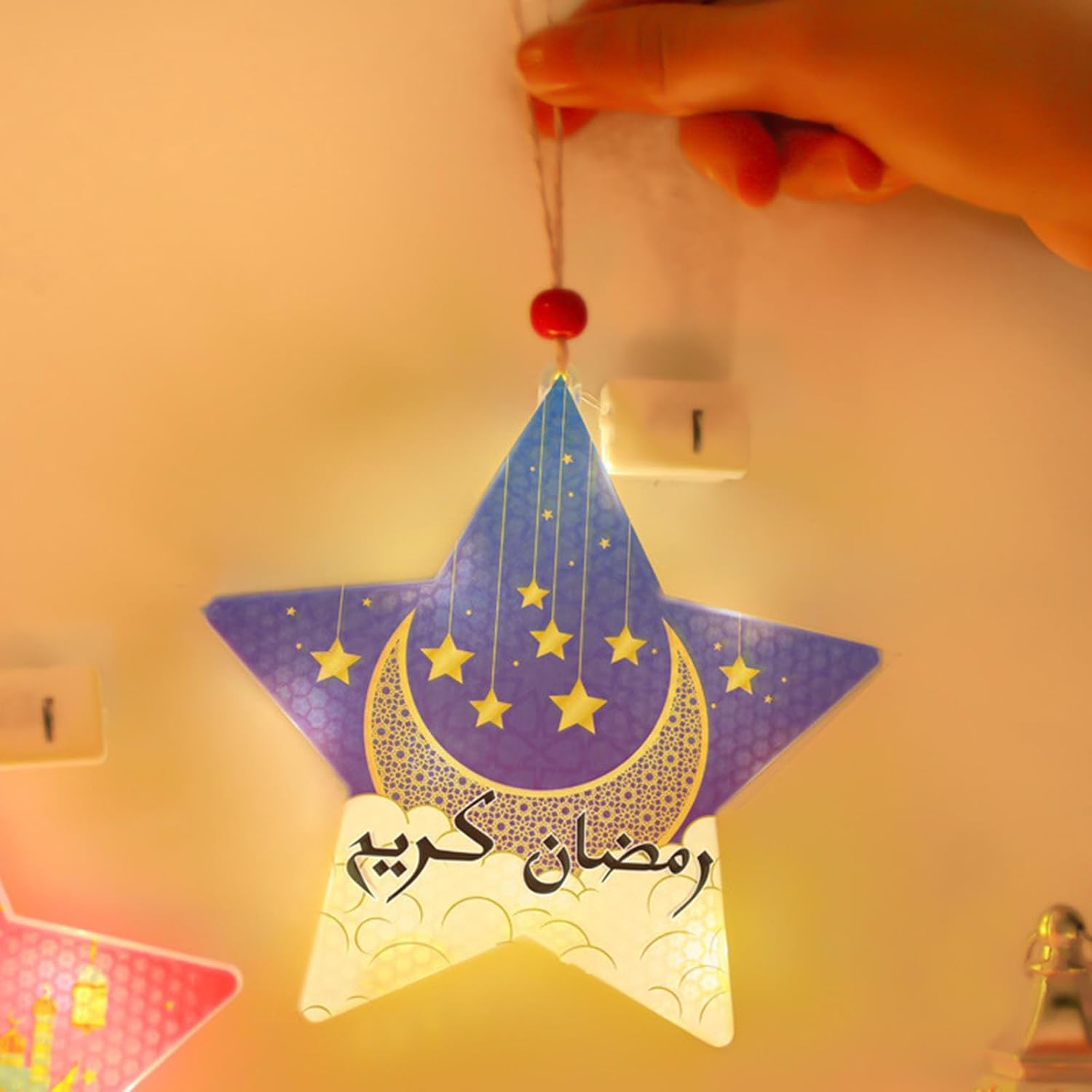 Perfettamente adatto per Eid e altre decorazioni per festival mediorientali, può essere utilizzato anche per matrimoni, anniversari, riunioni di famiglia o eventi speciali, aggiungendo un tocco di calore e invitante in qualsiasi ambiente Questa lampada decorativa a sospensione a forma di stella è ideale sia come centrotavola per feste che come regalo significativo Realizzata in PVC, questa lampada decorativa presenta una struttura stabile, leggera, garantendo durata e resistenza alla deformazione o alla rottura. 3 batterie LR44 alimentate (batterie non incluse) Migliora il tuo festival Eid con l'ornamento della lampada a LED a forma di stella, decorazione unica da appendere a LED che migliora il festival e aggiunge un tocco di eleganza alla tua celebrazione Eid Ideale per famiglie e persone che apprezzano la cultura araba e hanno bisogno di una lampada da scrivania decorativa unica