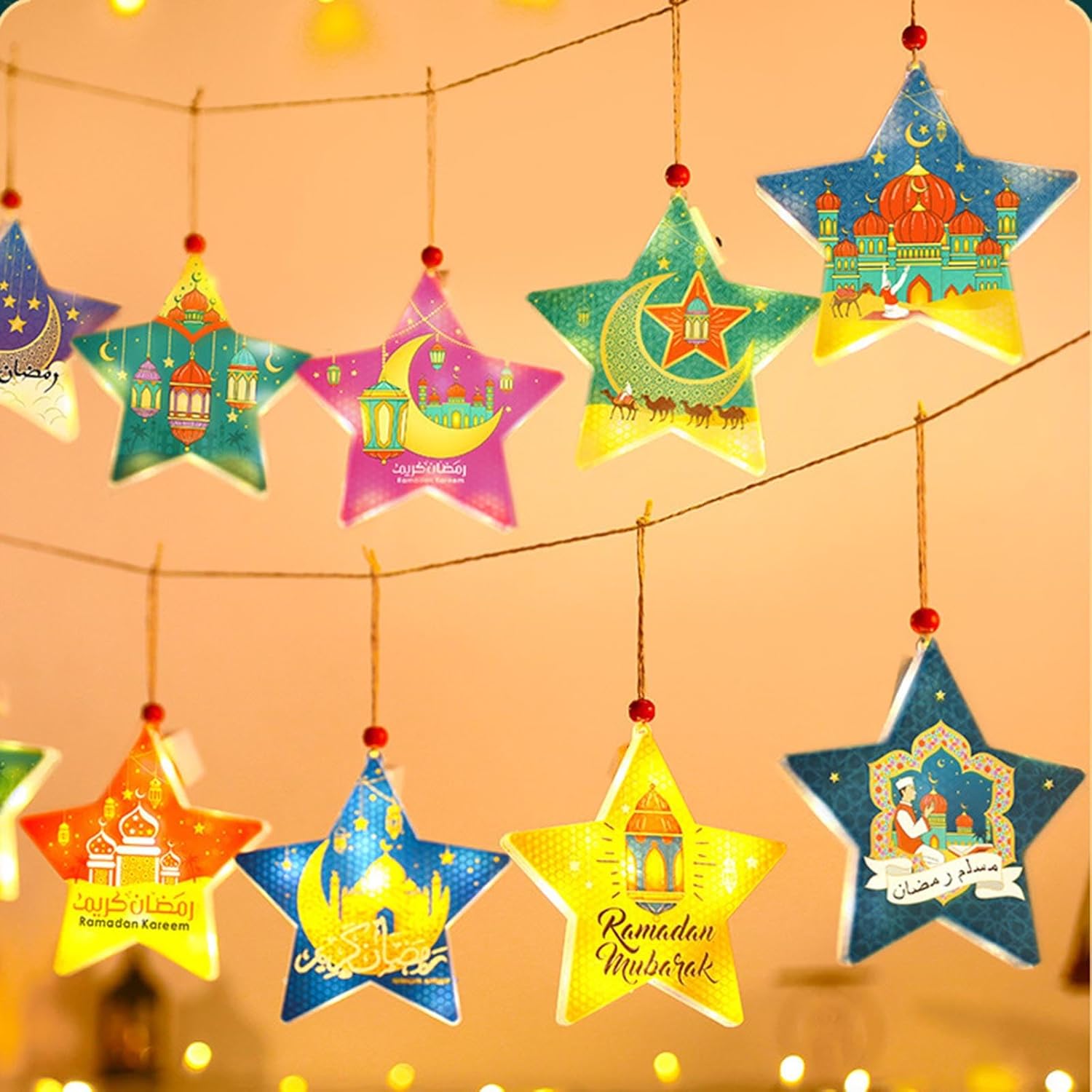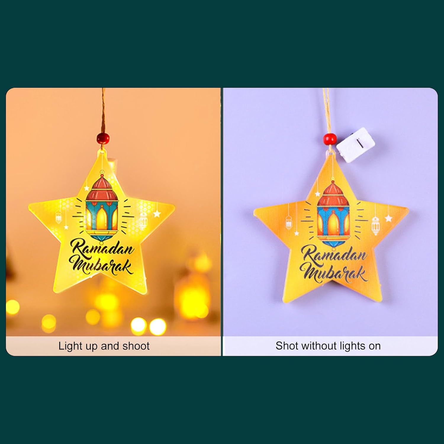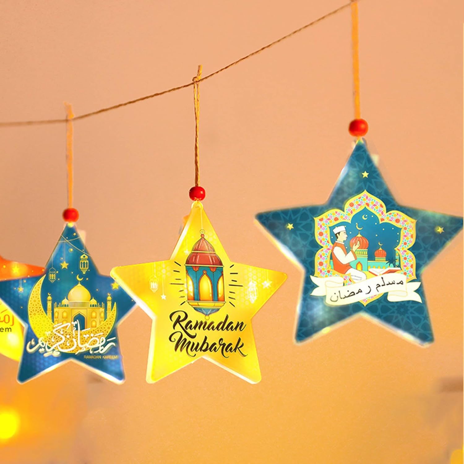 Perfettamente adatto per Eid e altre decorazioni per festival mediorientali, può essere utilizzato anche per matrimoni, anniversari, riunioni di famiglia o eventi speciali, aggiungendo un tocco di calore e invitante in qualsiasi ambiente Questa lampada decorativa a sospensione a forma di stella è ideale sia come centrotavola per feste che come regalo significativo Realizzata in PVC, questa lampada decorativa presenta una struttura stabile, leggera, garantendo durata e resistenza alla deformazione o alla rottura. 3 batterie LR44 alimentate (batterie non incluse) Migliora il tuo festival Eid con l'ornamento della lampada a LED a forma di stella, decorazione unica da appendere a LED che migliora il festival e aggiunge un tocco di eleganza alla tua celebrazione Eid Ideale per famiglie e persone che apprezzano la cultura araba e hanno bisogno di una lampada da scrivania decorativa unica