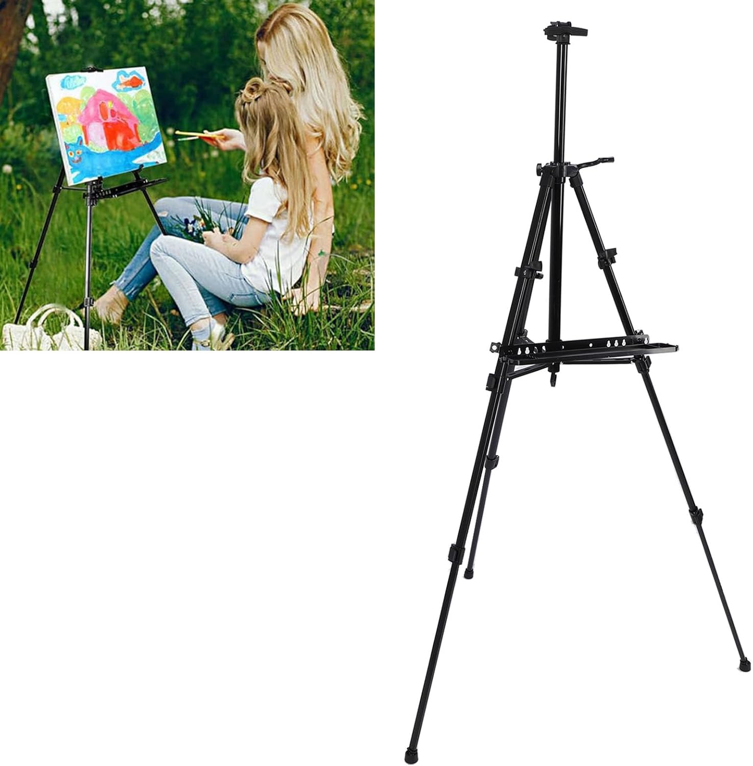 Sturby Construction: realizzato con materiali in metallo premium, questo cavalletto è costruito per durare, fornendo supporto affidabile a tutti i tuoi progetti artistici. La base è progettata presa migliorata, garantendo stabilità mentre si dipinge all'aperto. Design versatile: è dotato di un design multifunzionale, che lo rende adatto non come supporto per la pittura ma anche come display pubblicitario e portapacchi, garantendo che soddisfi varie esigenze durante le attività creative, sia all'interno che all'esterno. Stabilità: progettato con una struttura triangolare, questo cavalletto fornisce un supporto stabile che riduce significativamente il rischio di rovesciamento. Il gancio centrale è utile per borse appese o altri oggetti ponderati per aumentare la stabilità del cavalletto. Portatile, conveniente: il suo design pieghevole consente una facile conservazione e trasporto, rendendolo strumento pratico per gli artisti in viaggio. La manopola facile da girare può regolare rapidamente l'altezza e l'angolo. Paradone: lo stand di pittura artistica è dotato di un piccolo vassoio per posizionare pennelli, matite e altri strumenti, garantendo che il tuo spazio di lavoro rimanga organizzato ed efficiente.