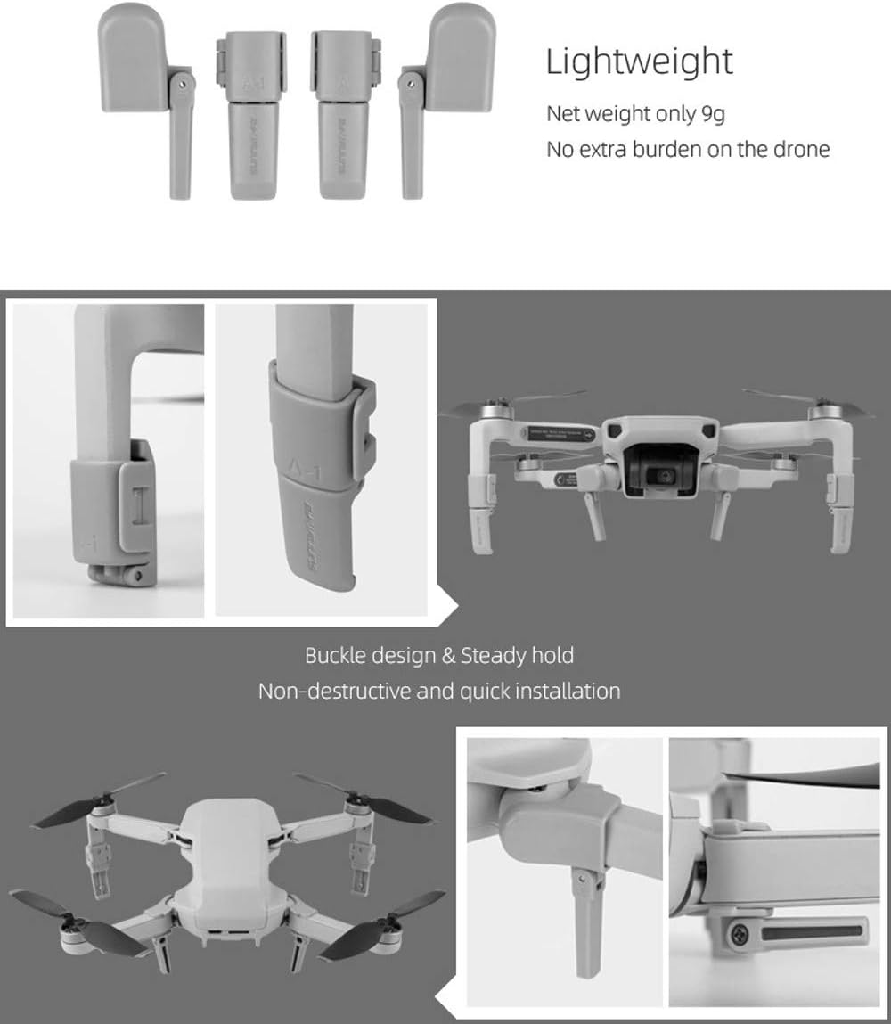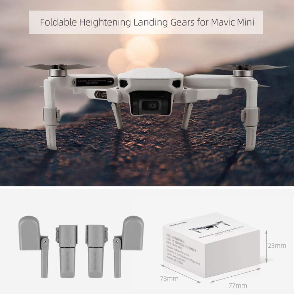 3. Leggero: peso netto 9 g, nessun carico aggiuntivo sul drone Altezza aumentata di 2,2,5 cm: altezza effettiva aumentata di 25 mm per drone e fotocamera cardanica mantenere drone e giunto cardanico puliti e durante l'atterraggio Silicone morbido, buona elasticità, alto assorbimento, nessun danno al corpo Carrello di atterraggio 4 pezzi 1. Carrello di atterraggio pieghevole: non c'è bisogno di attrezzi di atterraggio quando si piega Mavic Mini, senza smontare il carrello di atterraggio Mavici Mini nella custodia originale e riporre Mavici Mini in borsa Sunnylife