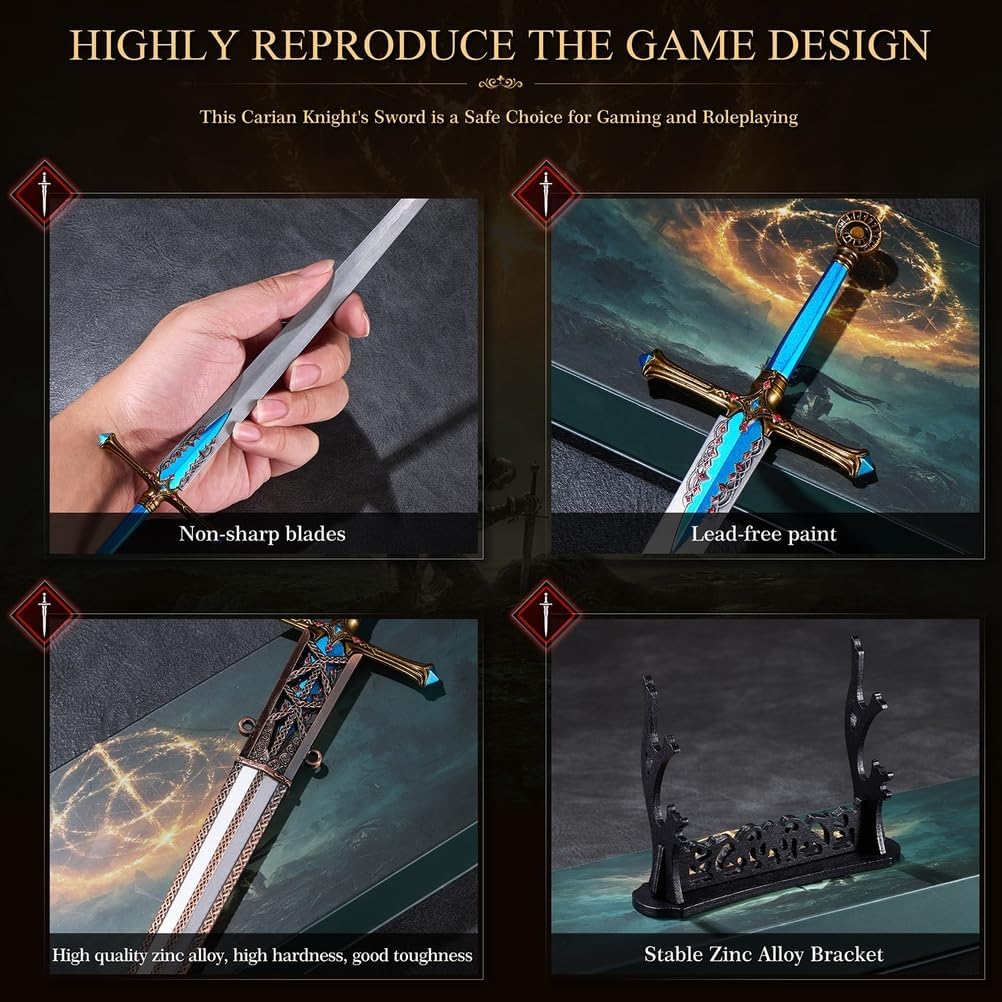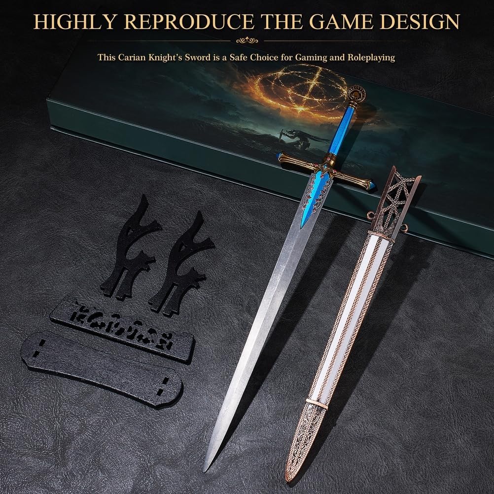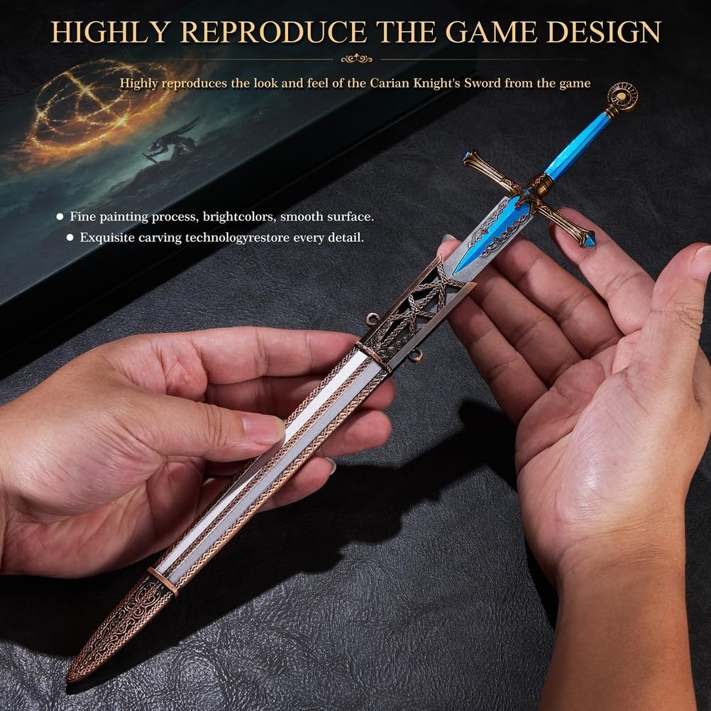 Replica della Spada del Cavaliere di Caria di Elden Ring: immergiti nel mondo mistico delle Terre di Mezzo con questo modello di Spadone finemente dettagliato, ispirato ai leggendari cavalieri di Caria. Un pezzo pregiato del merchandising di Elden Ring, ricrea fedelmente il fascino fantasy dell'arma del gioco, rendendolo un oggetto da collezione Soulslike essenziale per fan e giocatori. Costruzione in lega di zinco di alta qualità: forgiata in resistente lega di zinco antiruggine, questa mini spada interamente in metallo è realizzata per durare a lungo. La struttura solida e i dettagli intricati le conferiscono l'aspetto di una vera arma fantasy, pur rimanendo un giocattolo da collezione sicuro o una decorazione da scrivania. Esposizione versatile e decorazione fantasy: perfetta come ornamento da scrivania, elemento decorativo per librerie o come sorprendente decorazione per sale giochi, questa replica conferisce un'audace estetica medievale a qualsiasi ambiente. Che sia esposta su un supporto o integrata in un arredamento fantasy da ufficio, impreziosisce ogni collezione con eleganza e cura dei dettagli. Scelta da collezionista e regalo per gamer: progettata pensando agli appassionati di oggetti da collezione dedicati al gaming, questa Spada del Cavaliere Cariano è più di un semplice modello: è un pezzo forte. Ideale come regalo per collezionisti, fan degli anime o chiunque ami i mondi fantasy, può anche essere utilizzata come tagliacarte unico, aggiungendo un tocco pratico al suo valore collezionabile. Perfetta per i fan di Shadow of the Erdtree: un'aggiunta eccezionale al tuo set ispirato a Nightreign o a un'espansione, questa replica unisce tradizione, arte e passione. È il regalo ideale per le community di gamer che desiderano mostrare con orgoglio la propria devozione all'Anello di Elden.