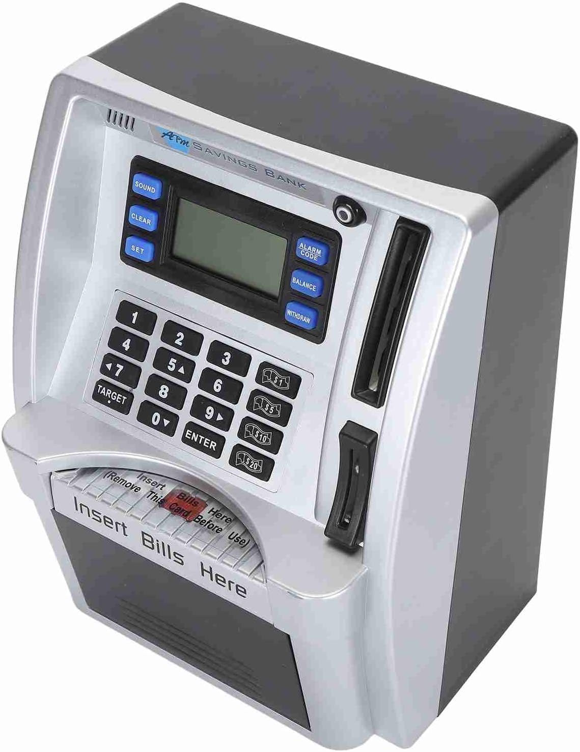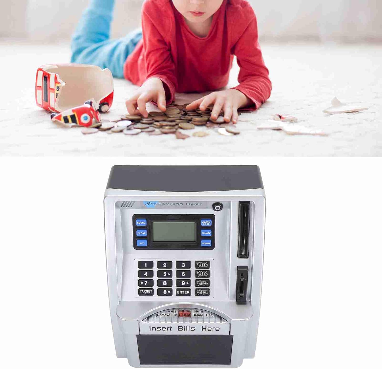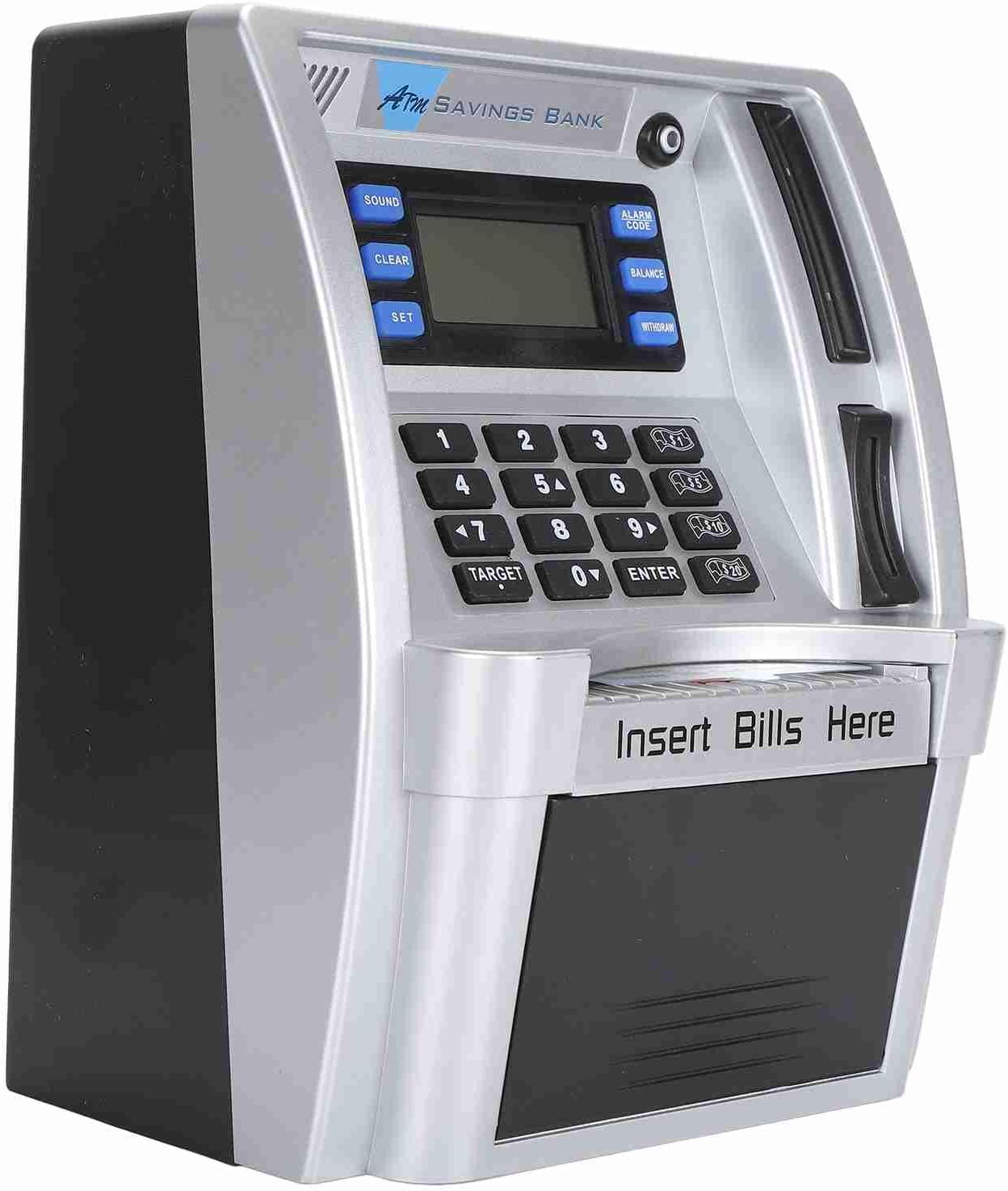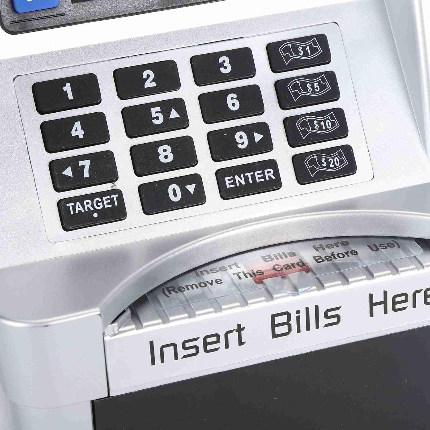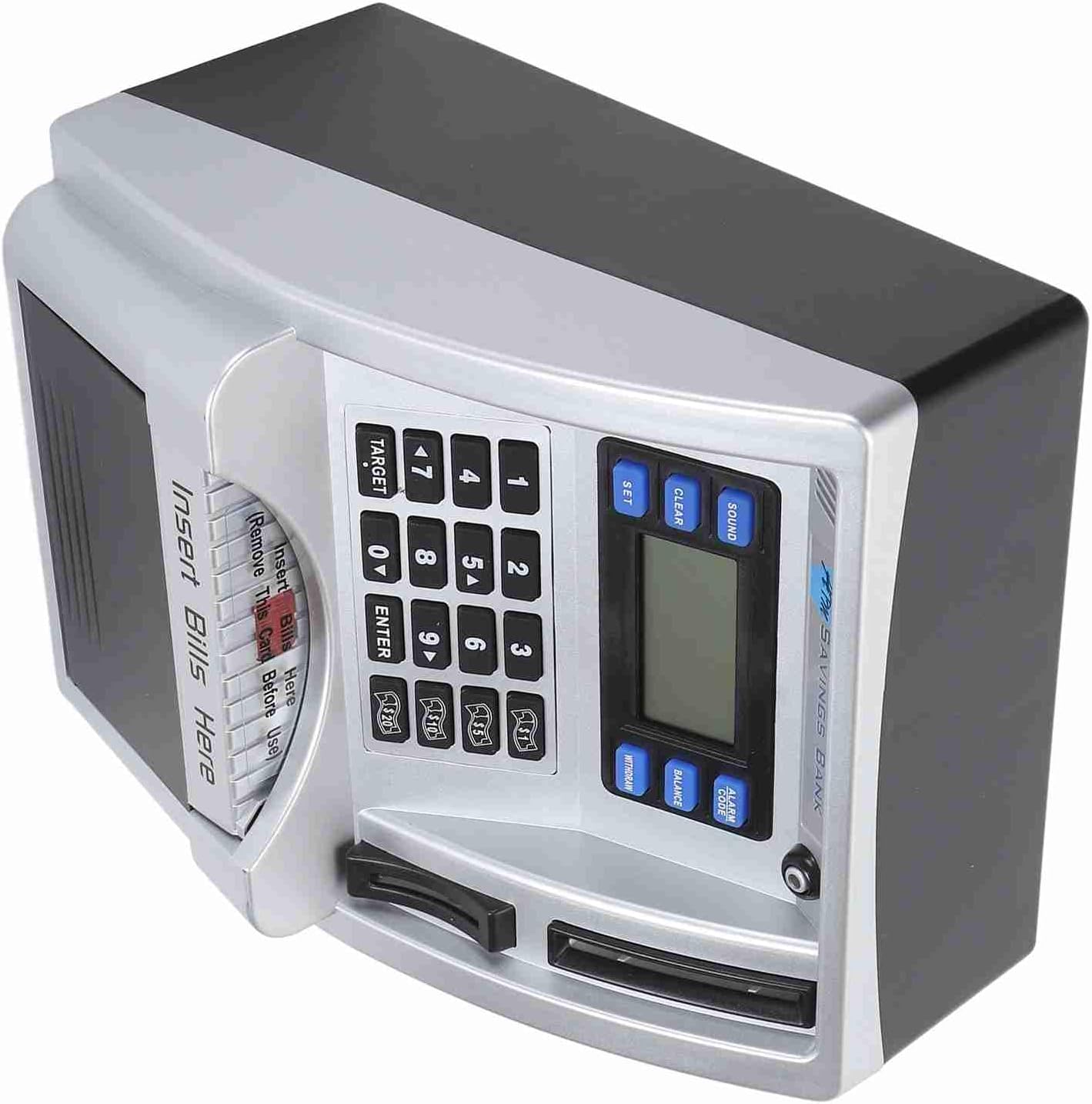 [Esperienza ATM realistica] Questo Piggy Bank imita le macchine bancomat del mondo reale, complete di istruzioni vocali e uno schermo LCD per visualizzare e tracciare le transazioni di denaro, rendendolo uno strumento divertente ed educativo per i bambini. [Identificazione delle monete] Il mazzetto elettronico atmosfera presenta il riconoscimento automatico delle monete, aiutando i bambini a tenere traccia dei loro risparmi calcolando accuratamente ciascuna moneta inserita nello slot. [Gestione automatica delle fatture] Con una tastiera di input di note e input manuali, questo Piggy Bank ATM può attirare automaticamente i soldi della carta e consentire ai bambini di inserire importi di prelievo e deposito, promuovendo l'alfabetizzazione finanziaria tra i bambini. [Impostazione degli obiettivi] I bambini possono stabilire obiettivi di risparmio fino a 9999,99 su questo Piggy Bank, insegnando loro concetti essenziali di pianificazione finanziaria e consentendo loro di monitorare i progressi verso il loro obiettivo. [Codice PIN sicuro] Il Piggy Bank ATM offre un alto livello di sicurezza con un di codice PIN modificabile che può essere facilmente ripristinato se dimenticato, garantendo che i risparmi per i bambini siano mantenuti al sicuro.