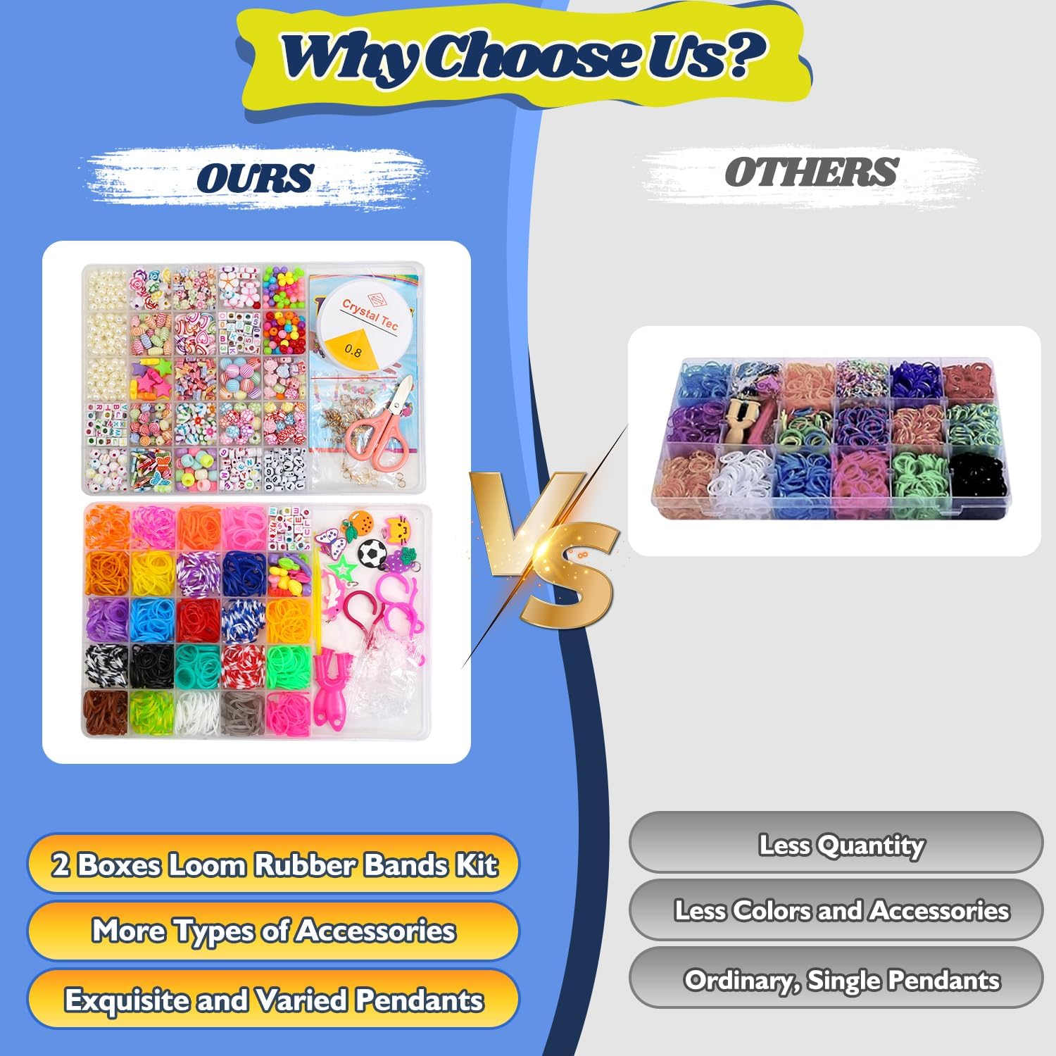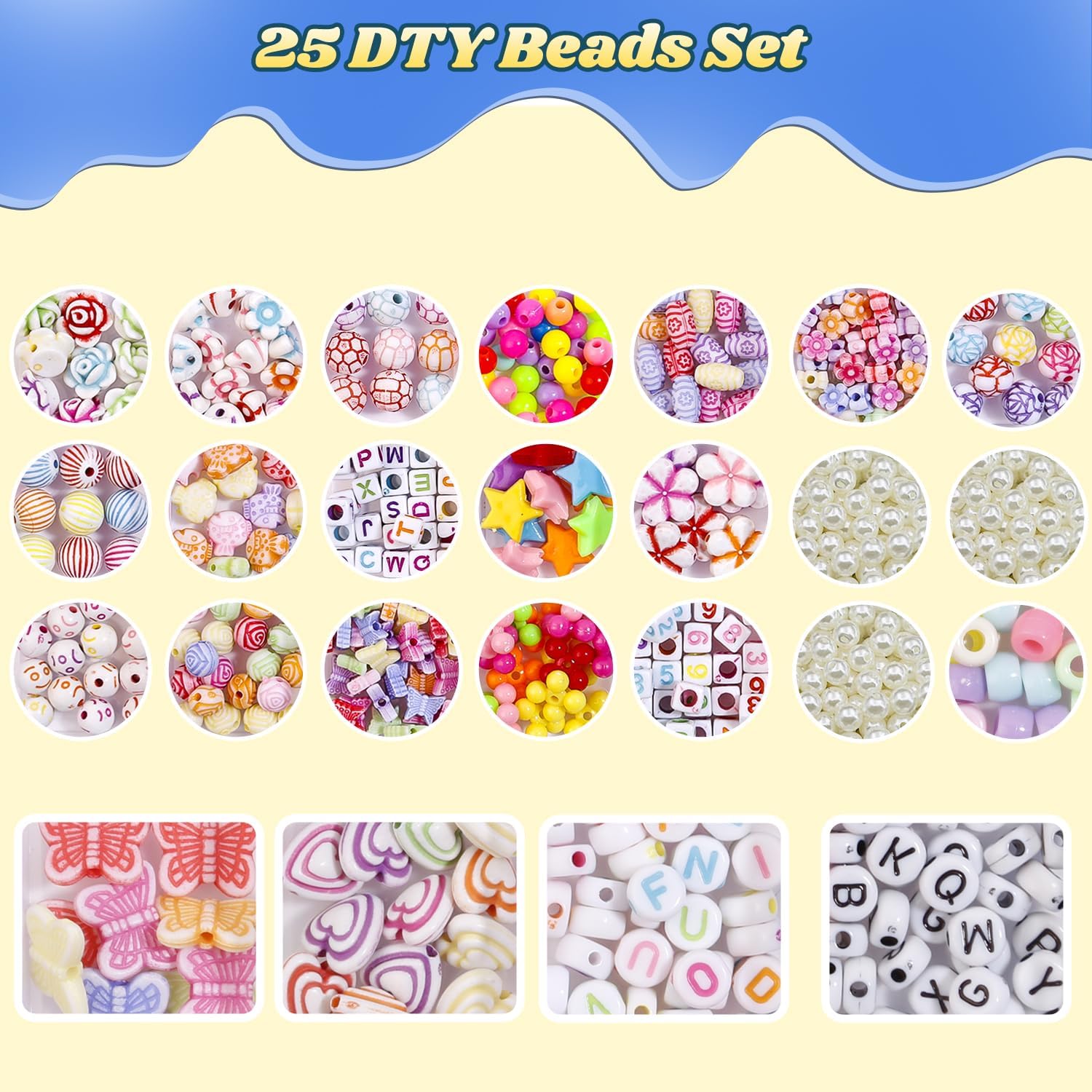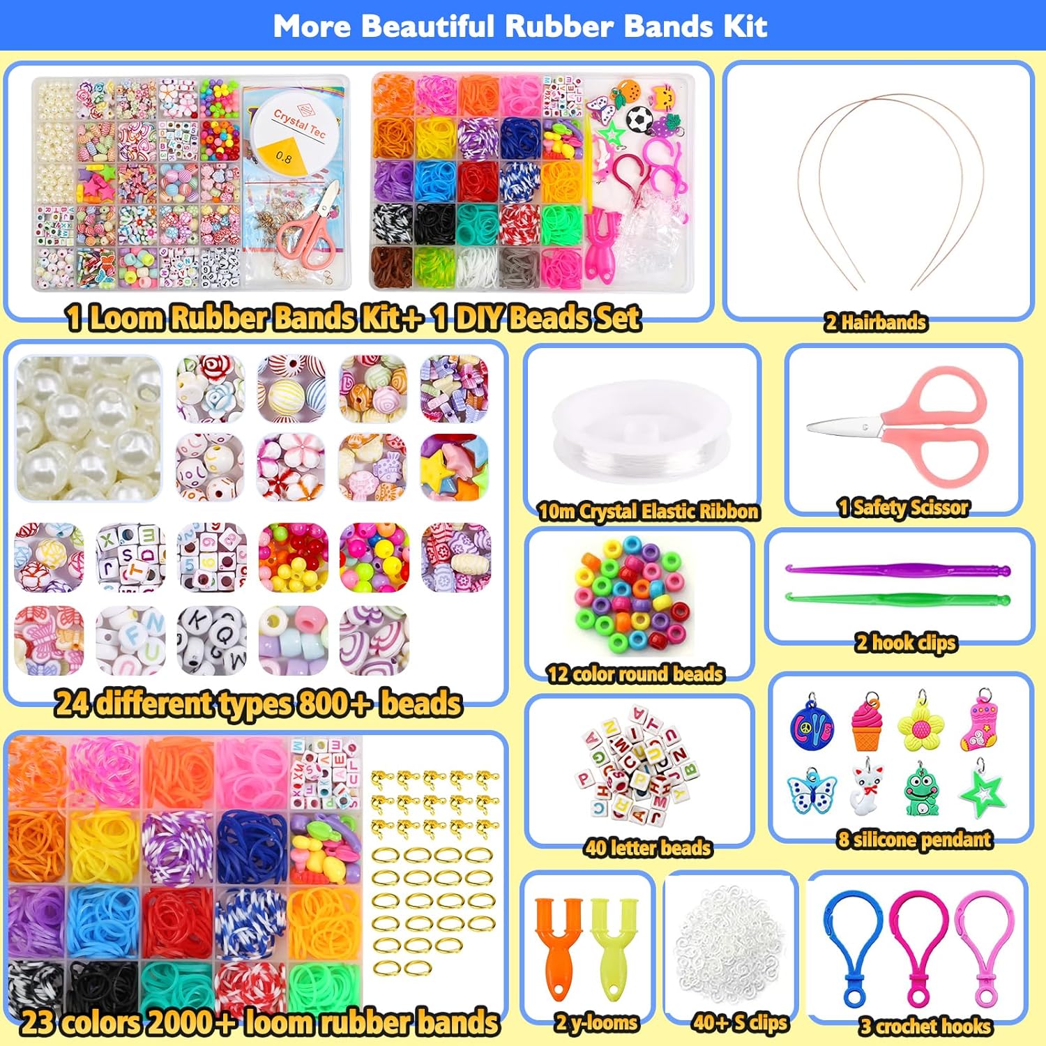 | Componenti inclusi | 2000+ elastici colorati, 40 griglia, 40 perline con lettere, 8 ciondoli in silicone, 15 perline rotonde colorate, 8 perline di frutta, 2 telai a Y, 2 uncinetti, 2 clip a gancio, 40 clip a S, nastro elastico in cristallo da 10 m, forbici di sicurezza per bambini, 4 anelli pendenti, 5 fermagli per braccialetti, 5 fermagli per collana, 2 fasce per capelli in filo metallico, oltre 550 perline in diversi colori e forme, 24 diverse forme di perline in 24 scomparti |