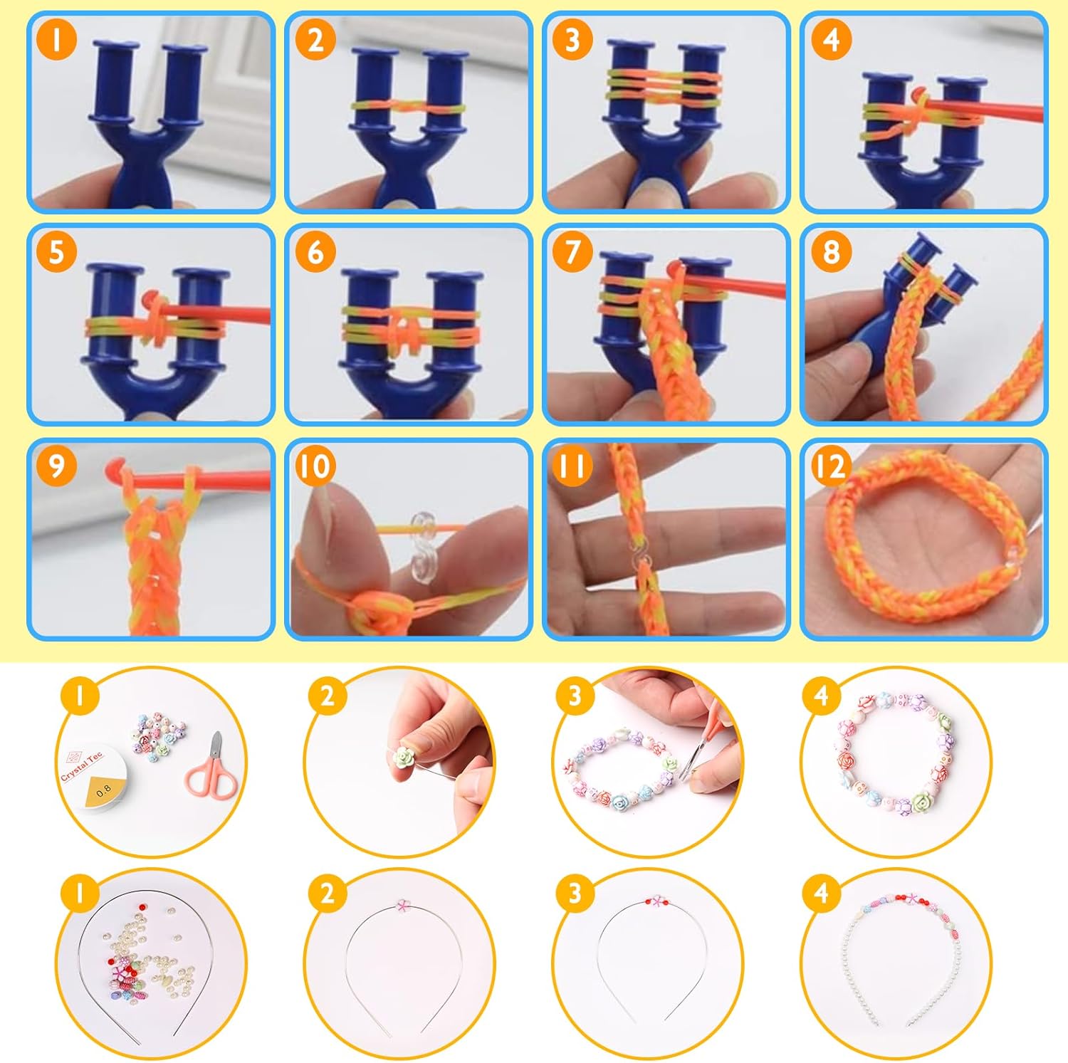 Elastici per braccialetti: lo starter kit di fasce per telaio fai-da-te può coltivare la creatività e la concentrazione dei bambini, possono utilizzare accessori diversi per creare molte cose interessanti e belle, come bracciali fatti a mano, collane, bambole, fasce per capelli, ornamenti appendini per borse e altre decorazioni, che è un'esperienza molto divertente per allontanare i bambini dall'elettronica mentre puoi realizzare bellissimi mestieri fai-da-te per bambini come regali Kit perline fai da te per Bambini: il kit telaio è un giocattolo per il tempo libero perfetto, con il quale i bambini possono identificare colori, imparare lettere, braccialetti fai-da-te, gioielli, migliorare le loro abilità pratiche, ed è anche un'attività popolare genitore-figlio per creare calore e supporto relazioni. Set di perline per bambini una scelta eccellente per gli amanti dell'artigianato fai-da-te per bambini e adulti. adatto per la festa dei bambini, natale, pasqua, capodanno,