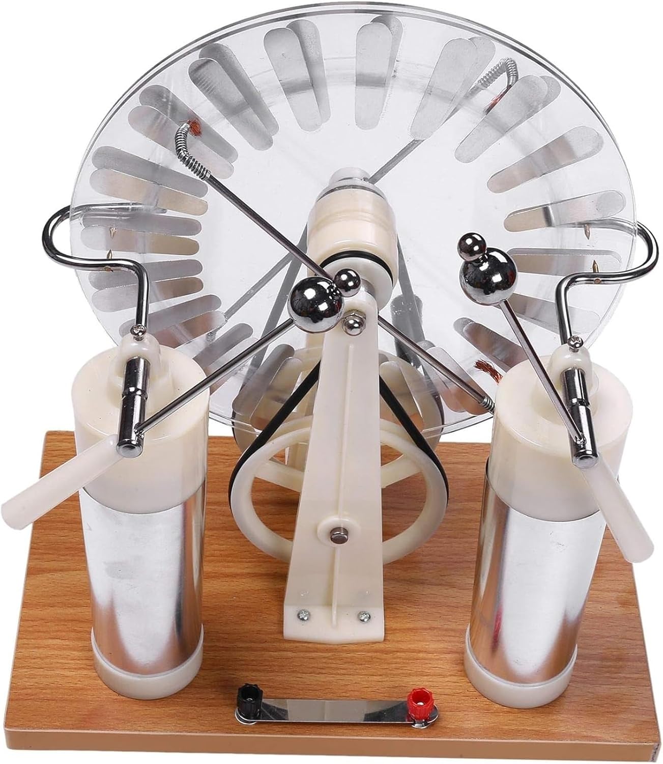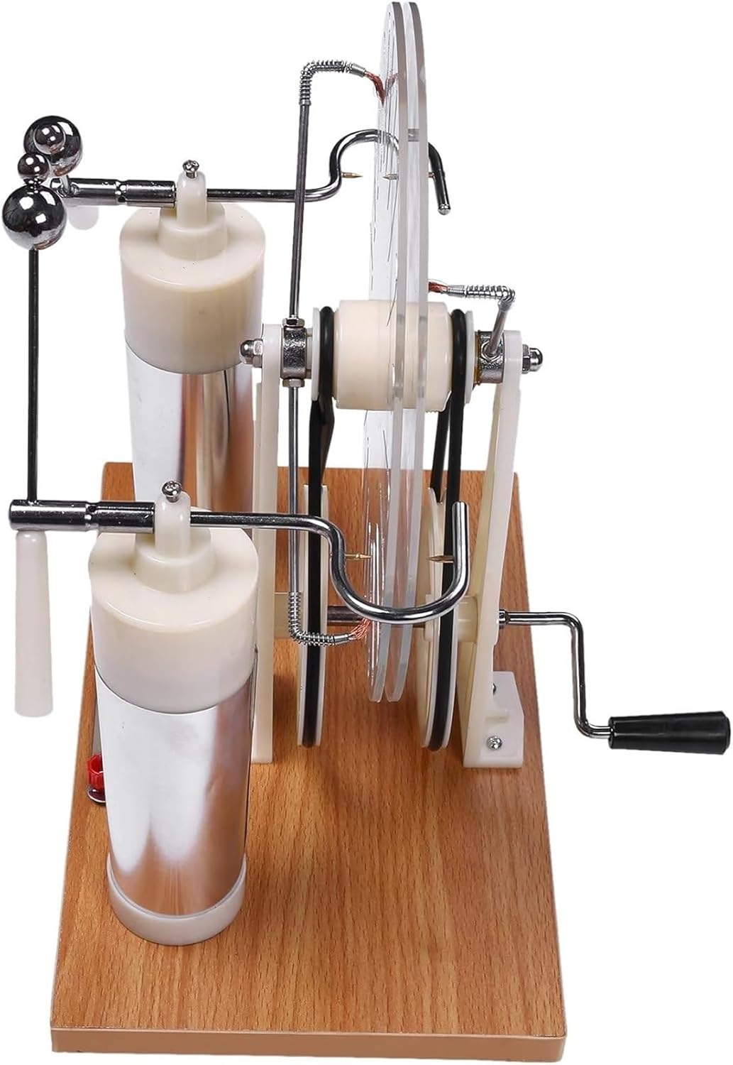 Questo generatore sfrutta l'effetto di induzione per produrre elettricità statica: quando due elettrofori girano, il sistema carico, in particolare la parte a sfera sulla forcella di scarica dotata di maniglia isolata, raccoglierà molte cariche elettriche diverse. Migliora le prestazioni di generazione di elettricità statica e può generare elettricità statica anche in climi umidi e giornate piovose. Lo strato conduttivo della piastra conduttiva è rivestito con materiale conduttivo, il rivestimento è solido, durevole e supera le carenze che il foglio di alluminio è facile da staccare. Questo generatore sfrutta gli effetti induttivi per generare elettricità statica quando le due vasche elettriche girano, in particolare le parti sferiche della forcella di scarica con un'impugnatura isolante, raccolgono cariche significativamente diverse. Può essere utilizzato anche per una serie di esperimenti, come l'induzione statica, la scarica a scintilla, la scarica puntiforme, la variazione di capacità di un condensatore (vedere la bottiglia di Leida in un generatore). Viene utilizzato negli esperimenti elettrostatici per ottenere grandi quantità di carica e tensioni elevate di circa decine di migliaia di volt in combinazione con altri strumenti per esperimenti sulla distribuzione della carica su superfici conduttrici, linee elettriche o campi elettrostatici.