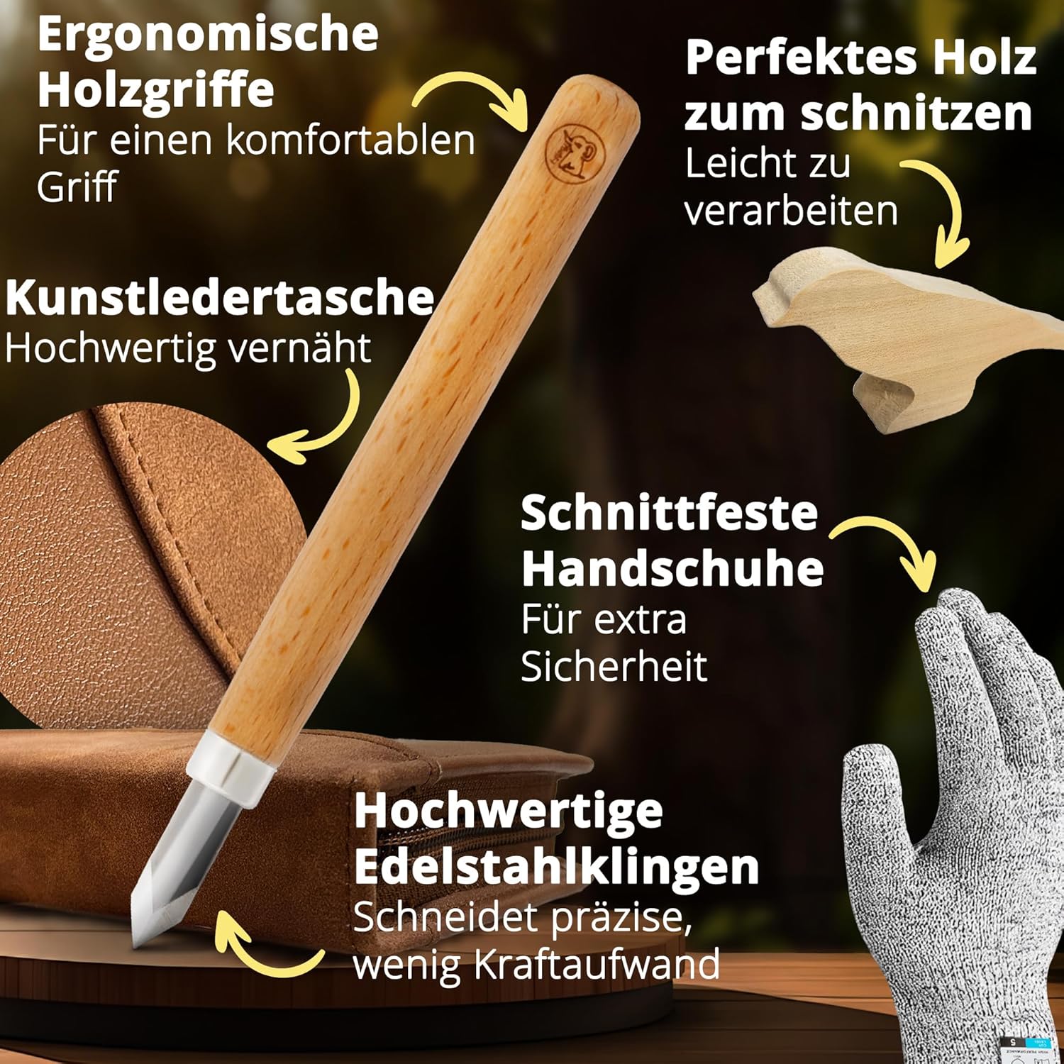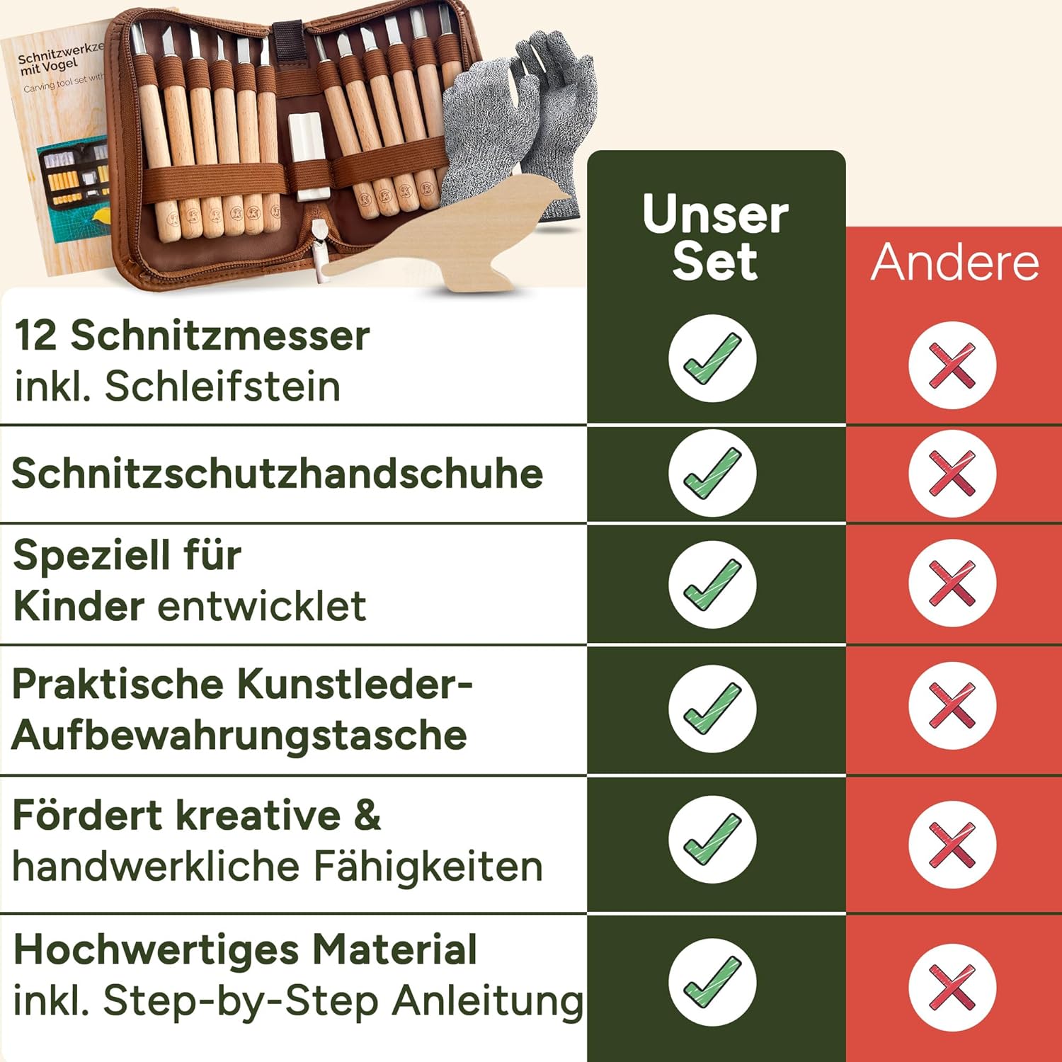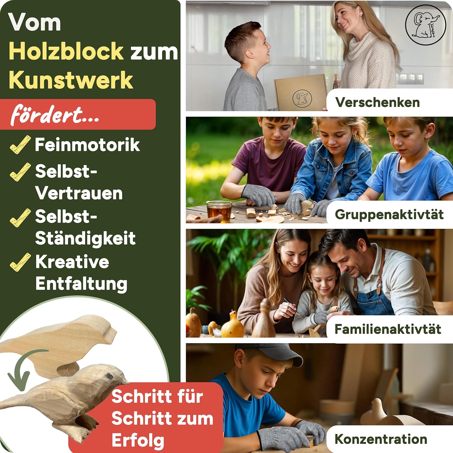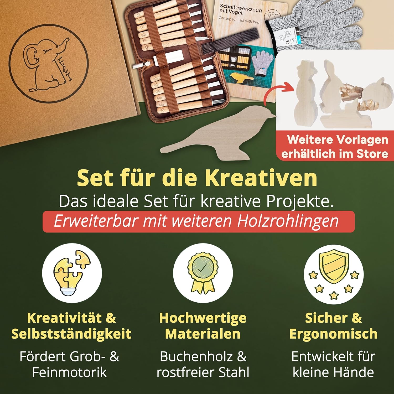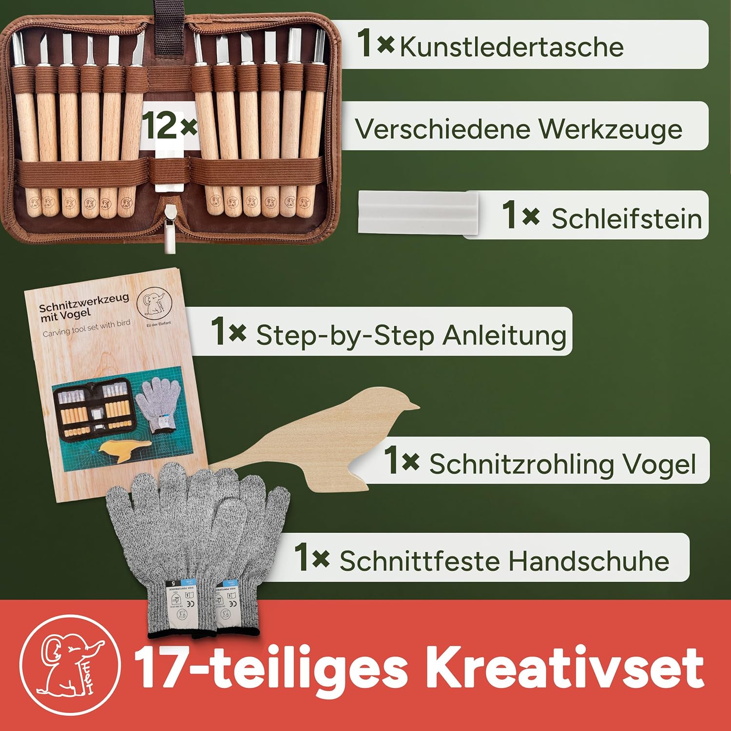 Utensile in legno completo: 12 utensili da intaglio di alta qualità con protezione della lama e manico ergonomico in legno con guanti da intaglio, pietra per affilare, pratica custodia e istruzioni passo per l'intaglio step, l'inizio è molto facile – Il set contiene un pezzo vuoto in legno di tiglio con motivo uccello, ideale per praticare e creare. Regalo forte – Regalo perfetto per ragazzi e ragazze per il compleanno o per la festa dei bambini – Fai brillare il tuo bambino – che il set per principianti è perfetto ovunque. Il set di coltelli da intaglio Eli ha un design adatto ai bambini con colori e materiali naturali. Il set di attrezzi per bambini è ideale a partire da 8 anni a 12 anni. Sicurezza per i bambini: con guanti antitaglio con protezione antitaglio europeo livello 5. L'affilatura della lama ben studiata e la lavorazione robusta offrono una protezione ottimale per i piccoli principianti dell'intaglio. La sicurezza è importante e quindi è indispensabile una affilatura ragionevole della lama degli strumenti da intaglio. Alta qualità: le lame robuste e inossidabili in acciaio inox – manici in legno antiscivolo e la lavorazione sicura garantiscono un divertimento duraturo – Gli strumenti sono adatti per destrimani e mancini. Ideale per progetti creativi di intaglio e per iniziare a intagliare in modo sicuro – Idea regalo perfetta Ideale per esterni e hobby: perfetto per avventure nel bosco. I progetti artigianali per il campeggio a casa promuovono la creatività, il pensiero logico e la consapevolezza di sé. Grazie alla gioia di intagliare, il bambino trascorre meno tempo davanti allo schermo e più tempo nella natura. I bambini imparano e migliorano le capacità motorie, concentrazioni e consapevolezza con il coltello Montessori