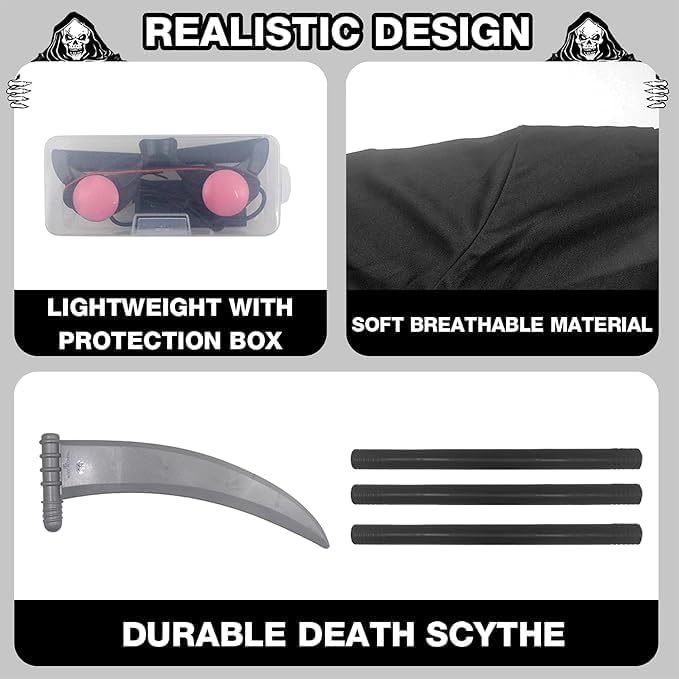 ???? Este disfraz trae todo lo que necesitas para un look espeluznante: capa, guadaña, máscara y guantes brillantes. ???? La guadaña es de plástico, pero tiene un diseño muy logrado y es completamente segura. ???? El material de la capa es cómodo y ligero, perfecto para llevar durante toda la fiesta. ???? La máscara y los guantes brillan en la oscuridad, lo que añade un toque aún más aterrador. ???? En general, es un disfraz sencillo pero efectivo para cualquier evento de Halloween.