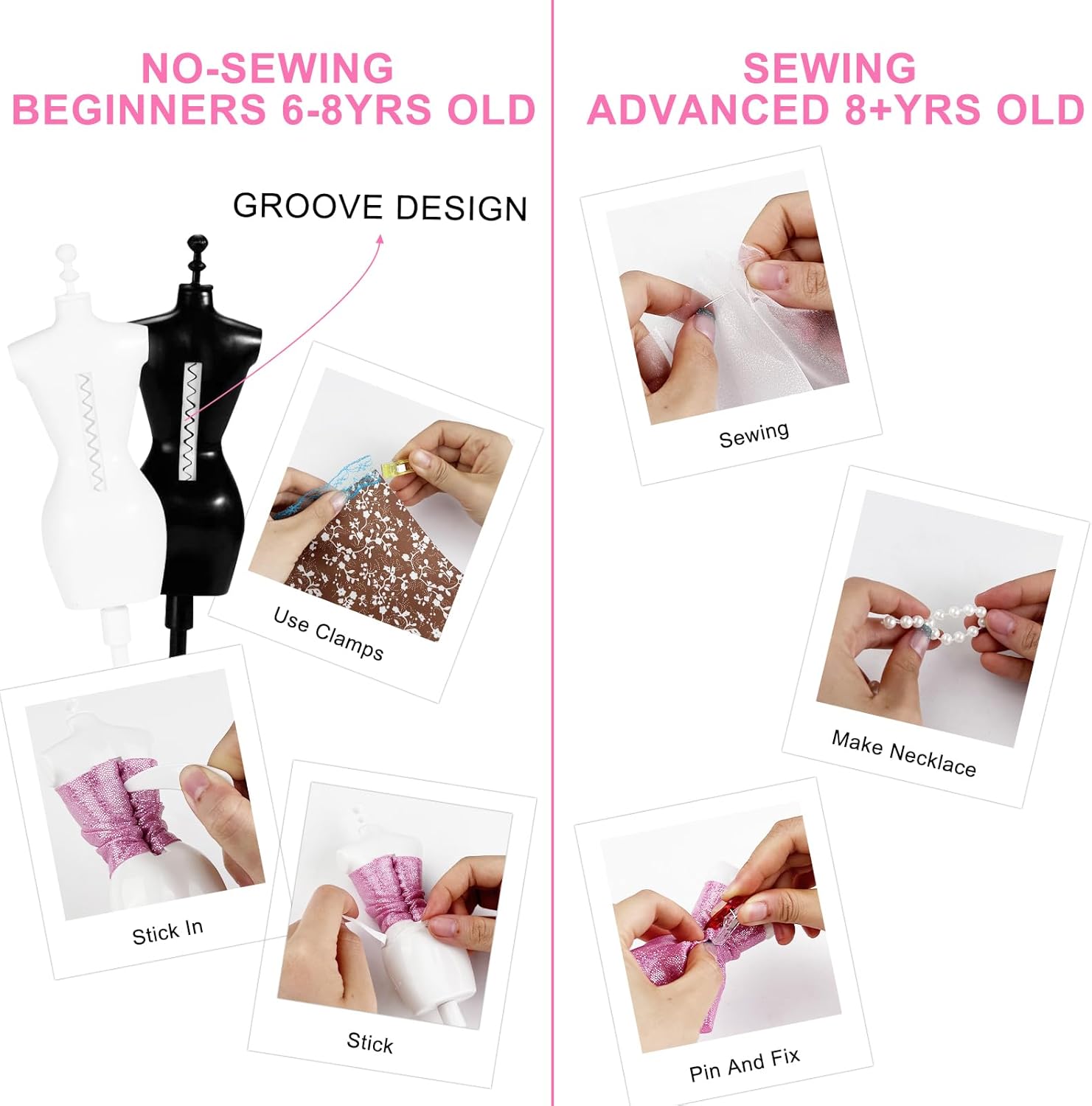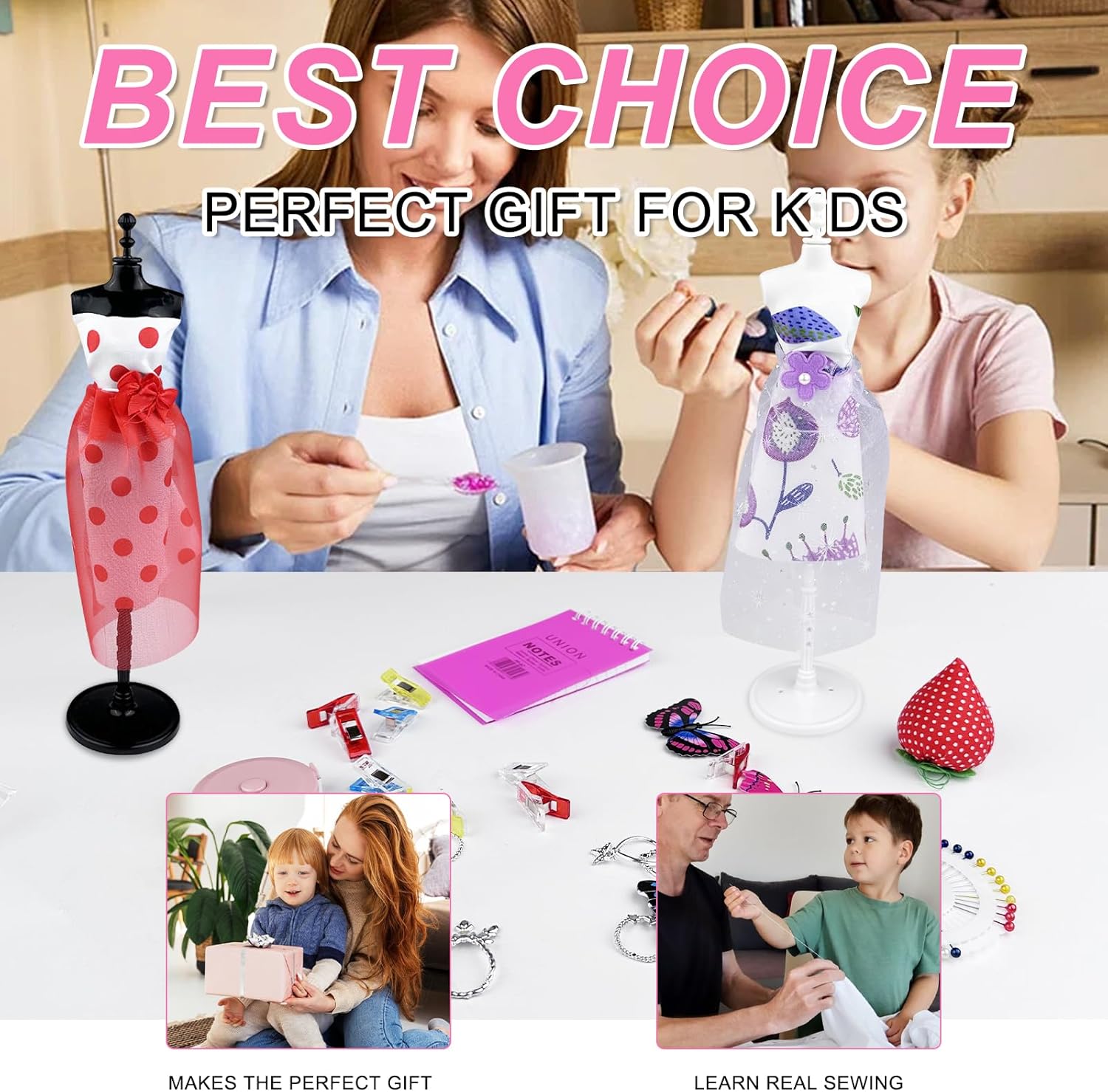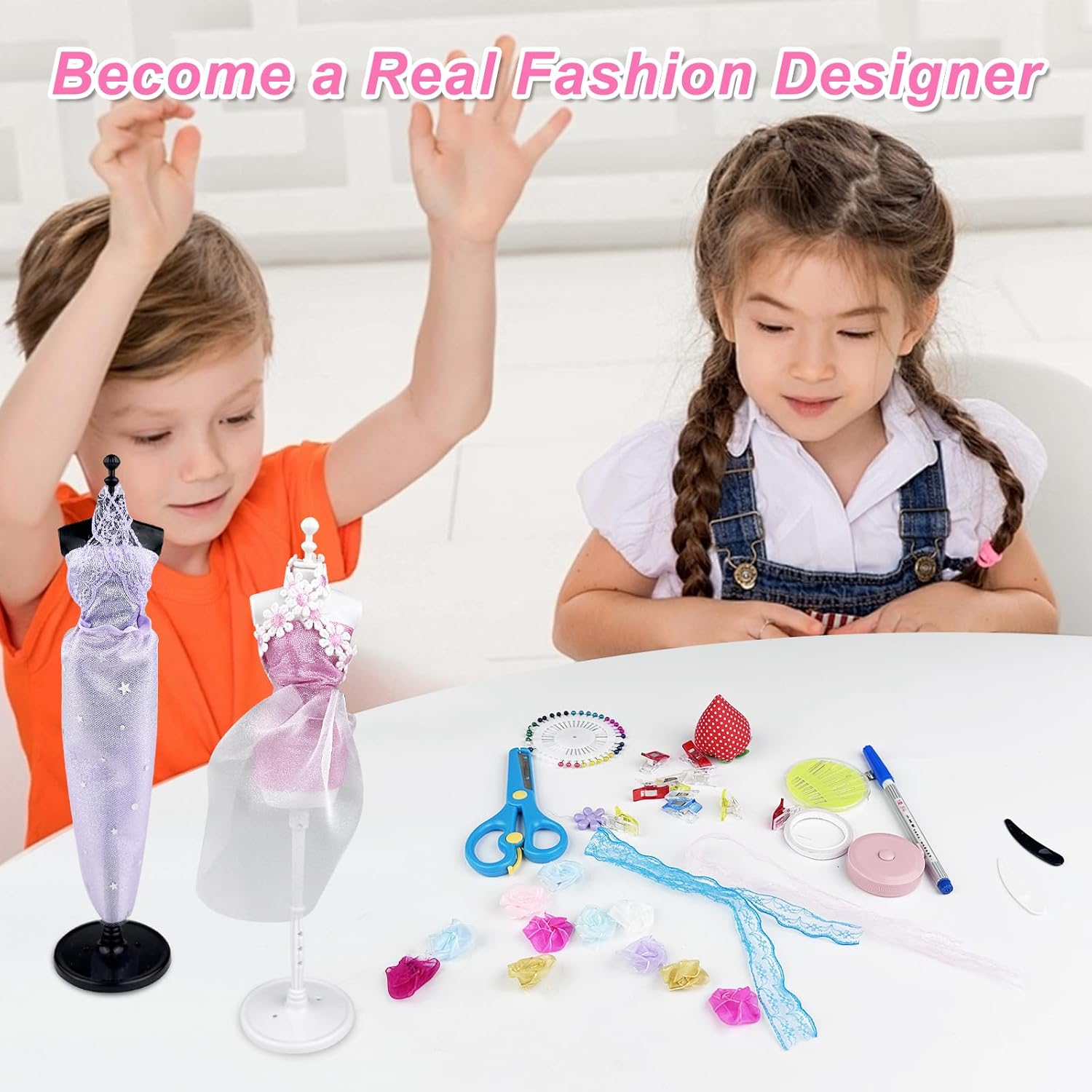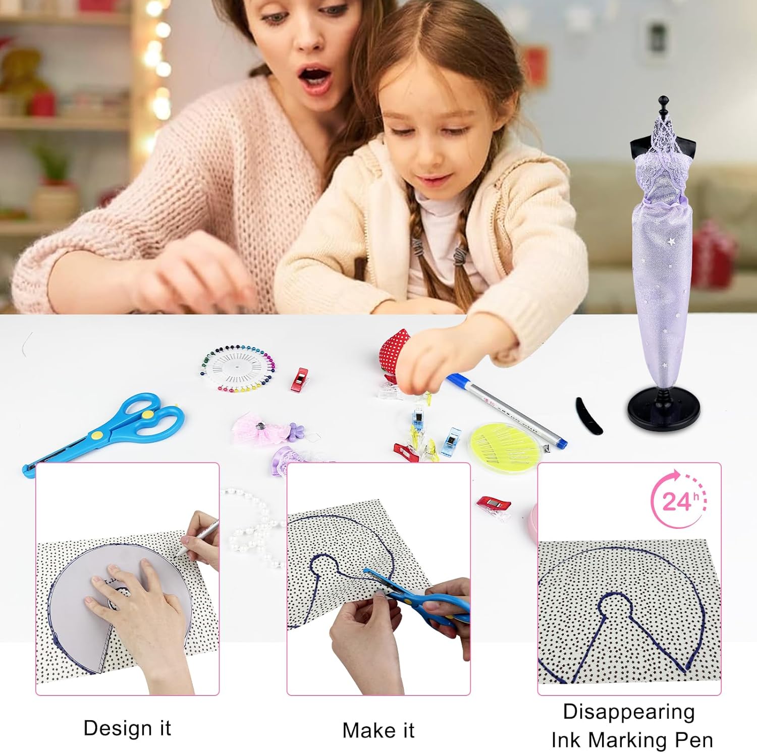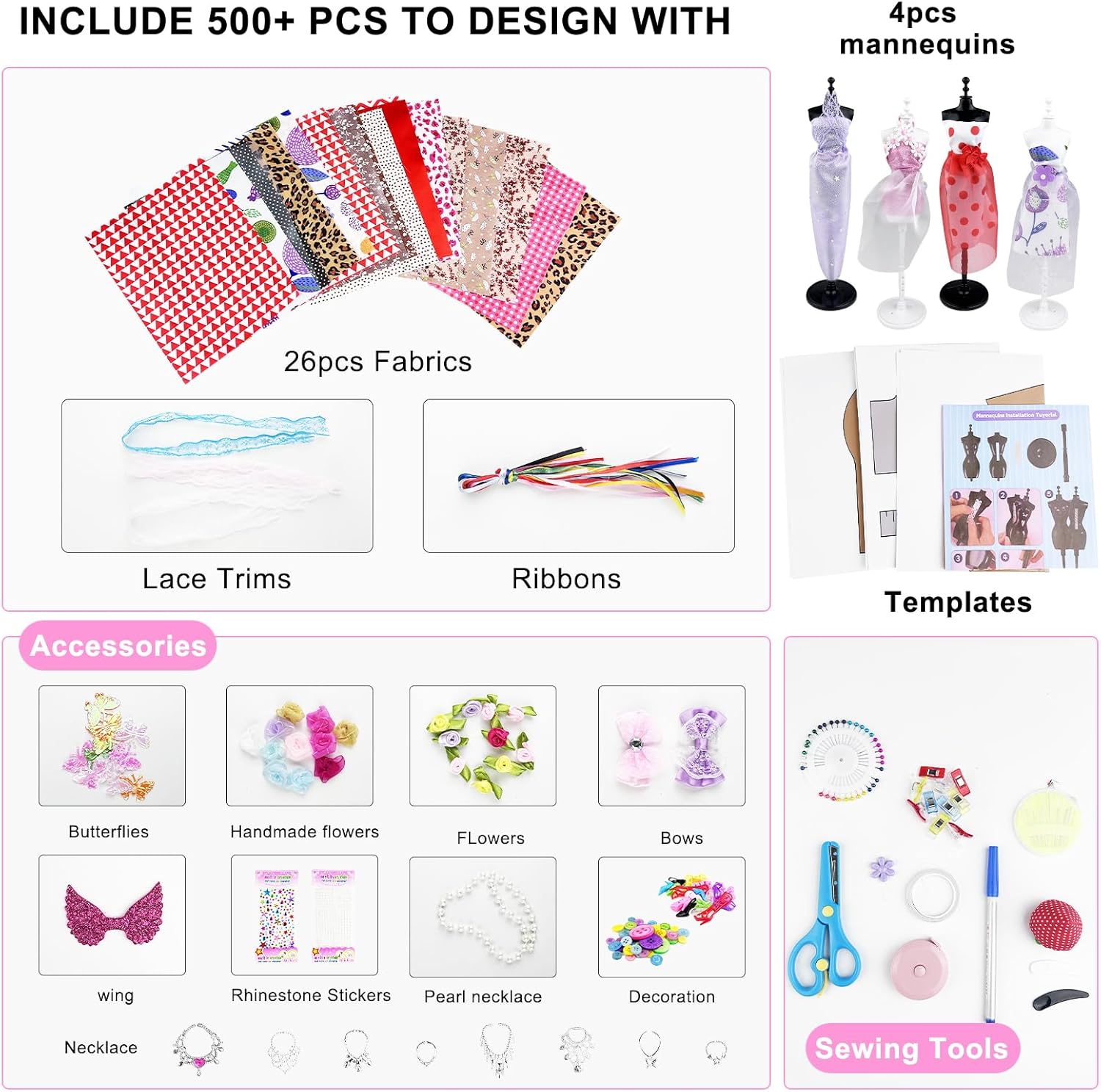 【Componenti Ricchi, Creatività Illimitata】Kit Cucito Bambini Contiene più di 500 componenti, tra cui 26 tipi di tessuti, nastri multipli, pizzi, ecc. I materiali ricchi ispirano la creatività e possono creare più di 70 diversi stili di abbigliamento, soddisfacendo l'immaginazione dei bambini di diversi stili di moda e liberando completamente i talenti artistici. 【Strumenti Professionali, Cucito per Bambini】 Kit di Design di Moda per Ragazze Dotato di strumenti necessari per cucire, come forbici, aghi e fili, penne a scomparsa, ecc. Progettato specificamente per i bambini, è sicuro e semplice da usare, aiutando i bambini a iniziare facilmente con le abilità di cucito e ad esercitare la loro abilità pratica e pazienza nella pratica. 【Vari Accessori, Squisiti Travestimenti】Fashion Designer Bambina Ha un gran numero di squisiti accessori, come collane, adesivi di strass, fiori e fiocchi. Aggiunge punti salienti al design dell'abbigliamento, può creare splendidi abiti da principessa o abiti alla moda personalizzati e migliora la raffinatezza e l'unicità del lavoro. 【Modello Umano, Design Ausiliario】Giochi Lavoretti Creativi Arte e Artigianato Contiene 4 modelli umani, che sono comodi per i bambini da progettare, tagliare e visualizzare su modelli tridimensionali. Simula il vero processo di progettazione dell'abbigliamento, cogli meglio le dimensioni e la forma e rendi la creazione più professionale. 【Istruttivo e Divertente, Interazione Genitore-Figlio】Non è solo una buona cosa per il fai da te creativo dei bambini, ma anche un ponte per l'interazione genitore-figlio. I genitori possono accompagnare i loro figli a creare, condividere la loro creatività e migliorare le loro emozioni. Allo stesso tempo, possono coltivare l'estetica, la concentrazione e le capacità di lavoro di squadra dei loro figli.