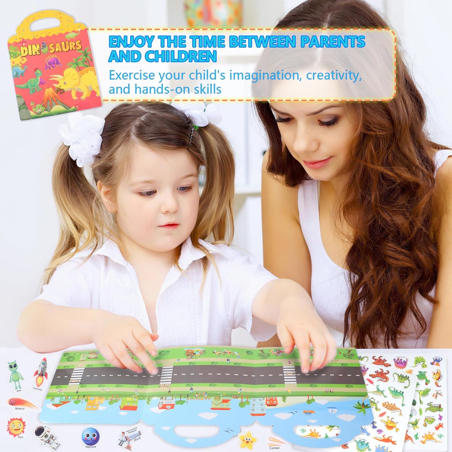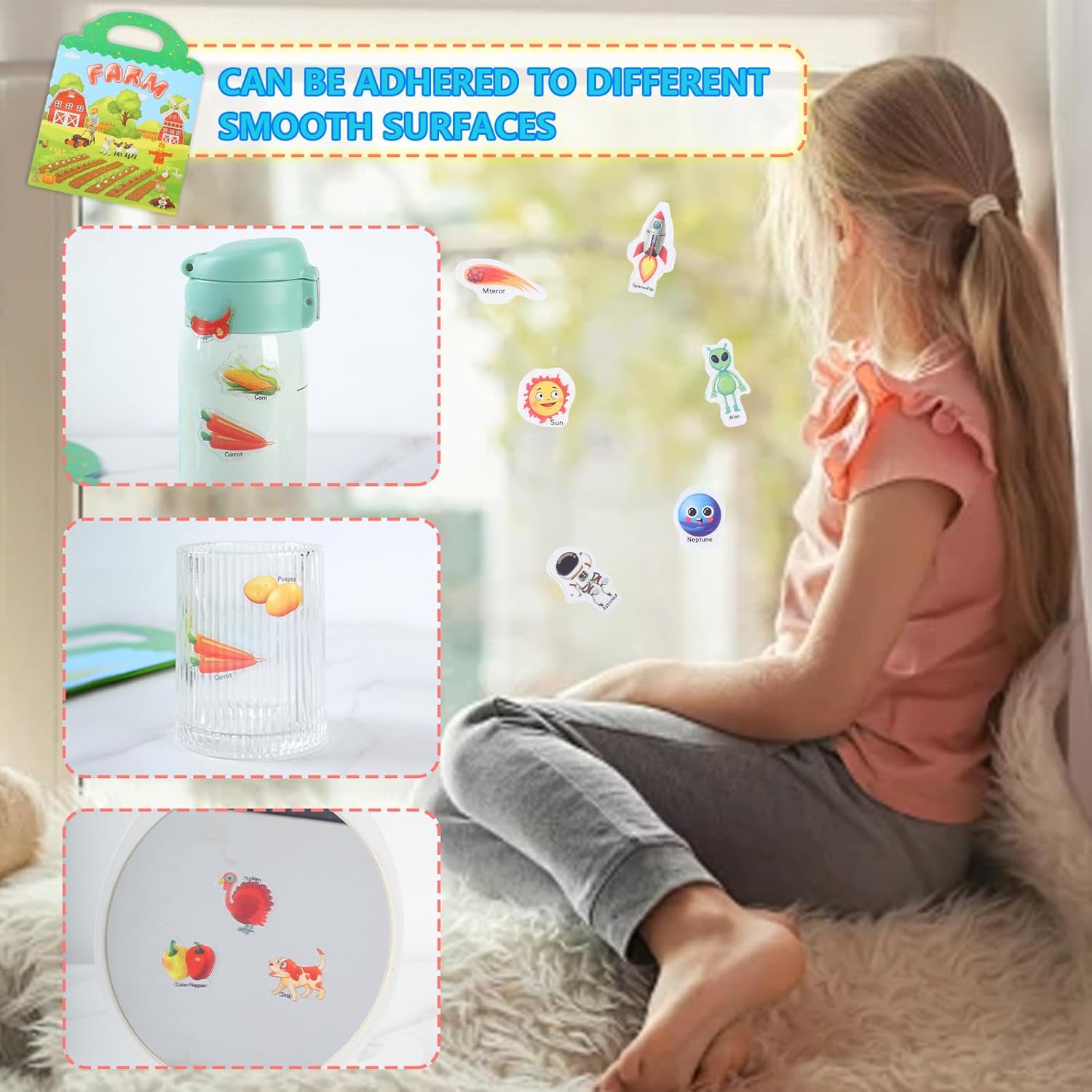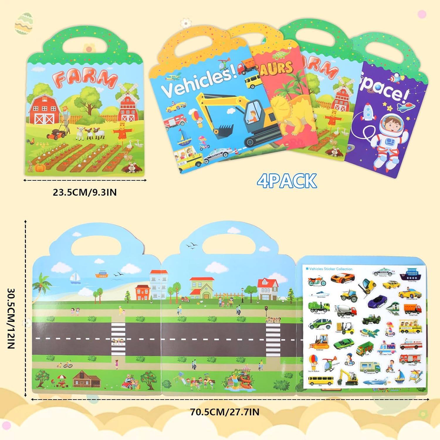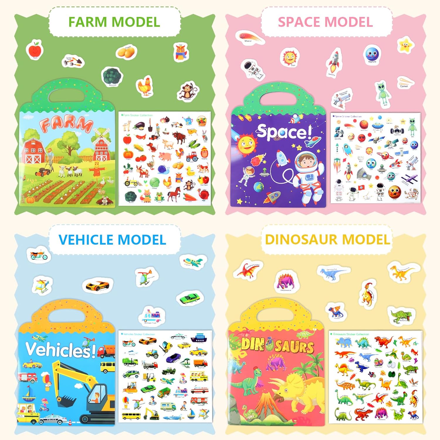 【4 adesivi per libri con temi diversi】 Questo set di adesivi riutilizzabili ha 4 temi di adesivi tra cui fattorie, dinosauri, trasporti e spazio, che stimolano la creatività e la capacità di apprendimento dei bambini e consentono ai bambini di imparare attraverso il gioco! 【Giocattoli educativi divertenti fai-da-te】Ogni adesivo sui nostri libri di adesivi ha un modello corrispondente, un nome, che consente ai bambini di creare storie diverse in modo divertente, il che aiuta a migliorare l'immaginazione, la creatività, l'abilità pratica e la percezione del colore dei bambini. 【Adesivi Riutilizzabili】I nostri adesivi per bambini sono realizzati in materiale PVC, durevoli, impermeabili, senza colla, gli adesivi possono essere strappati e utilizzati ancora e ancora, non perderanno la loro viscosità, non sbiadiranno o si romperanno, i bambini possono attaccarli non solo su libri di adesivi, ma anche su superfici lisce come finestre, vetro, tazze, specchi e così via felici giochi fai-da-te e calme emozioni dei bambini, perfetti per escursioni, viaggi su strada e asili nido. 【Il miglior regalo per i bambini】 I nostri libri di adesivi hanno 4 temi diversi con motivi vivaci e riutilizzabili, divertenti giocattoli educativi per intrattenere i bambini ma anche imparare cose nuove, regali ideali per bambini e ragazze per il compleanno, Halloween, Ringraziamento e Natale.