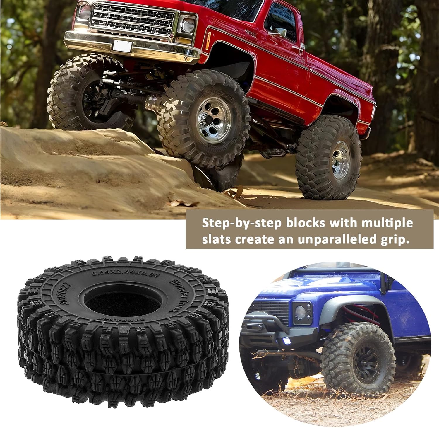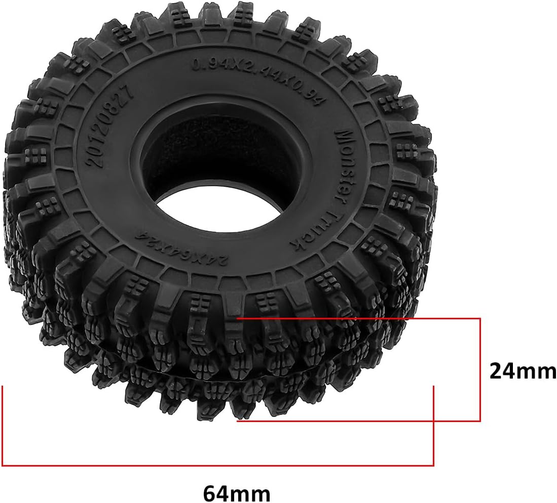 Diametro esterno: 64 mm, spessore: 24 mm, adatto per la maggior parte delle ruote beadlock da 2,5 cm. Materiali superiori: realizzato in schiuma e mescola S5 avanzata per una notevole morbidezza e proprietà adesive, superando la gomma convenzionale. Presa migliorata: il disegno unico del battistrada fornisce trazione e stabilità eccezionali su terreni accidentati, rendendo facile affrontare varie superfici. Adatto per vari terreni: ideale per l'uso su pavimentazione, superfici bagnate, condizioni asciutte, erba, sporco duro, superfici sciolte e molto altro ancora. Compatibilità versatile: compatibile con TRX4M, Upgrade Defender, Bronco, High Trail, K10, F150, SCX24, Gladiator, C10, JLU, Deadbolt, B17 e altro ancora.