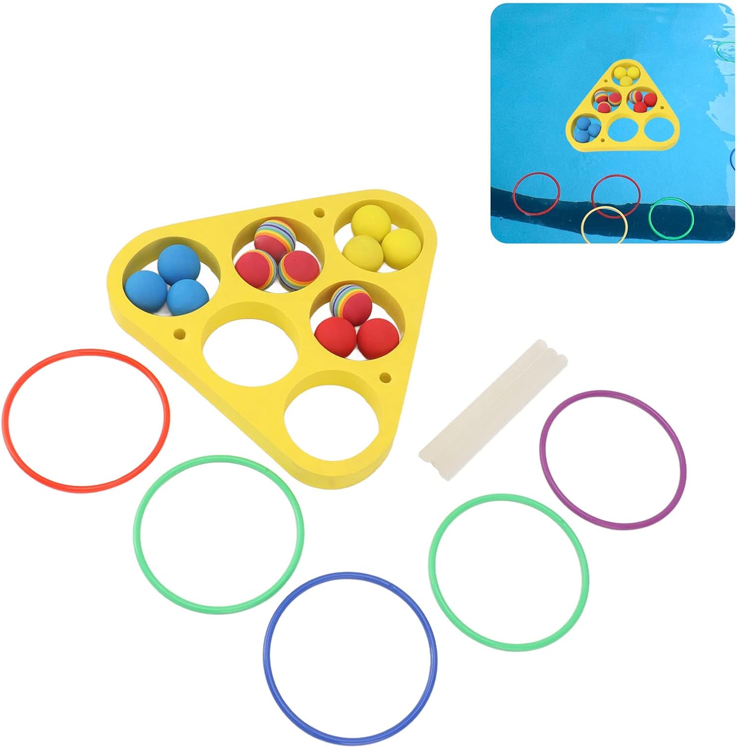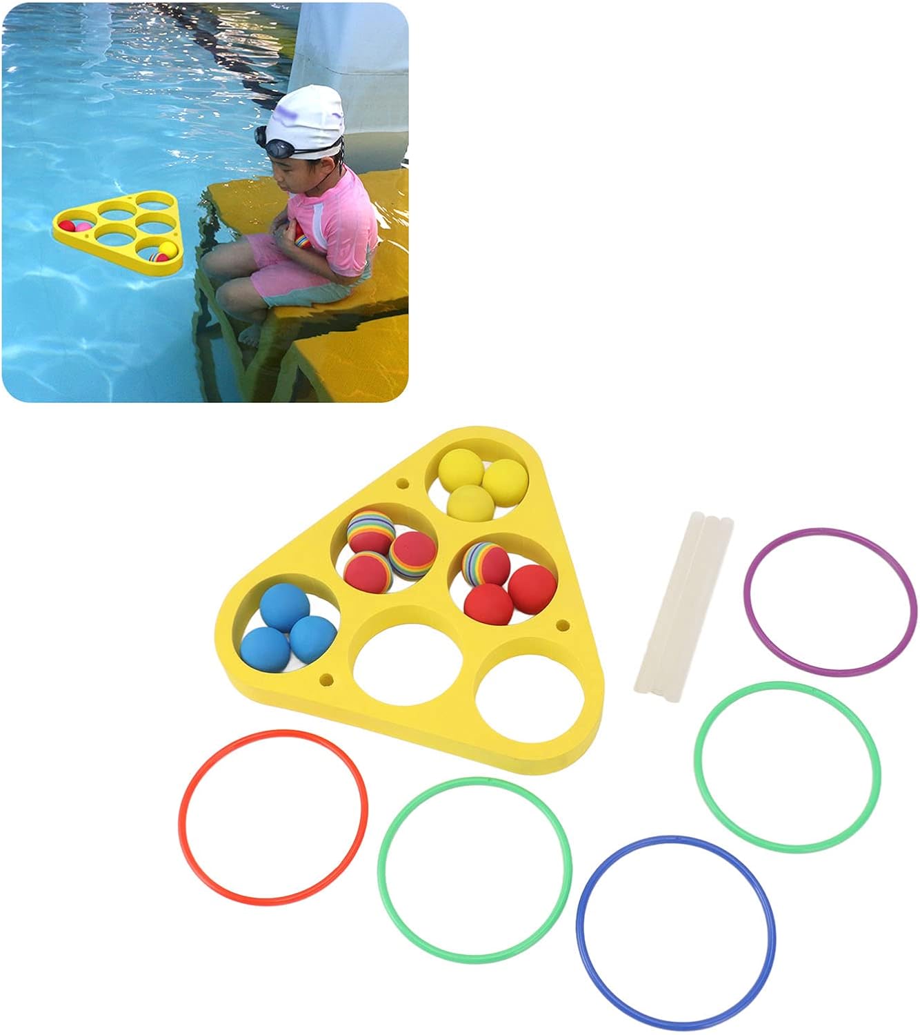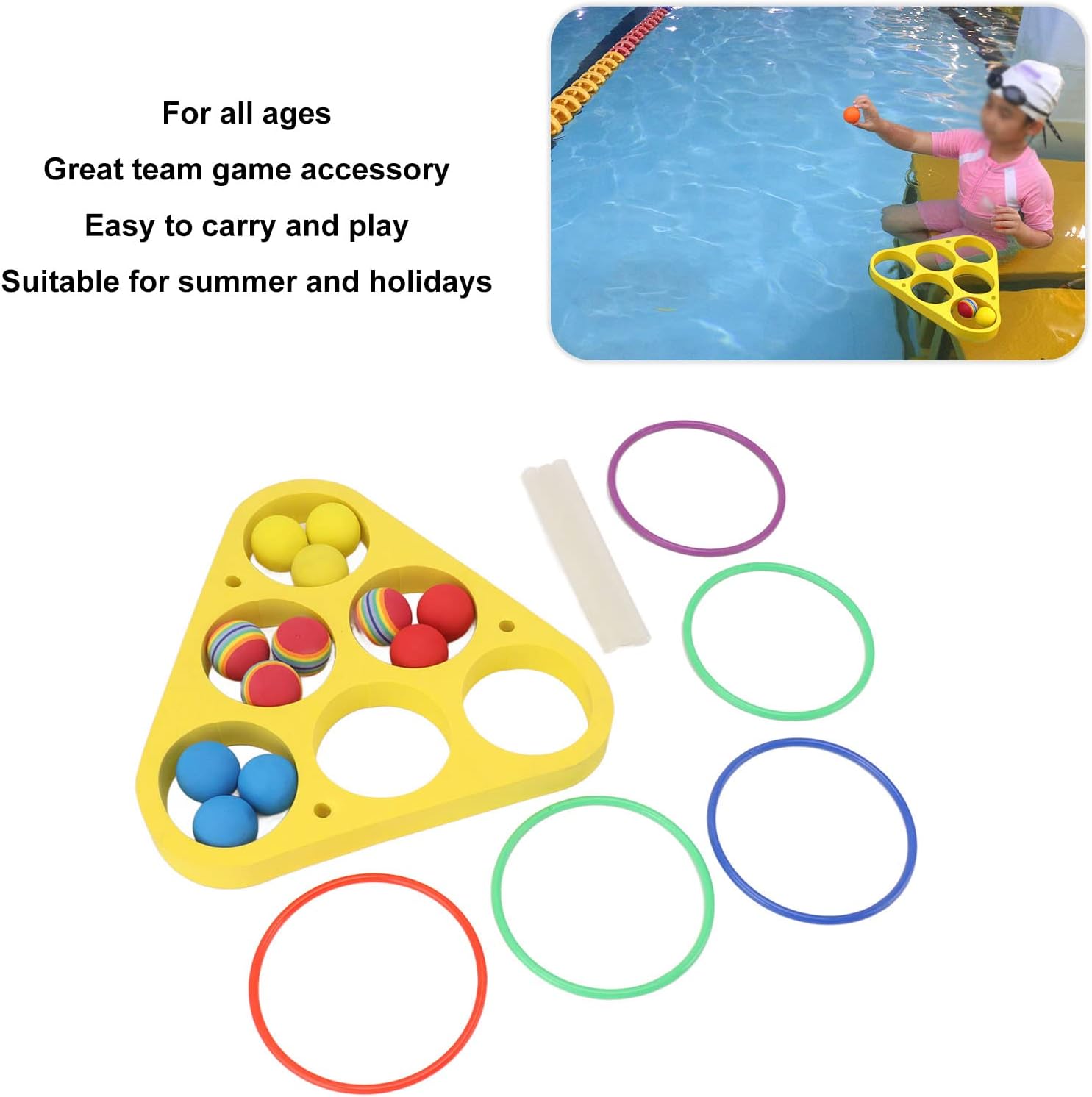 PORTATILE PER LE VACANZE: i giocattoli per sport acquatici della squadra hanno un imballaggio leggero e sono facili da trasportare, adatti per l'estate e le vacanze. Scopri più divertimento con i giocattoli estivi COMPAGNI DI PISCINA: i divertenti giochi di biliardo sono giochi giocattolo ideali per le piscine familiari. Questo set comprende 12 palline da lancio (colore casuale), 1 tavola da nuoto e 12 anelli da lancio (colore casuale), ed è un grande giocattolo galleggiante per piscine e feste in giardino PER TUTTE LE ETÀ: questo non è un gioco divertente per i bambini, ma è anche ideale per tutta la famiglia e un ottimo accessorio per giochi di squadra. Il design in schiuma triangolare o rotonda preilluminato lo rende facile da trasportare e da giocare ACCESSORI PER IL GIOCO IN PISCINA: Progettato con elementi di gioco di lancio, questo gioco galleggiante dispone anche di indicatori di punteggio per rendere il tuo gioco di festa in piscina più competitivo. Questo è un fantastico gioco di biliardo che incoraggia l'esercizio MATERIALE EVA DUREVOLE: la schiuma galleggiante in materiale EVA è abbastanza leggera da galleggiare e lanciare sull'acqua. Il materiale di grandi dimensioni mantiene i giocattoli da nuoto in piscina in buone condizioni e regala alla tua famiglia un divertimento senza fine