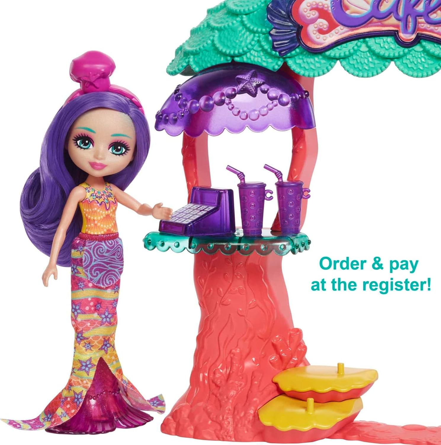 Fermati al Café Sous-Marin Enchantimals per una pausa incantevole! Con più di 15 elementi di gioco nel set, i più piccoli possono aiutare la bambola Martina Sirena (15 cm) a servire i suoi amici animali preferiti, il pesce Bubbler e la stella marina Tidy. Questa scatola misura 22 cm di altezza e comprende un angolo per preparare gli ordini, un bancone, sgabelli e un angolo per incassare i clienti. Accessori come ciotole, bevande, un vassoio a forma di conchiglia e un registratore di cassa stimoleranno la fantasia. Sorpresa: la pinna della bambola Martina Sirena si rimuove per rivelare i suoi piedi!