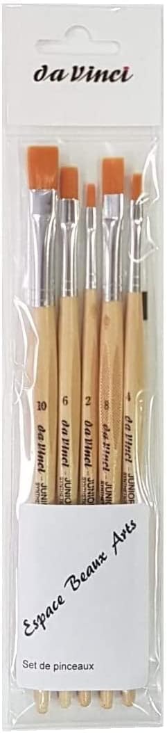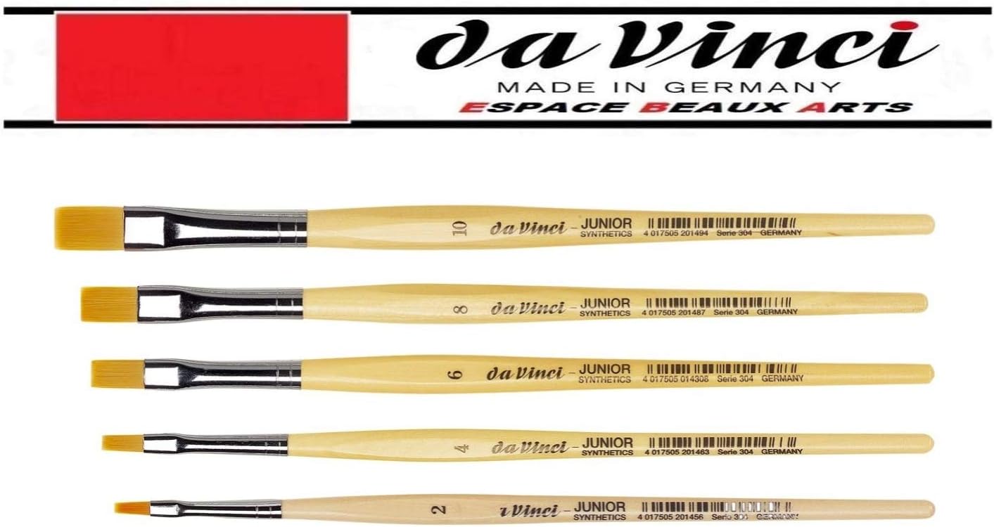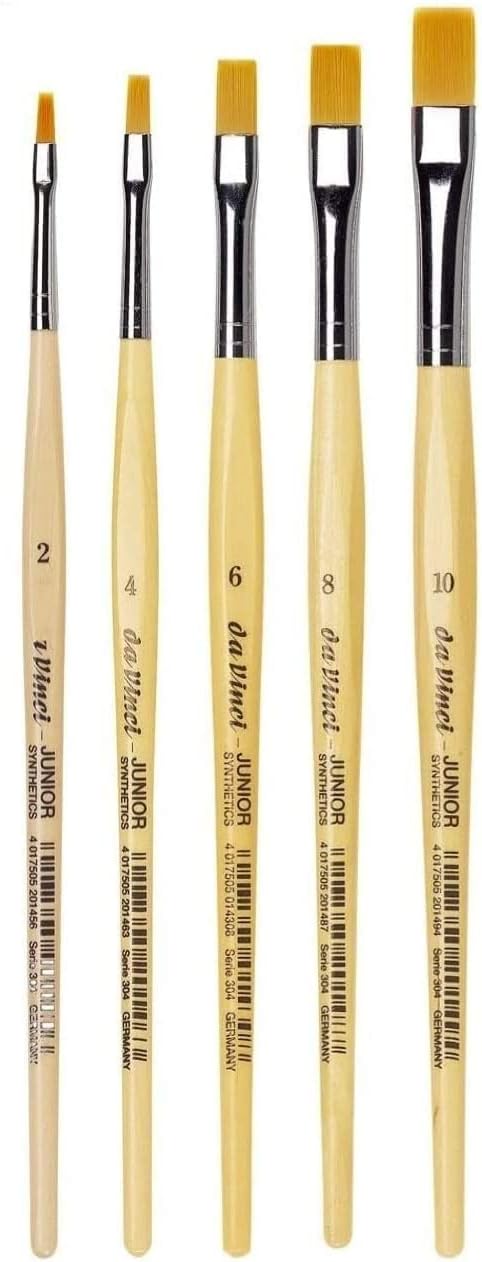 ennello Davinci GH304 Junior sintetico, serie piatta 304. Set 5 pezzi, 2, 4, 6, 8,10 Il pennello si trova bene nella mano attraverso la zona di presa ed è quindi adatto anche per dipingere con i numeri. È davvero divertente dipingere con lui.