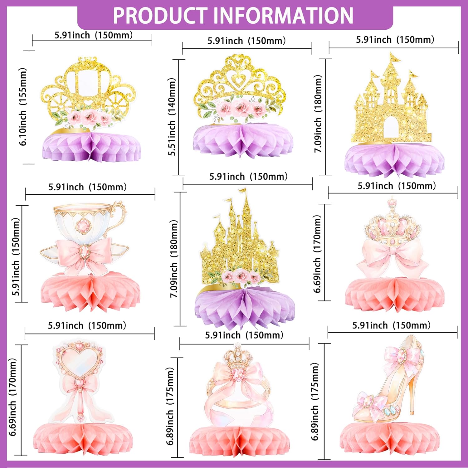 La confezione include: centrotavola a nido d'ape da 9 pezzi. Questi centrotavola floreali a nido d'ape sono molto belli e in quantità sufficiente per il tuo uso. Perfetto per la festa di compleanno a tema principessa Forniture per feste di compleanno a tema principessa: centrotavola floreali a nido d'ape da 9 pezzi sono perfetti per feste di compleanno a tema principessa, baby shower a tema principessa rosa, feste a tema matrimonio, decorazioni per feste a tema compleanno, renderanno la tua festa più attraente e la renderanno divertente, facendo innamorare i tuoi ospiti. 【Fai da te】 【Necessario】: i centrotavola floreali a nido d'ape possono essere messi sul tavolo. Questi centrotavola a nido d'ape per feste da principessa ti fanno risparmiare tempo e sono semplicissimi da usare. Puoi facilmente abbellire le tue feste, sì! Ma non fermarti qui, possono decorare la tua scrivania, comodino, tavolo da pranzo, tavolino da caffè, finestra, ecc. Inoltre non solo come decorazione da tavolo, ma anche come supporto per cabina fotografica. Qualità migliorata: questi toppers per cupcake principessa sono realizzati in cartoncino spesso 300 g di alta qualità. È sicuramente adatto per scrivania, comodino, tavolo da pranzo, tavolino da caffè, finestra, ecc. Toppers cupcake dall'ottimo rapporto qualità-prezzo, prendili semplicemente per decorare la tua festa di compleanno a tema principessa. La vostra soddisfazione è la nostra priorità. Sono solo a scopo decorativo, non sono commestibili e si prega di non utilizzarli nel forno o nel microonde.