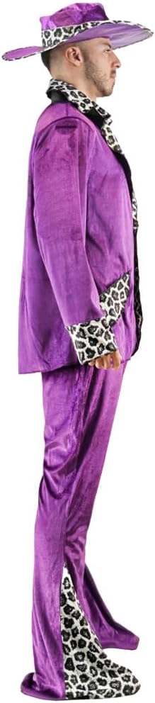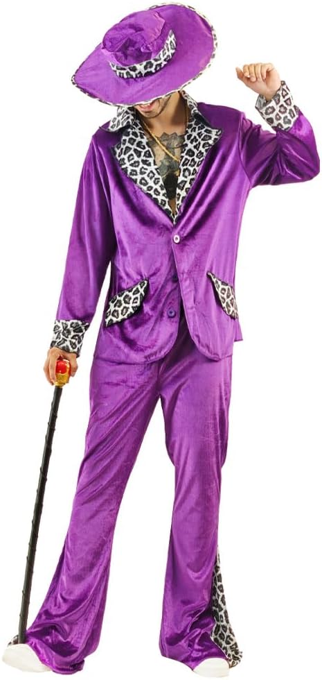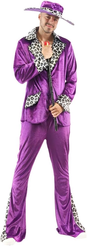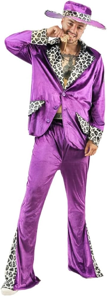 Fatti notare con questo spettacolare Costume da Pimp Viola per Uomo, perfetto per feste a tema anni ’70, Halloween, Carnevale, cosplay o serate a tema. L’outfit include una giacca viola e pantaloni coordinati in tessuto lucido, arricchiti da dettagli in stampa leopardata su colletto, polsini e tasche. Il grande cappello coordinato completano il look per un effetto scenografico assicurato. Leggero e comodo, ti permetterà di ballare e divertirti per tutta la notte.