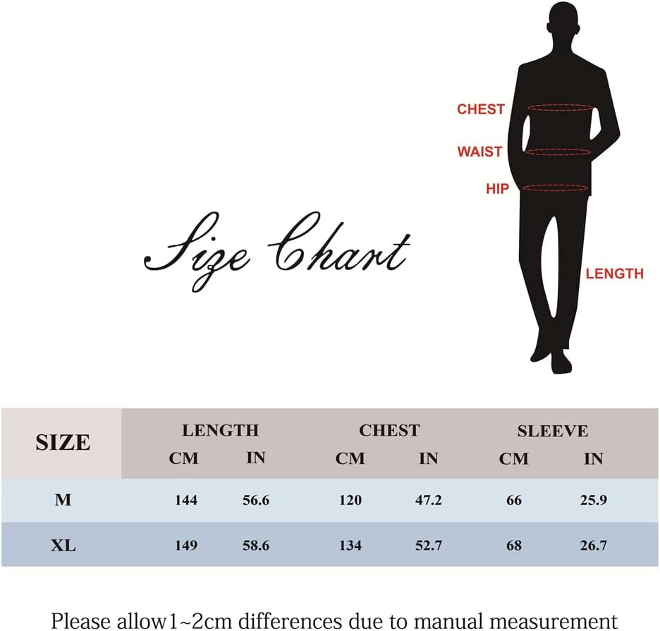 Tabella delle taglie M Lunghezza 59,8 pollici/152 cm, Petto 48 pollici/122 cm, Vita 55 pollici/140 cm L Lunghezza 61 pollici/155 cm, Petto 51,9 pollici/132 cm, Vita 59,8 pollici/152 cm XL Lunghezza 62,2 pollici/158 cm, Petto 55,9 pollici/142 cm, Vita 64,4 pollici/164 cm Servizio clienti Si prega di sentire liberi di contattarci per qualsiasi domanda prima dell'ordine e post-vendita. Ti offriremo sicuramente una soluzione soddisfacente entro 24 ore.