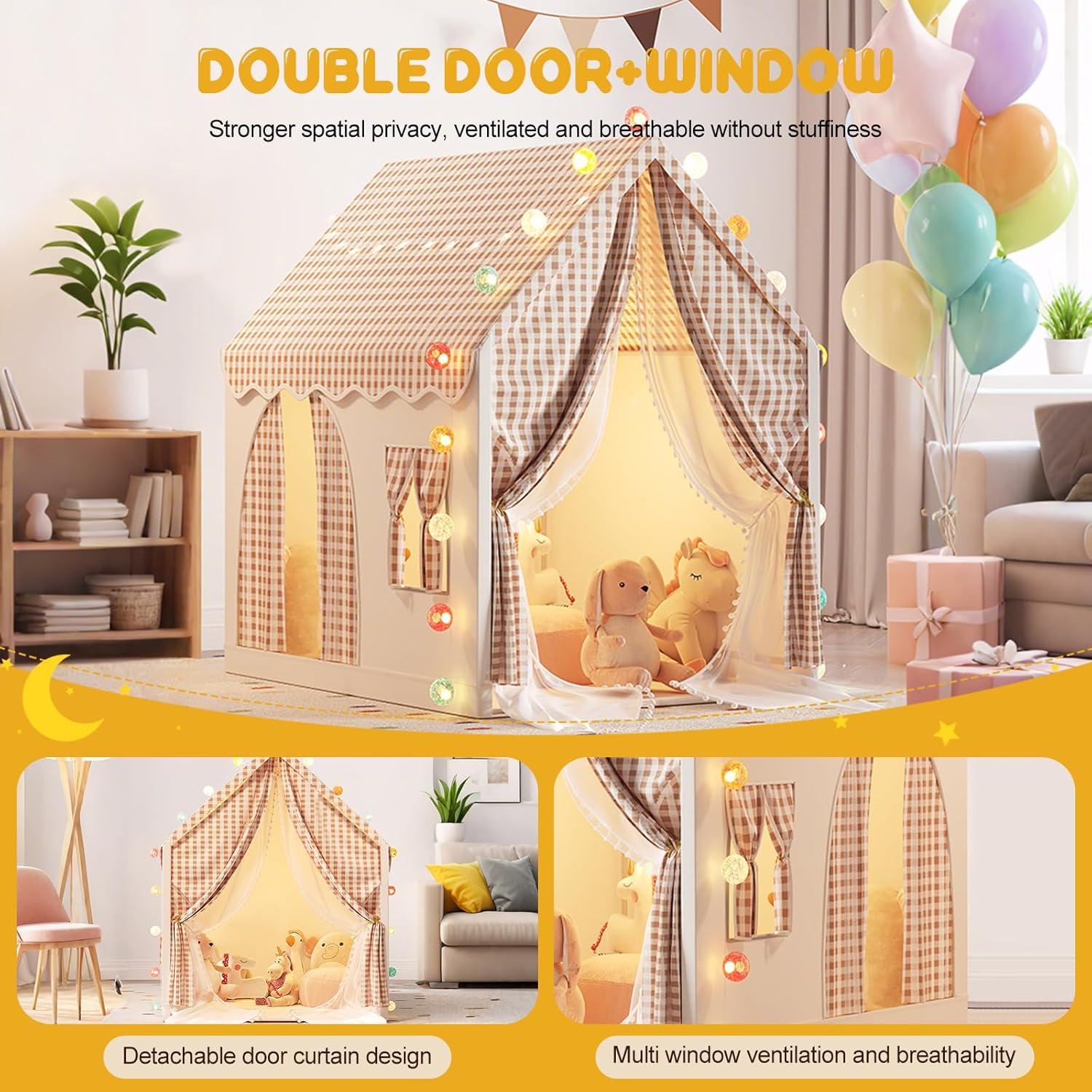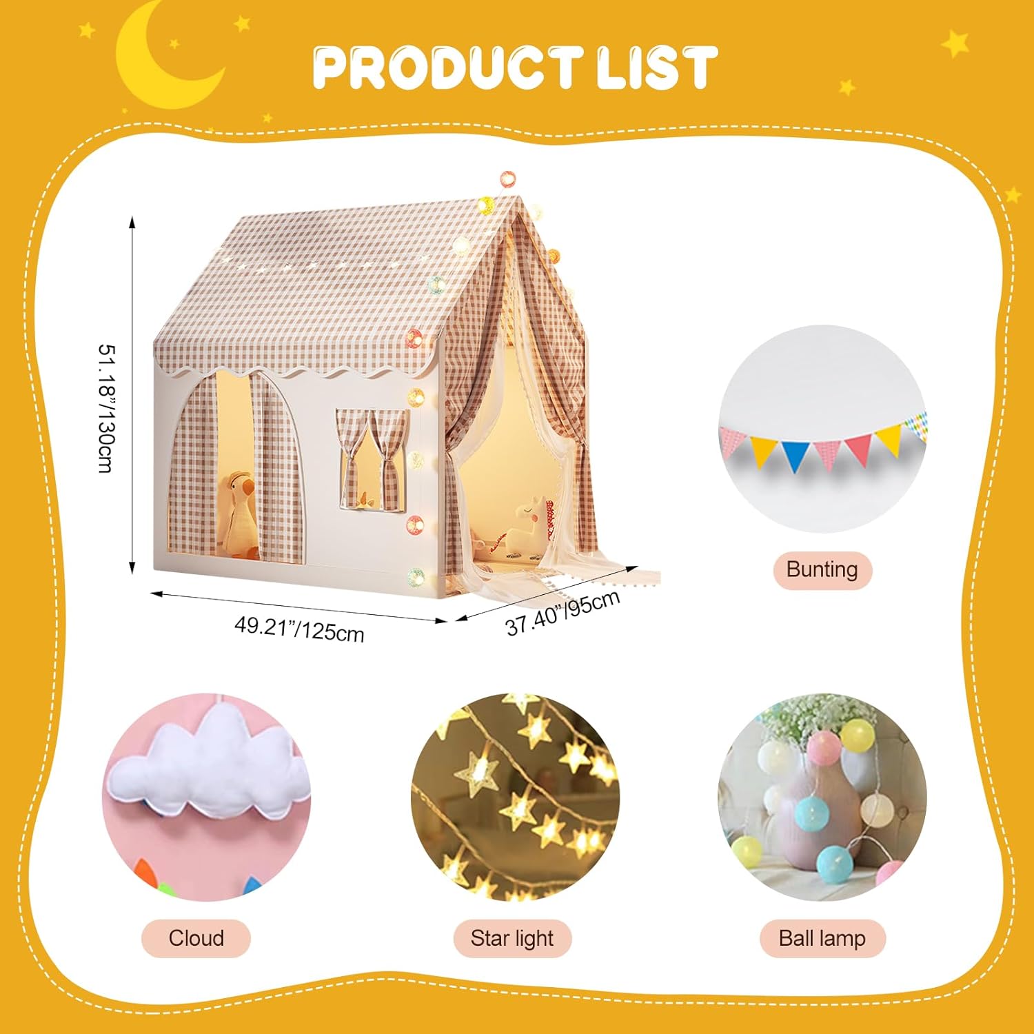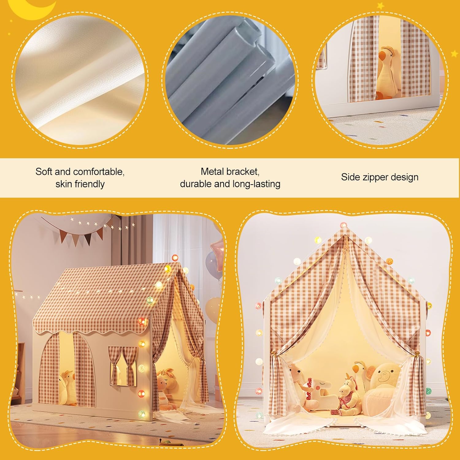 【Design resistente】Questa casa da gioco è progettata con una struttura in tondino di metallo, con doppie porte resistenti, ventilate e traspiranti, che possono essere aperte e chiuse, e la cerniera laterale è progettata per una facile installazione. 【Regalo interessante】I bambini possono leggere, giocare, fare acquisti e dormire per coltivare la propria indipendenza. Questa tenda per bambini è dotata di lampade a forma di stella, proprio come un castello delle fiabe che brilla di notte, e le scintillanti lampade a forma di stella creano un'atmosfera suggestiva. 【Materiali di alta qualità e sicuri】I nostri materiali sono realizzati con tessuti di alta qualità e delicati sulla pelle. Il tessuto della tenda della porta può essere smontato, facile da pulire a fondo e non si restringe. Può ospitare 3-4 amici, permettendo ai bambini di giocare felici. 【Facile da montare e trasportare】Questa tenda per bambini è facile da installare e può essere facilmente montata senza attrezzi. Per facilitare lo smontaggio e il rimontaggio, alleghiamo un manuale dettagliato che spiega passo dopo passo il funzionamento. 【Nostro servizio】Forniamo una risposta rapida 24 ore su 24 e un servizio clienti amichevole a vita. Se sei soddisfatto dei nostri prodotti, lascia un commento e un feedback, ti ringrazieremo per il