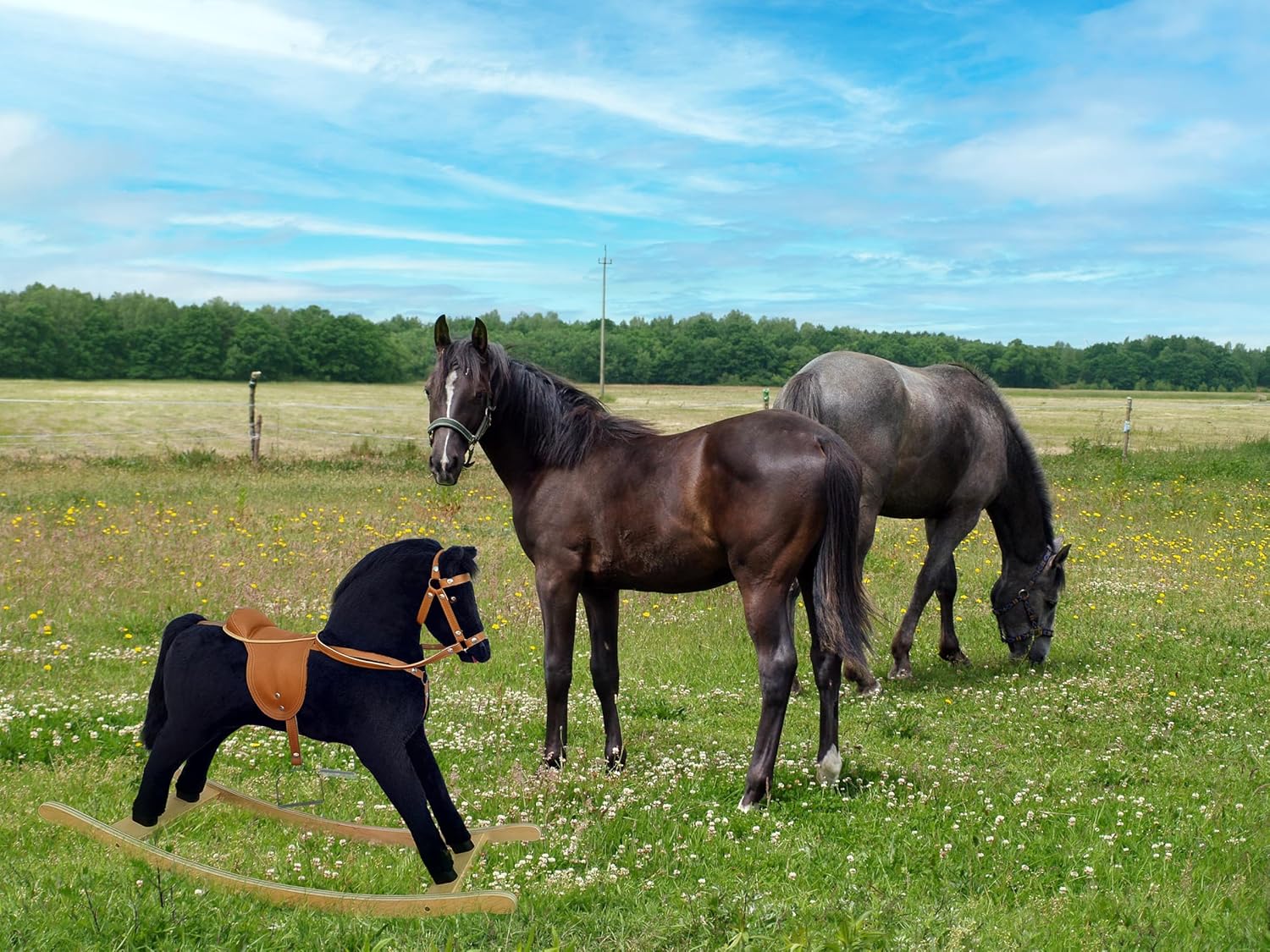 Grande cavallo a dondolo Morello, con briglia, sella e staffe adeguate per bambini da 3 anni. Dimensioni: Altezze: 80cm testa, 60cm sella, 106cm pattini. Peso sostenibile ca. 60/70kg I cavalli sono prodotti individualmente a mano, le tre tonalità di colore nero,baio e pezzato ricalcano il più fedelmente gli originali colori. Non adatto a bambini di età inferiore ai 36 mesi.