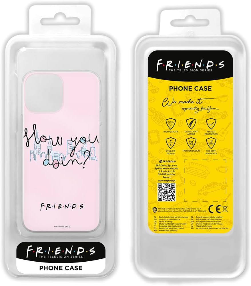 Custodia per smartphone originale e con licenza ufficiale. Confermato dai rappresentanti ufficiali della Friends. Il prodotto è concesso in licenza sotto il marchio Friends, pertanto le stampe sono al 100% originali. TPU flessibile: la custodia del cellulare è prodotta in poliuretano termoplastico (TPU), che assicura dettagli grafici colorati. Il guscio dello smartphone in TPU è caratterizzato da un'elevata elasticità e resistenza all'abrasione. Design unico: migliora l'aspetto del telefono ed enfatizza il tuo stile unico e la tua individualità proteggendo il tuo telefono. Protezione dello smartphone: la custodia per smartphone è dotata di bordi rialzati in poliuretano termoplastico (TPU) flessibile e di alta qualità, che assicura una perfetta aderenza al tuo telefono, e lo protegge ammortizzandolo in caso di caduta. Sicura e di alta qualità: la robusta custodia per smartphone è certificata REACH per ogni materiale utilizzato. Colpisce per la sua lavorazione accurata, con colori profondi e intensi, e per la sua linea pulita.