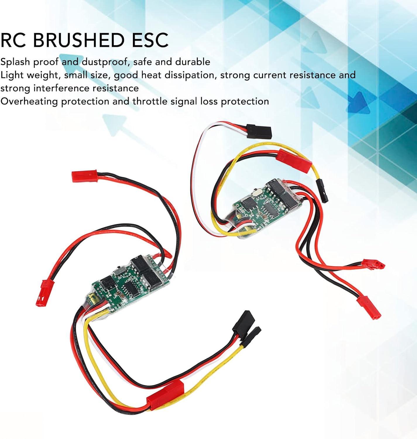 : RC ESC è realizzato con materiali plastici e componenti elettronici di alta qualità, di pregevole fattura, sicuri e affidabili, resistenti agli schizzi e alla polvere e durevoli. Forte capacità anti-interferenza: l'ESC a doppia via RC ha un modulo condensatore integrato leggero, di piccolo volume, buona dissipazione del calore, forte capacità anti-corrente e forte capacità anti-interferenza. Applicabile: è possibile regolare la rotazione differenziale di 2 motori o controllare rispettivamente la rotazione avanti e indietro di 2 motori. In modalità di controllo misto, è possibile realizzare imbarcazioni con differenziale a doppio motore, autocarri con cassone ribaltabile, camion cingolati, ecc. Protezione dal surriscaldamento: l'ESC RC è dotato di molteplici protezioni dal surriscaldamento. Quando la temperatura di regolazione elettrica supera i 130 gradi Celsius, l'ESC ridurrà gradualmente la potenza in uscita. Protezione dalla perdita dell'acceleratore: l'ESC con spazzole RC ridurrà gradualmente la potenza in uscita se l'acceleratore viene perso per 1 secondo e la potenza verrà interrotta se l'acceleratore viene perso per 1 secondo.