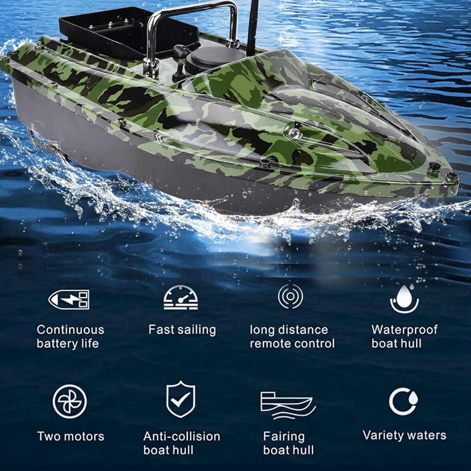 Migliora la tua esperienza di pesca con una barca da pesca intelligente con telecomando GPS, con ritorno automatico a casa e luci notturne per avventure di pesca notturne perfette. Goditi il rilascio dell'esca senza sforzo con un grande silo indipendente in grado di caricare fino a 1,5 kg, telecomando impermeabile e correzione automatica dell'imbardata per una facile navigazione adatto a tutti i pescatori. Approfitta del posizionamento GPS avanzato con cruise control, un raggio di controllo remoto di 500 metri e funzioni di ritorno automatico per batteria scarica o superamento dei limiti di distanza che garantiscono sicurezza e convenienza. Naviga con facilità durante la pesca notturna grazie alle luci di navigazione notturne progettate per l'identificazione della direzione e l'attrazione dei pesci, oltre a uno schermo LCD impermeabile che mostra informazioni vitali come distanza e carica della batteria. Sperimenta lunghe sessioni di pesca con 2 batterie rimovibili di grande capacità da 7,4 V 12000 mAh che offrono 3-4 ore di utilizzo per carica, doppi motori per gestire onde di livello 5-6 e la possibilità di acquistare batterie aggiuntive.
