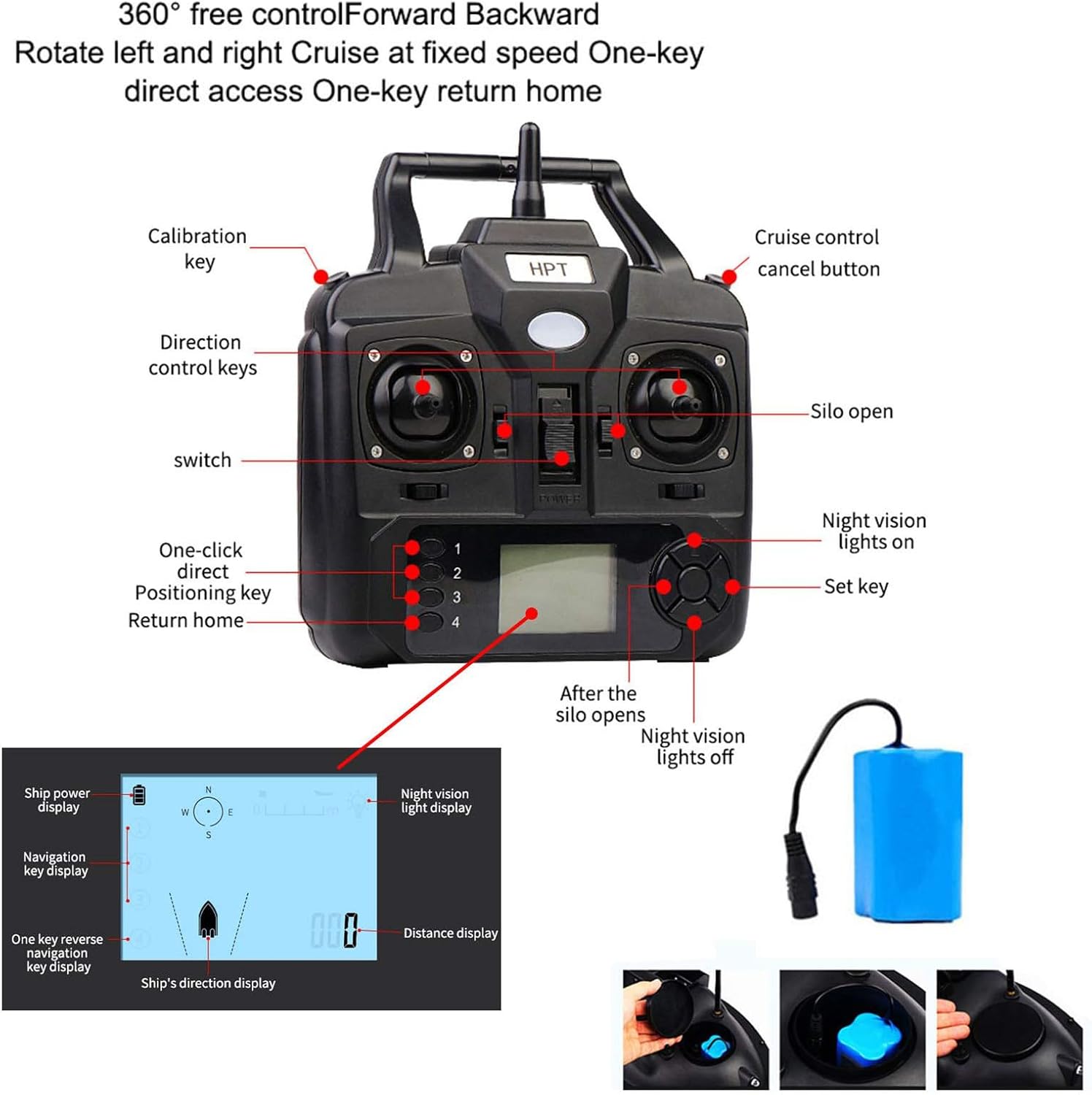 Nuovo design della loro esca da pesca a tre gabbie, ricezione del segnale forte a lunga distanza, vegetazione e forte design del motore a doppio motore, design della copertura, può prevenire efficacemente le interferenze dell'elica, funzione singola: crociera/imbardata calibrazione automatica, distanza remota: 400-500 m senza interferenze, chiaro ca. Tre disegni di rivista di esche da pesca possono essere controllati in modo indipendente per ottenere una fusione più precisa dell'esca. Il guscio è realizzato in materiali di ingegneria ABS. Ha un'eccellente resistenza agli urti e all'abrasione, facile da indossare ed è sigillato, sicuro, protezione della batteria, design a guscio anti-collisione. L'Intelligent Fish Bait Boat è dotata di una batteria al litio di grande capacità, che può durare per 2 ore, consentendo di utilizzarlo per un lungo periodo all'aperto e la barca sarà entro 15 secondi quando la batteria è scarica, torna automaticamente all'origine impostata. Visualizzazione dell'alimentazione, visualizzazione della distanza, visualizzazione della posizione, visualizzazione della luce notturna e visualizzazione della direLo schermo LCD del telecomando visualizzerà il motore, la bussola e le auto a vela della barca. Servizio: Se avete domande su questo prodotto, non esitate a contattarci, vi risponderemo entro 24 ore!